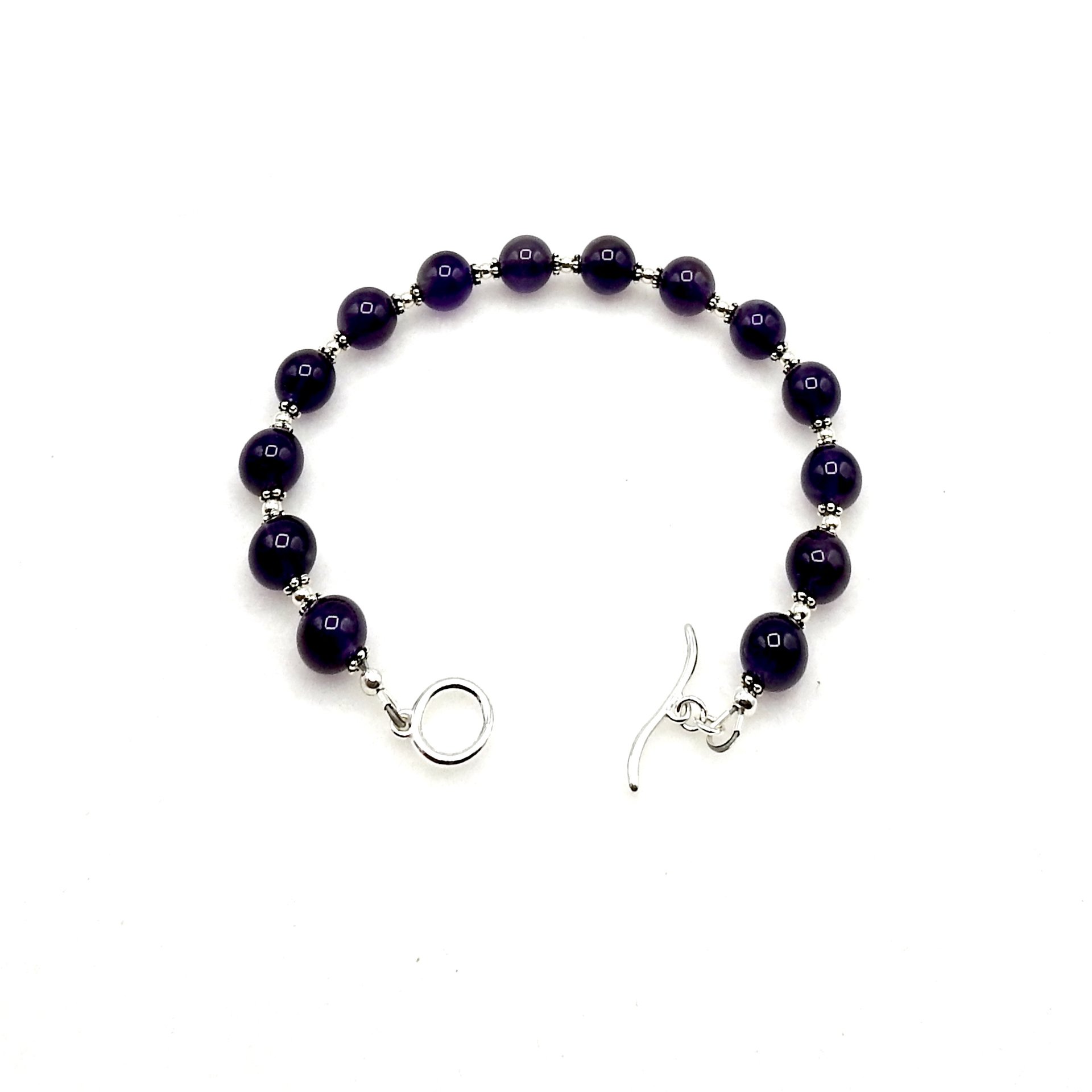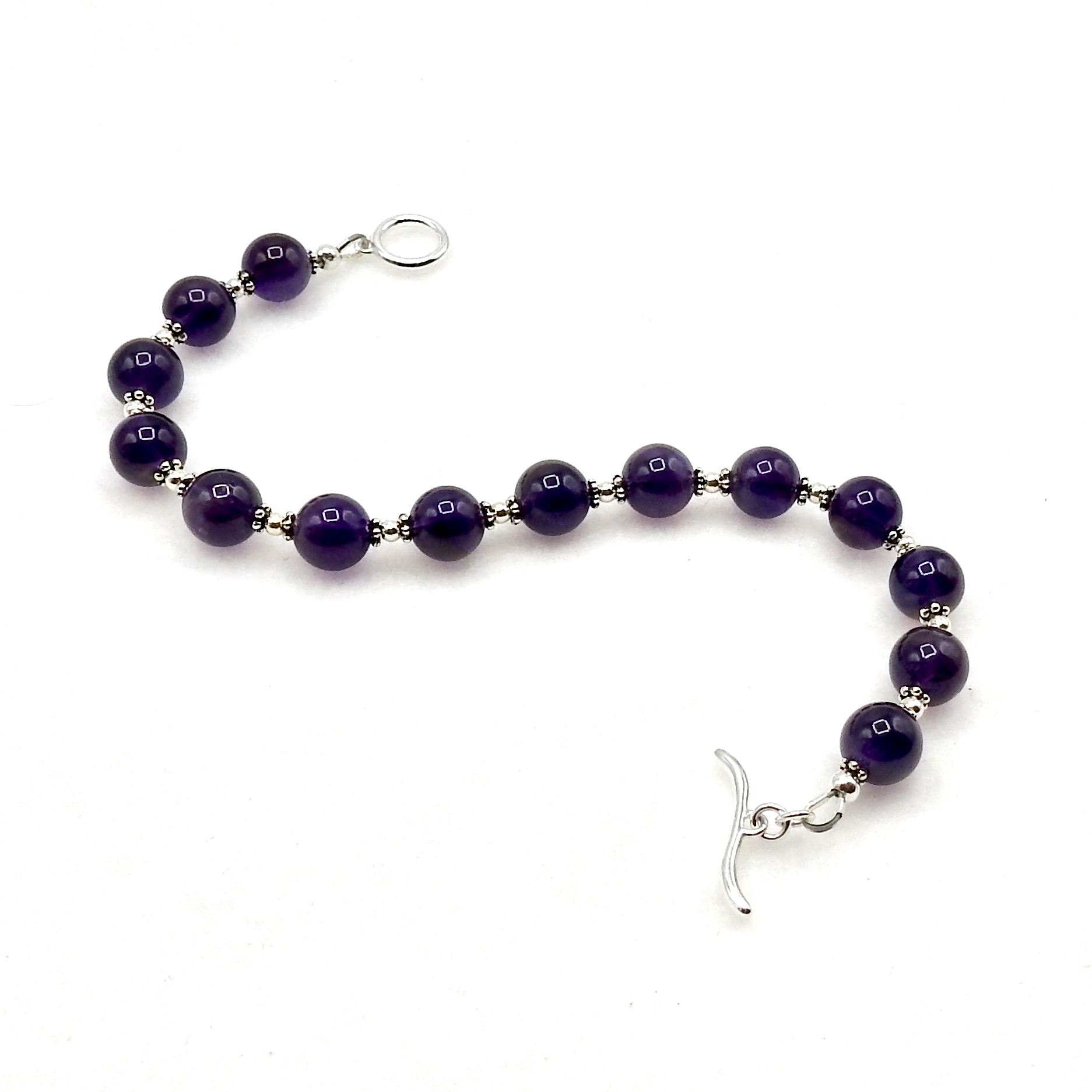 A delicate style dark purple bracelet, handcrafted with round amethyst gemstone beads and a sterling silver curved design toggle clasp.