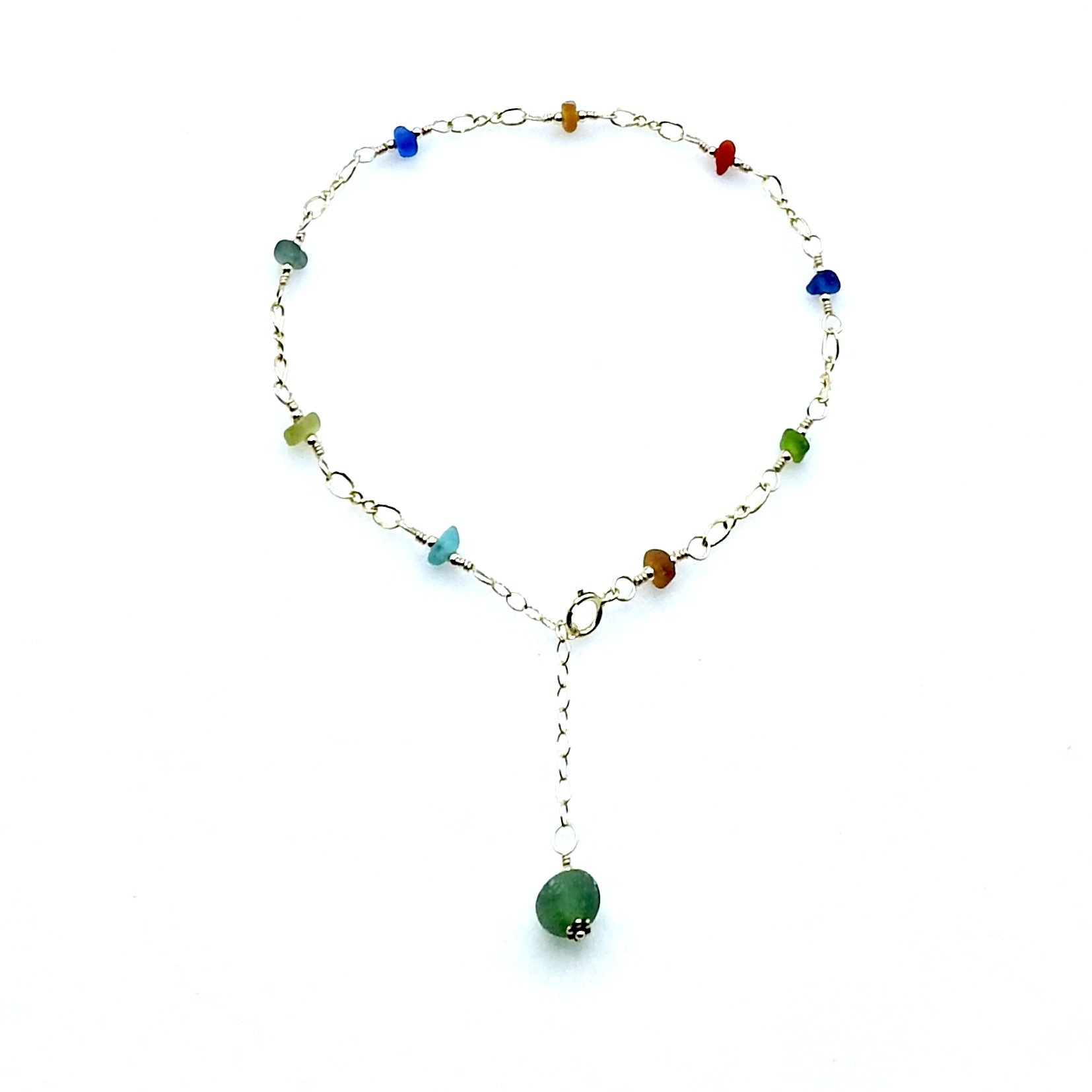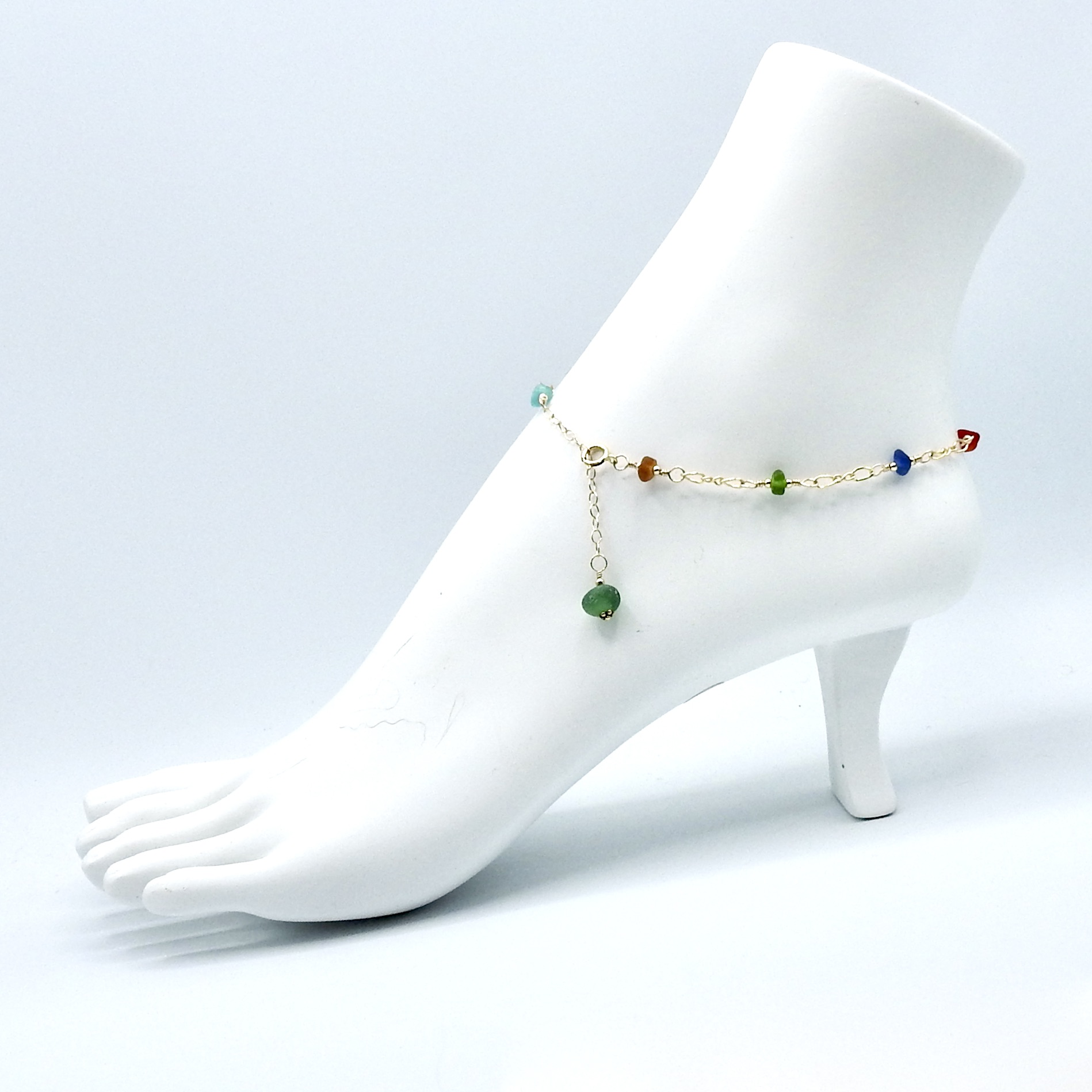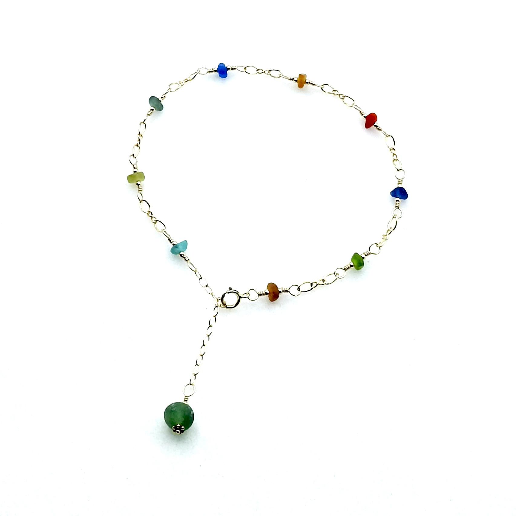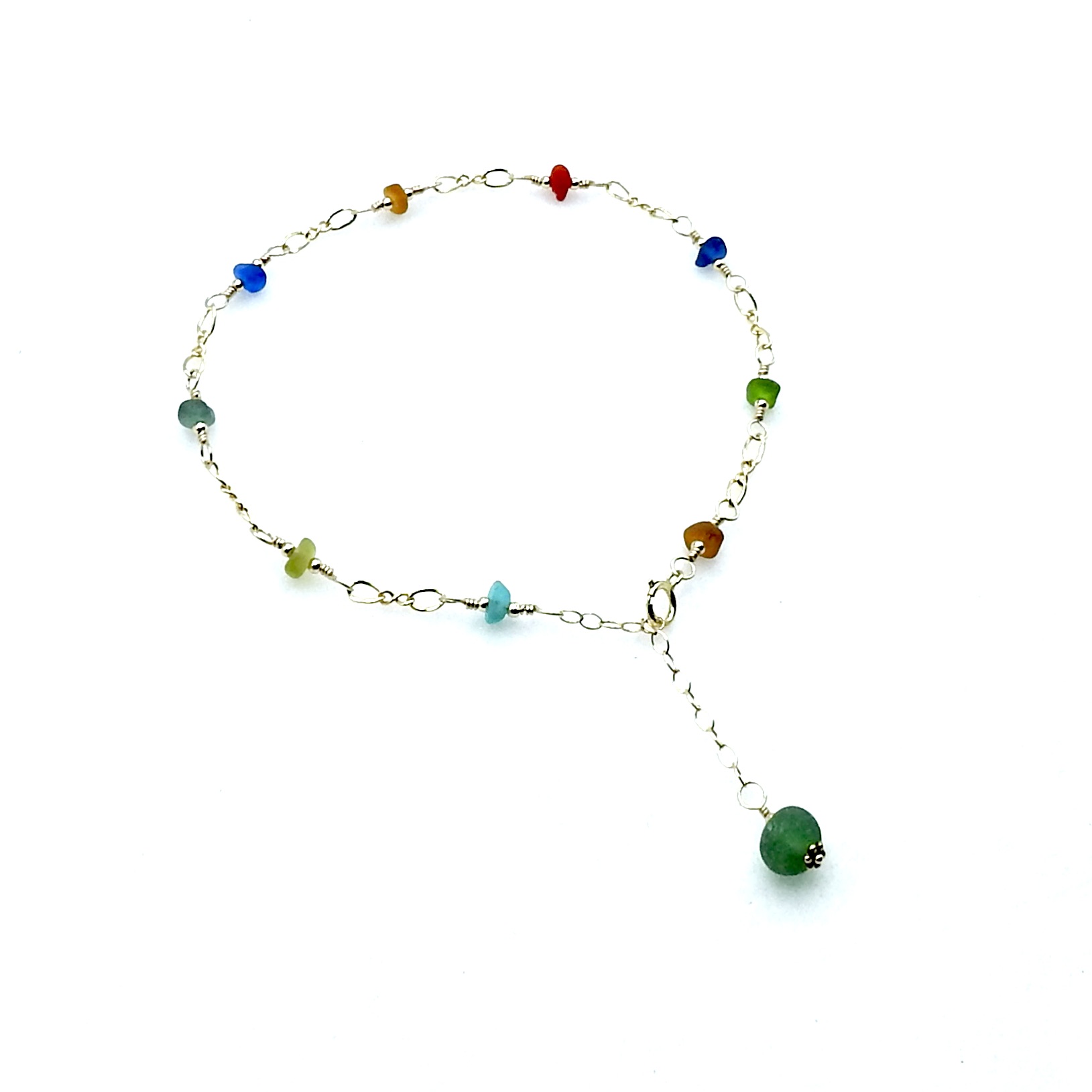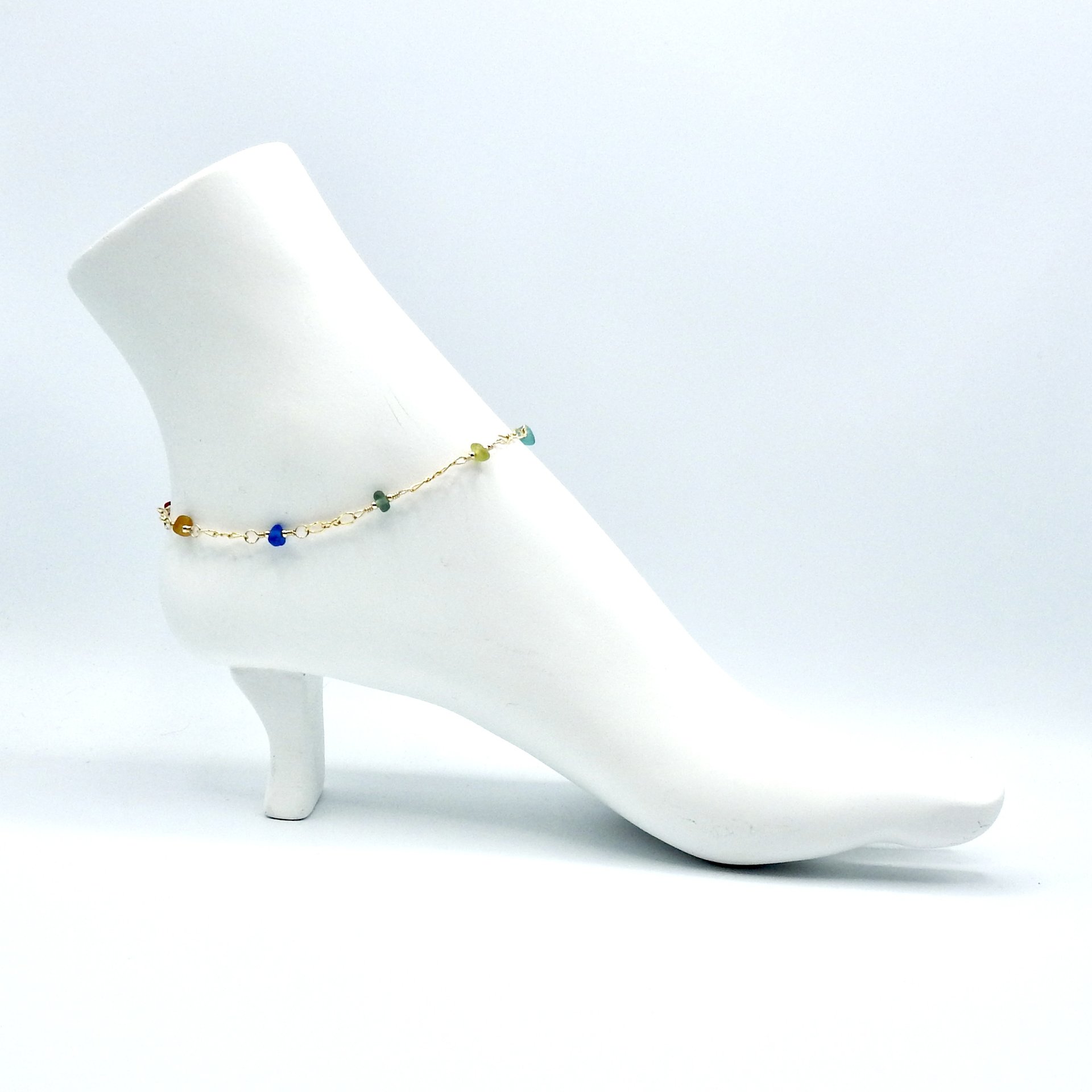 An adjustable gold chain ankle bracelet, handmade with tiny genuine sea glass pieces in a mix of colours, some rare.