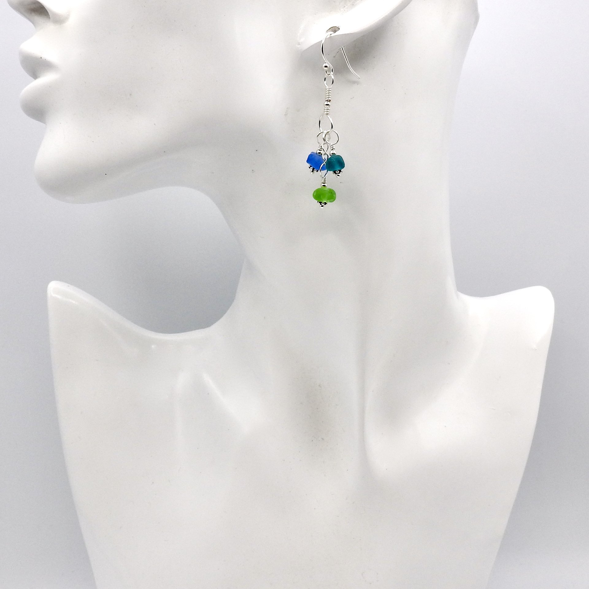 Colourful dangle drop earrings, handmade with genuine sea glass in shades of cornflower blue, teal and green with pierced ear wires.