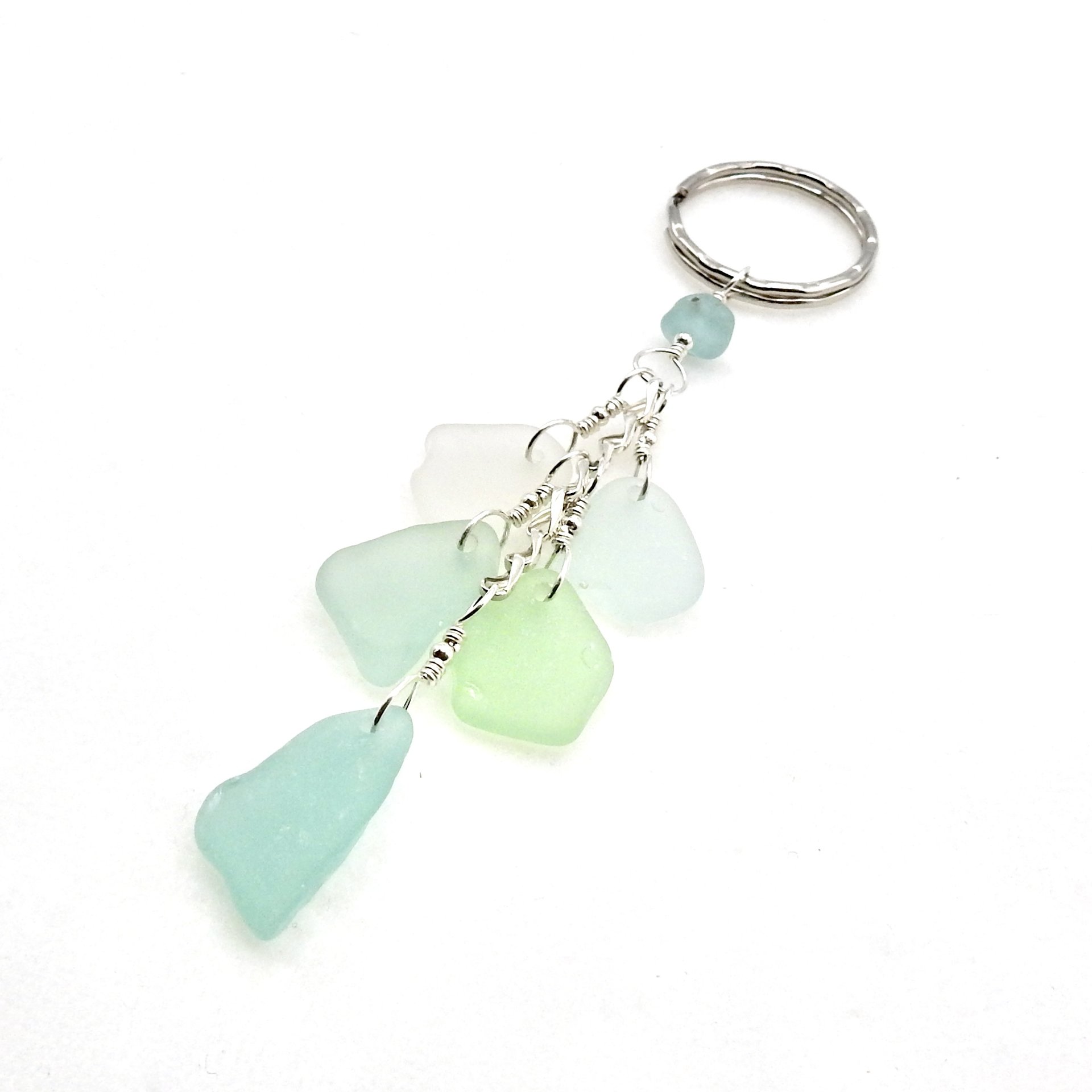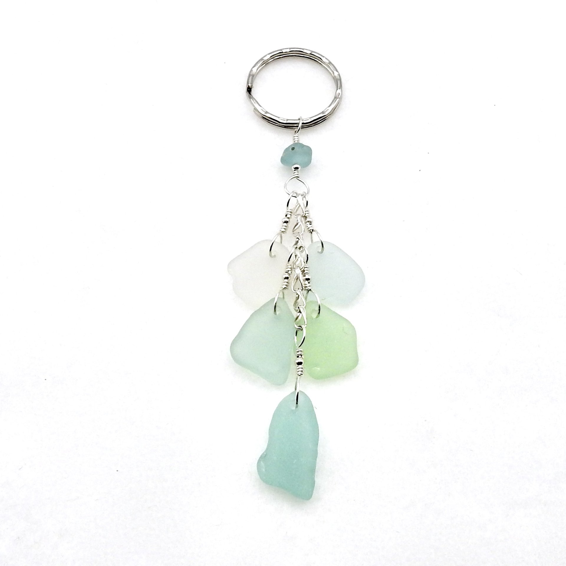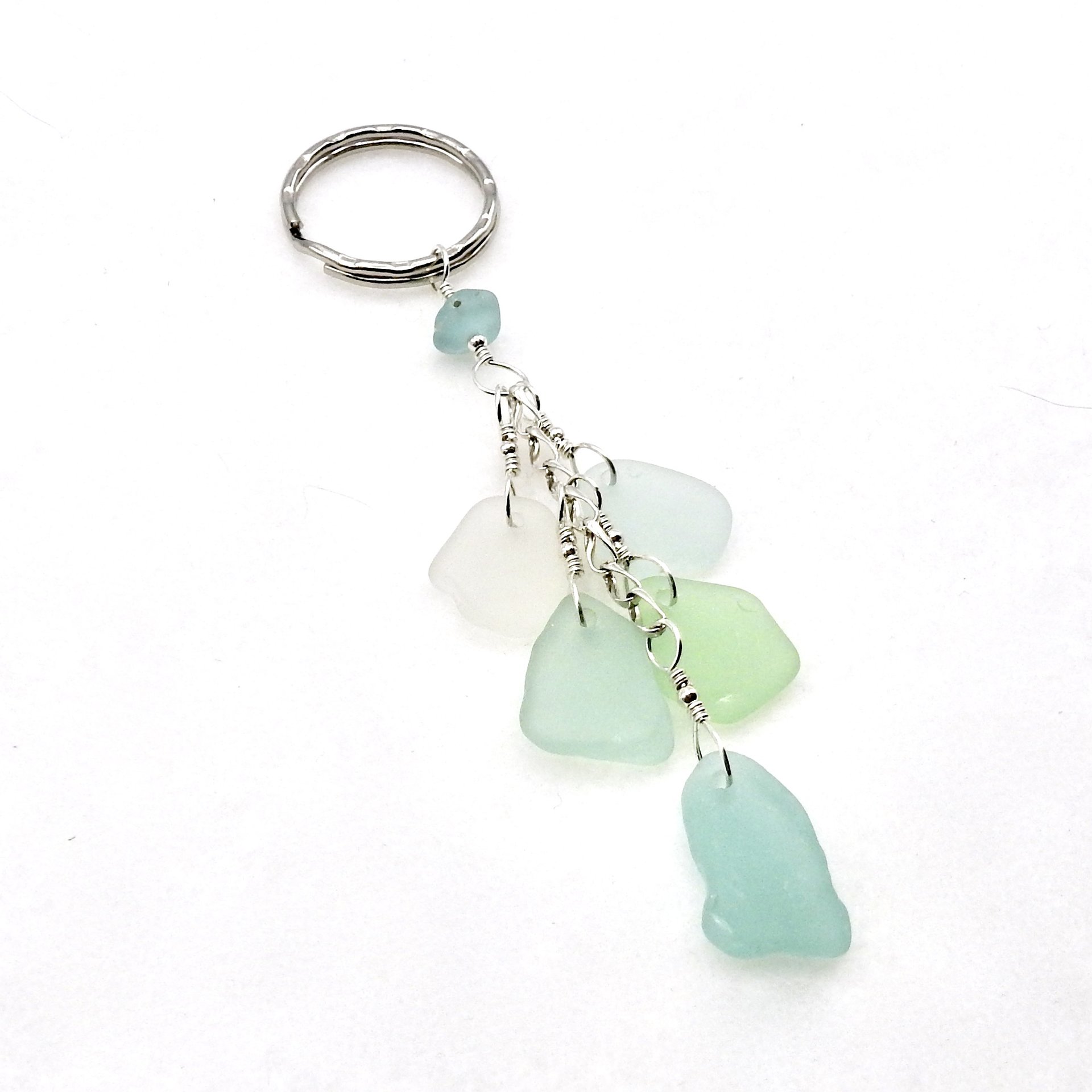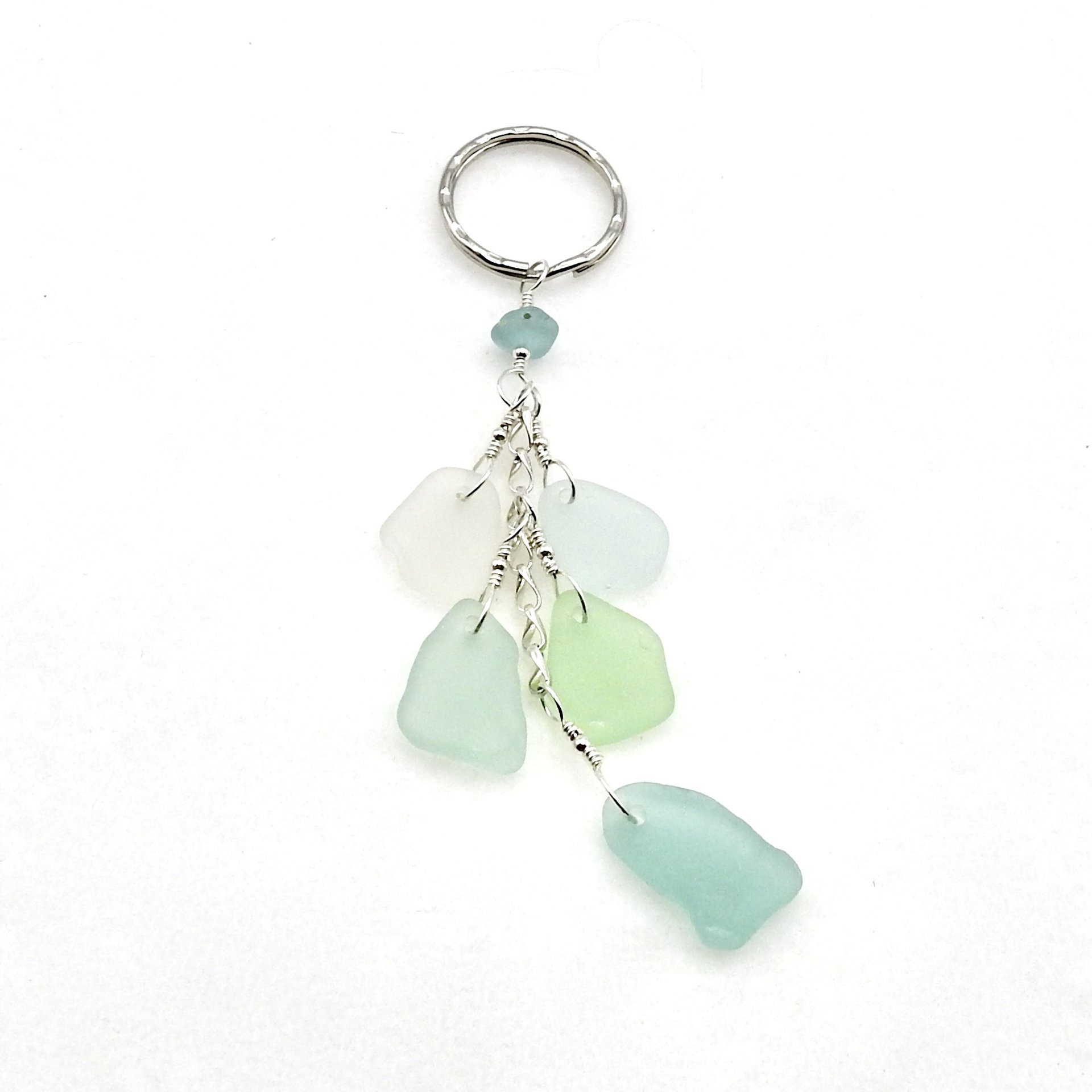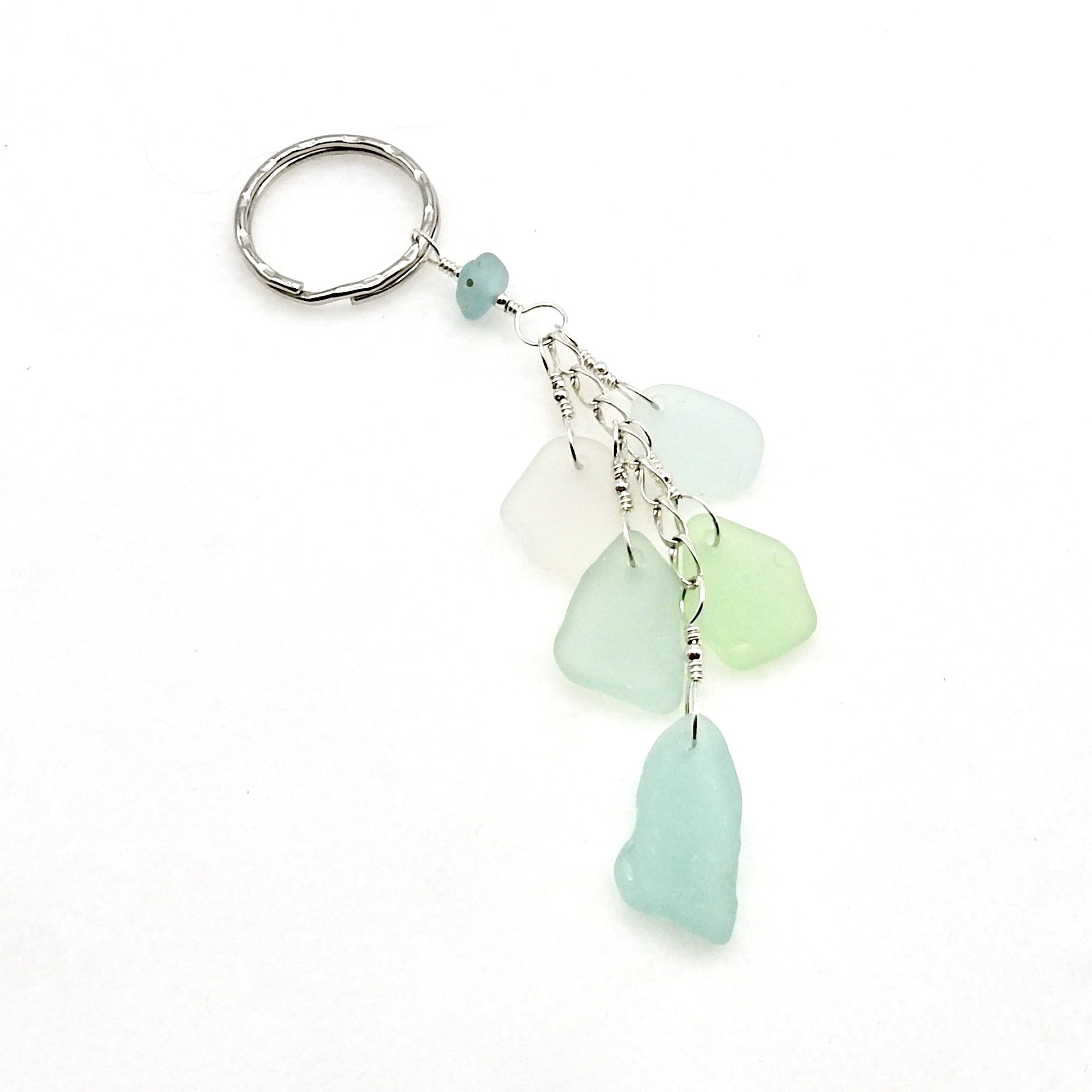 - materials - genuine sea glass (about 3/4" - 19.1mm), sterling silver wire, chain and round beads, silver tone hammered style keyring