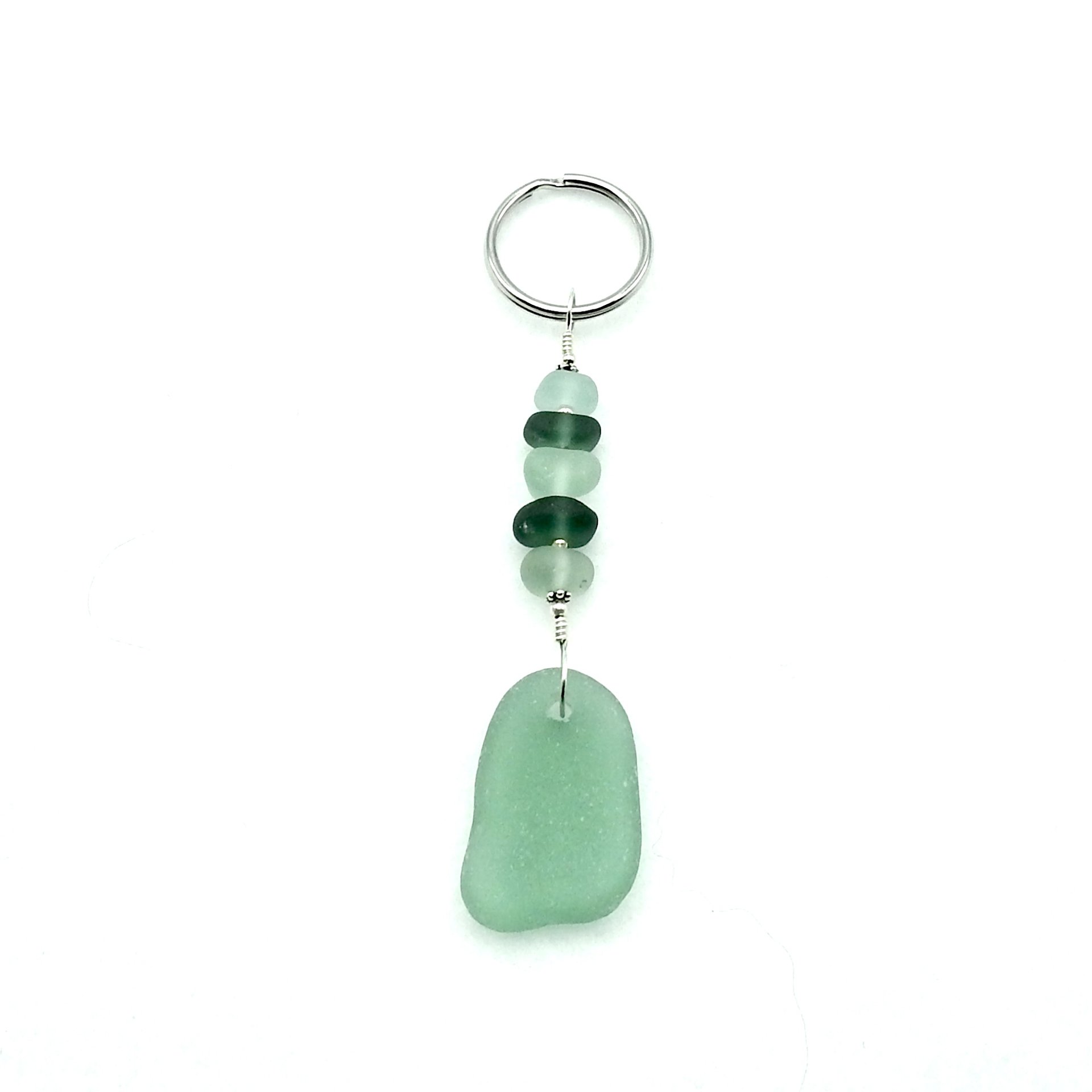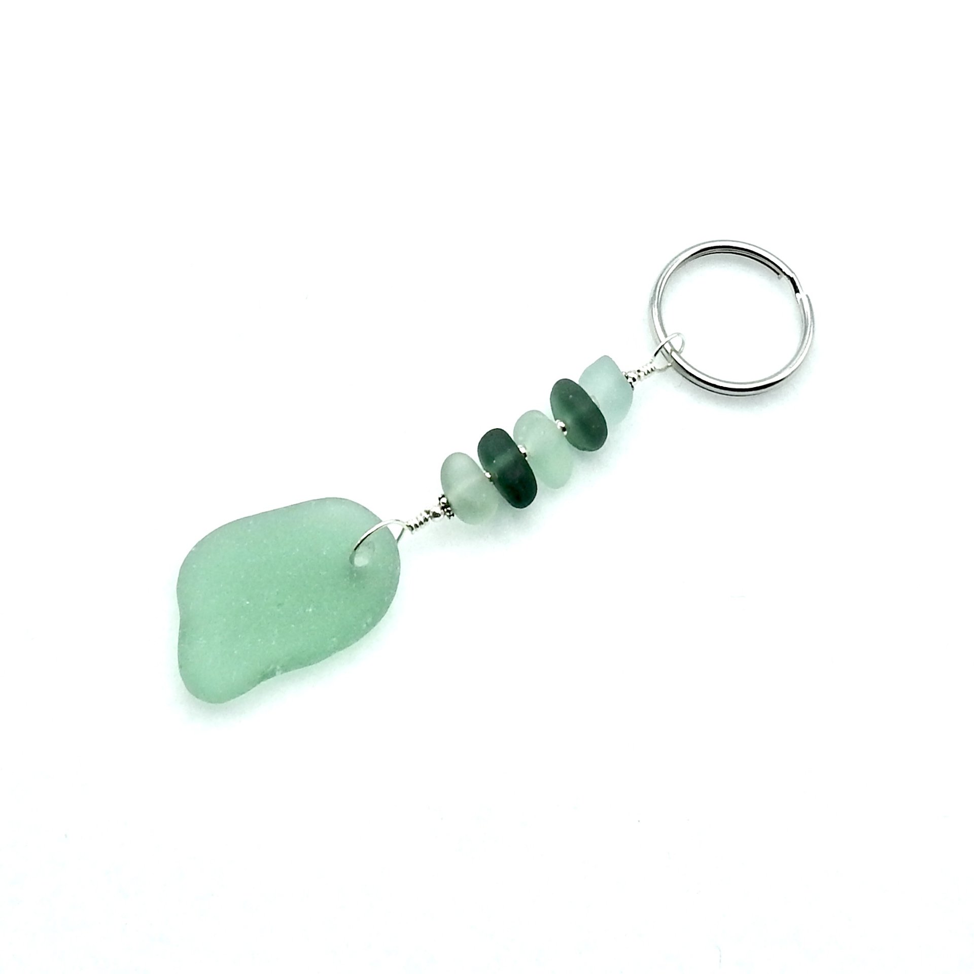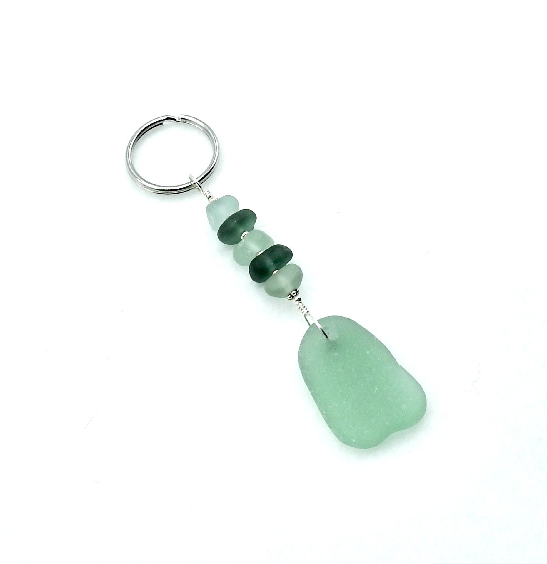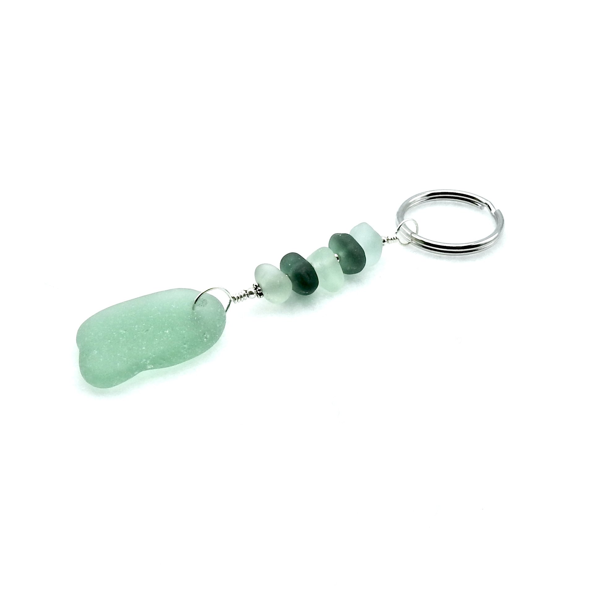 A unique keychain, handmade with genuine sea glass in shades of green and teal.