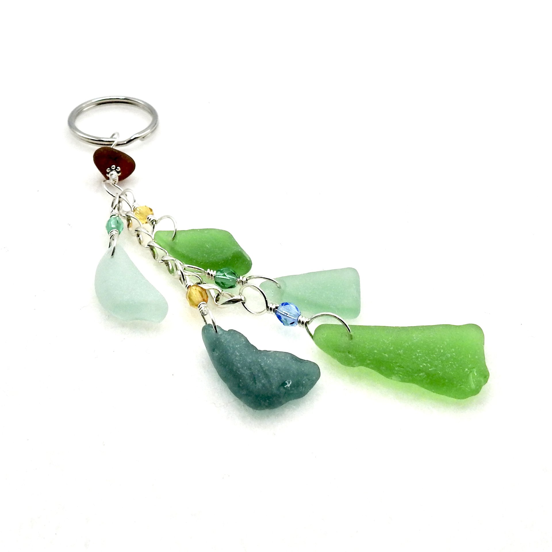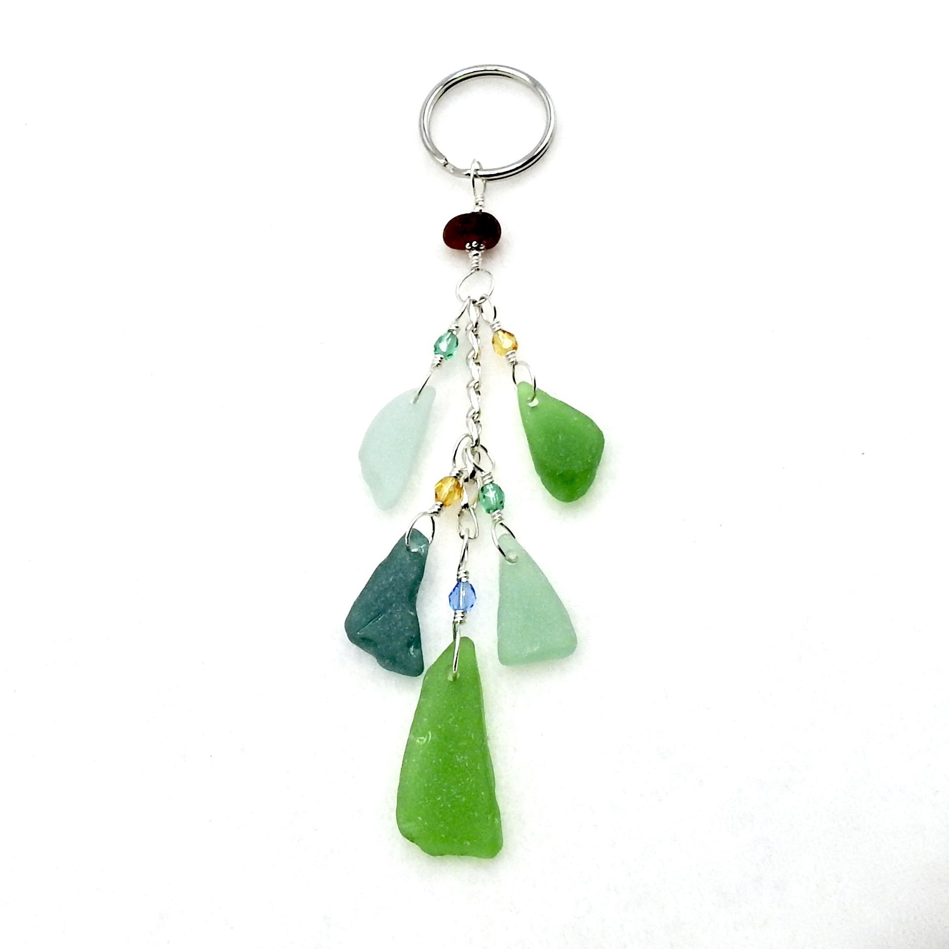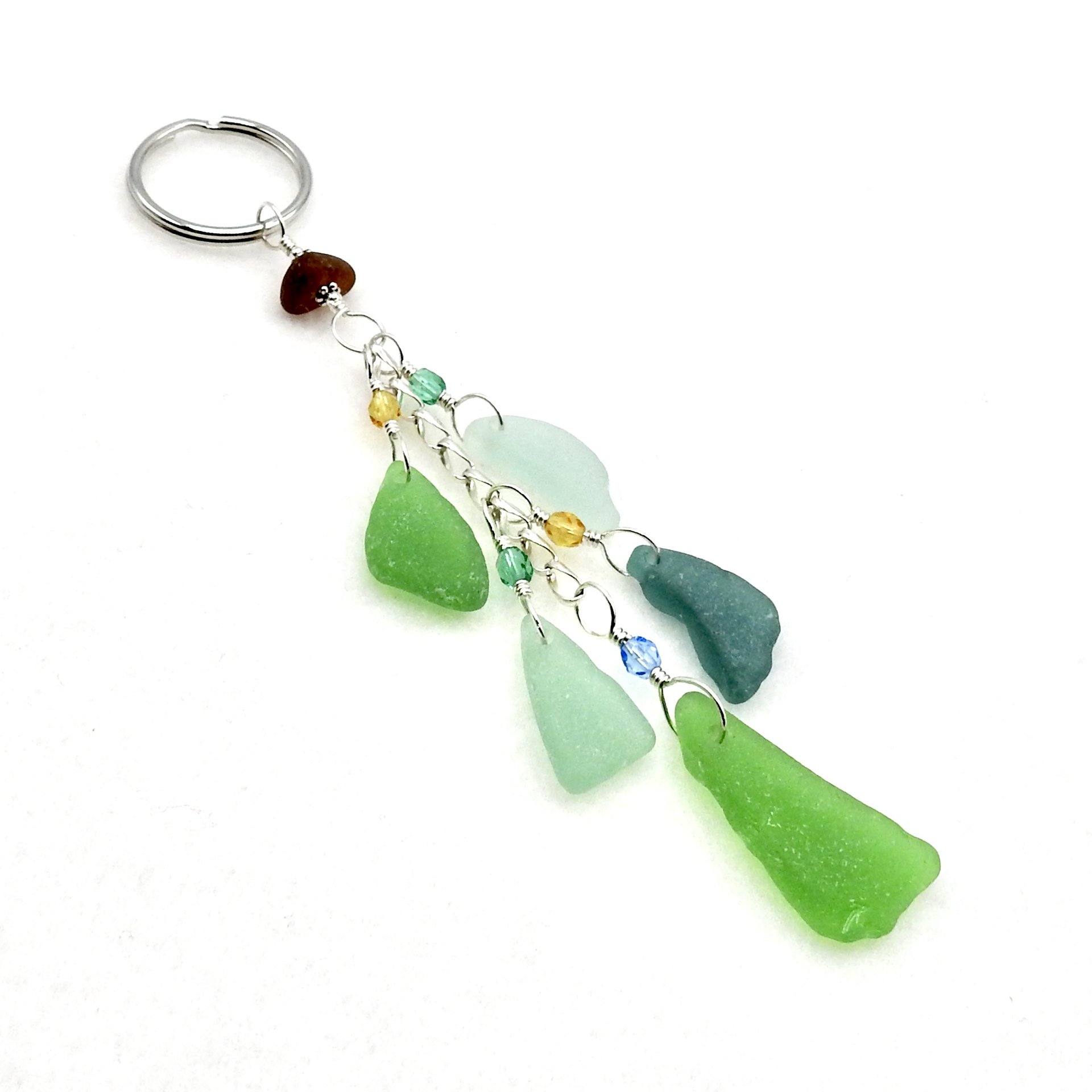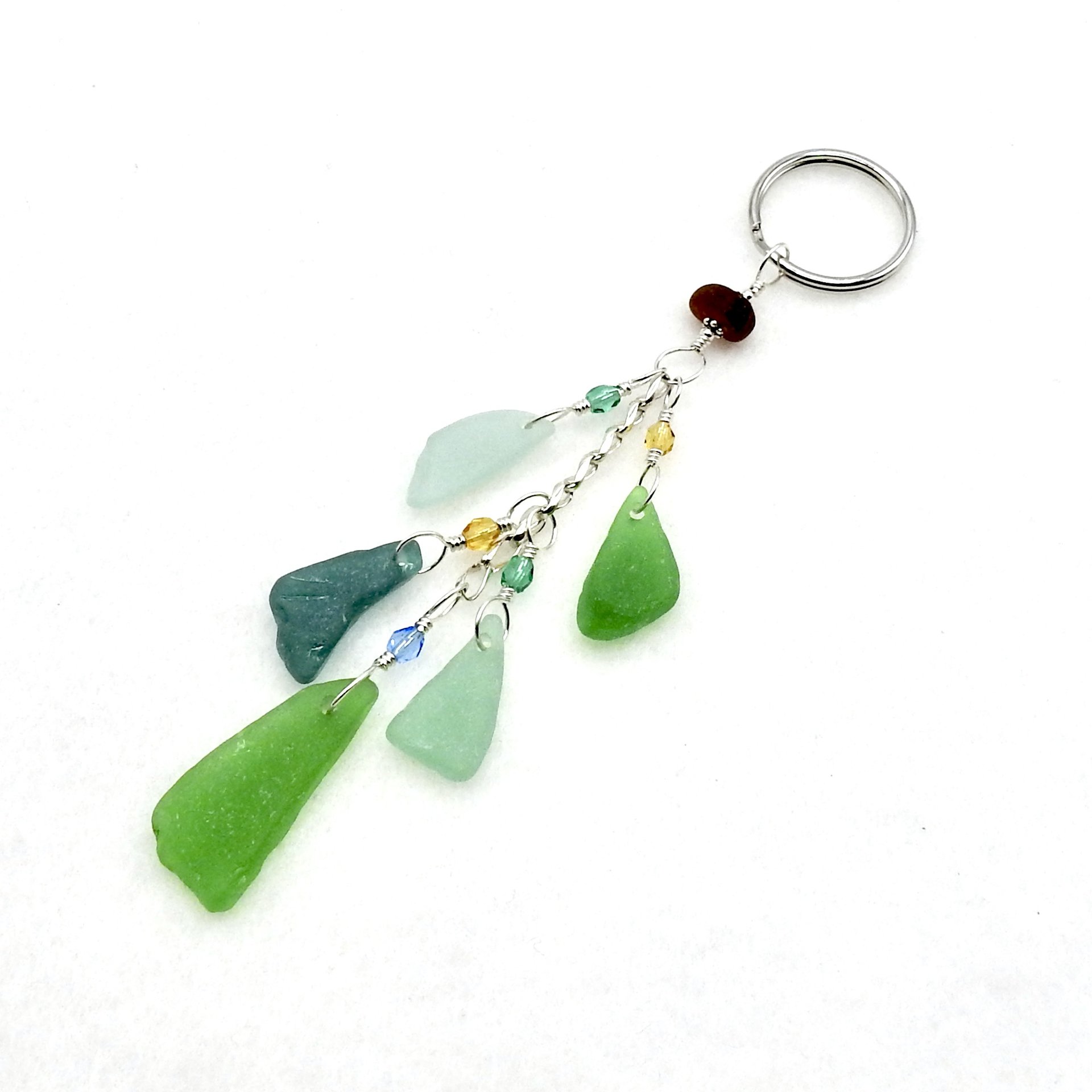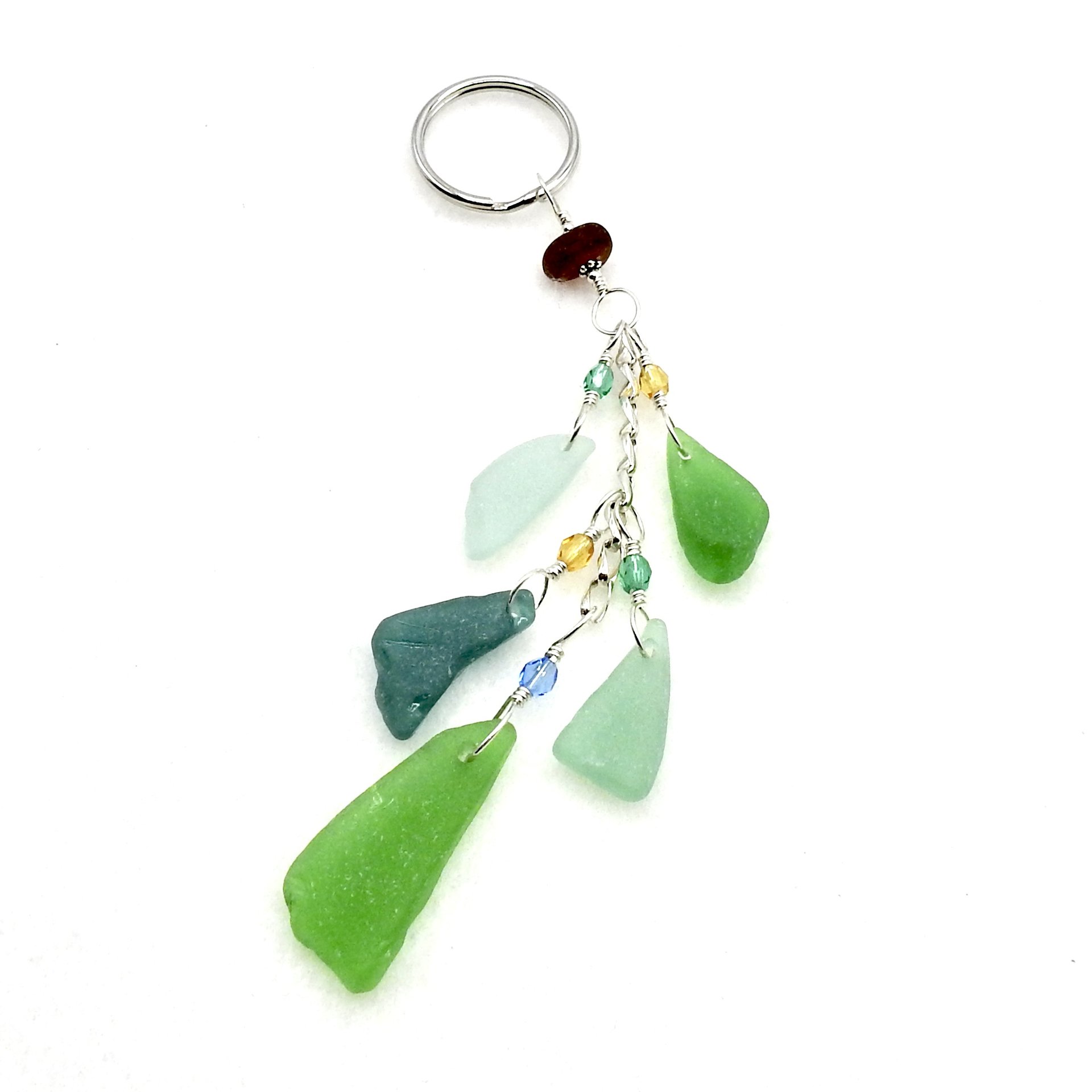 A multi charm long dangly keychain, handcrafted with genuine sea glass in shades of teal, sea foam, green and brown with tiny colourful glass accent beads.