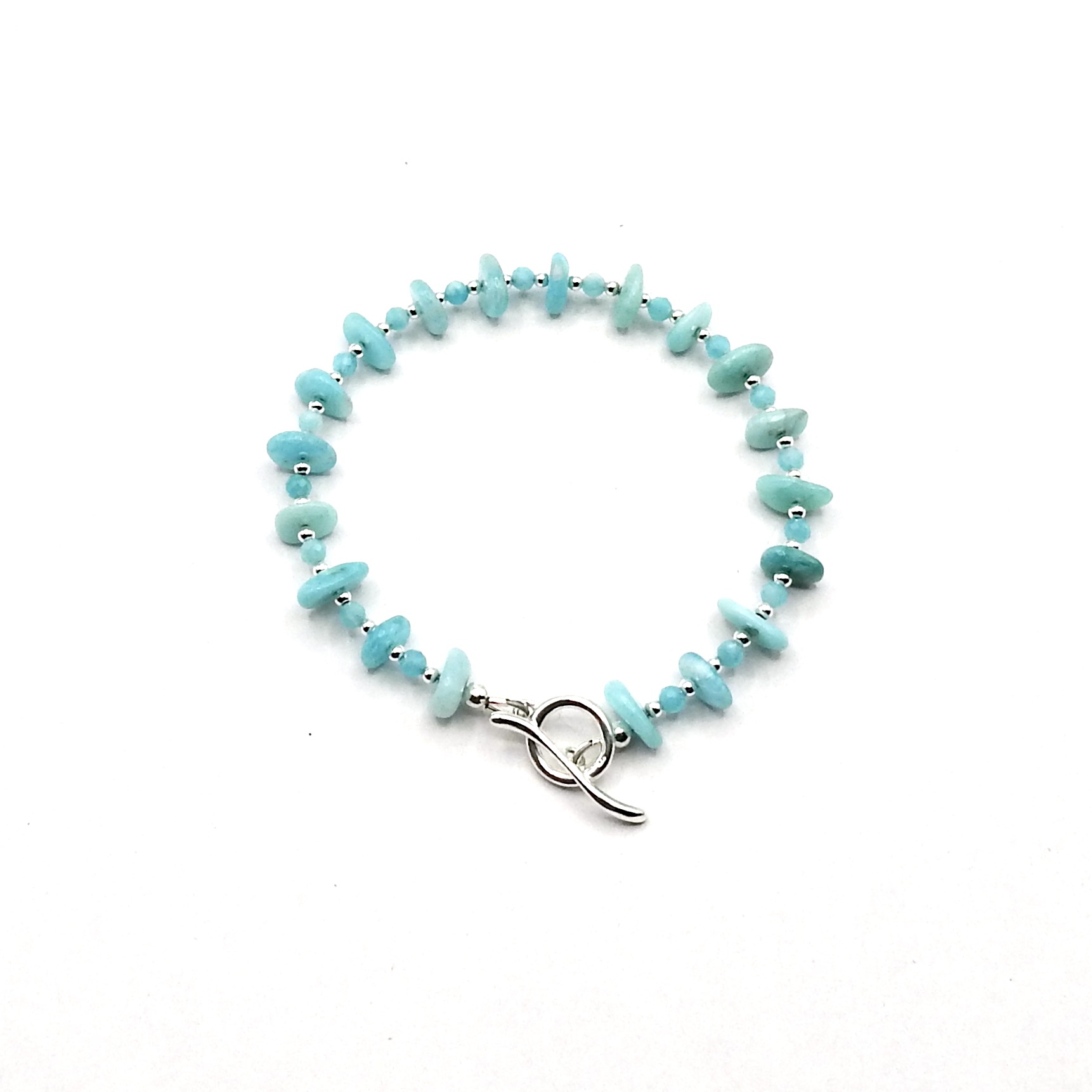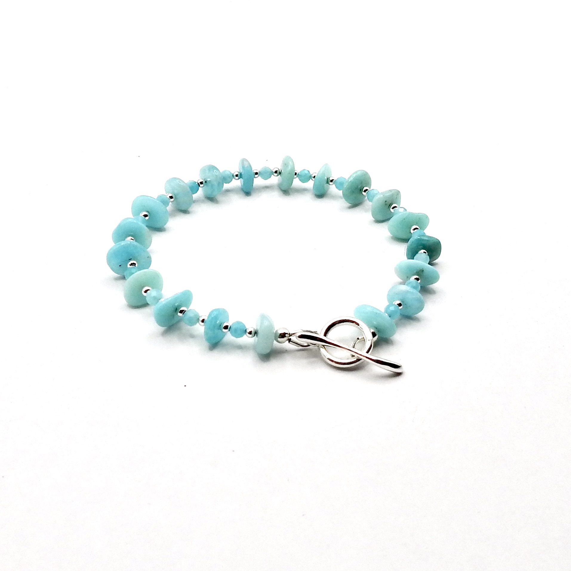 This delicate style bracelet is handmade with turquoise blue colour Amazonite gemstone beads with a sterling silver curved design toggle clasp.