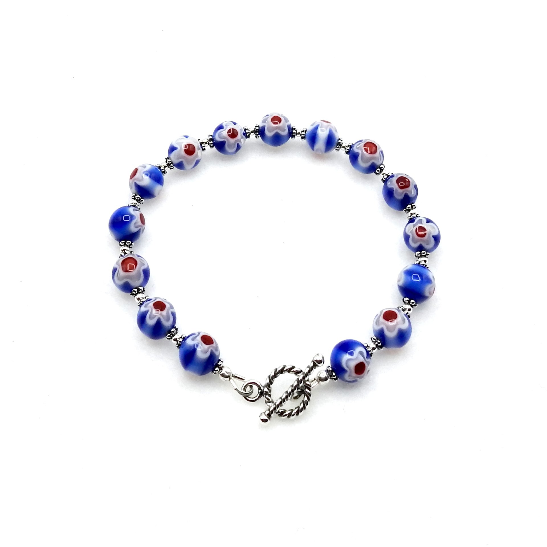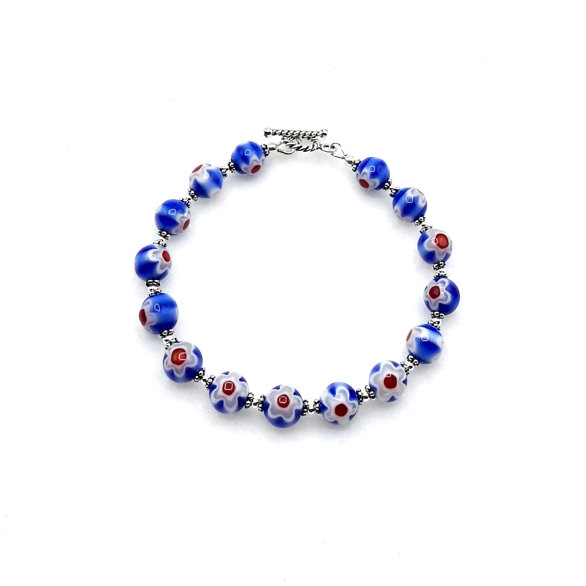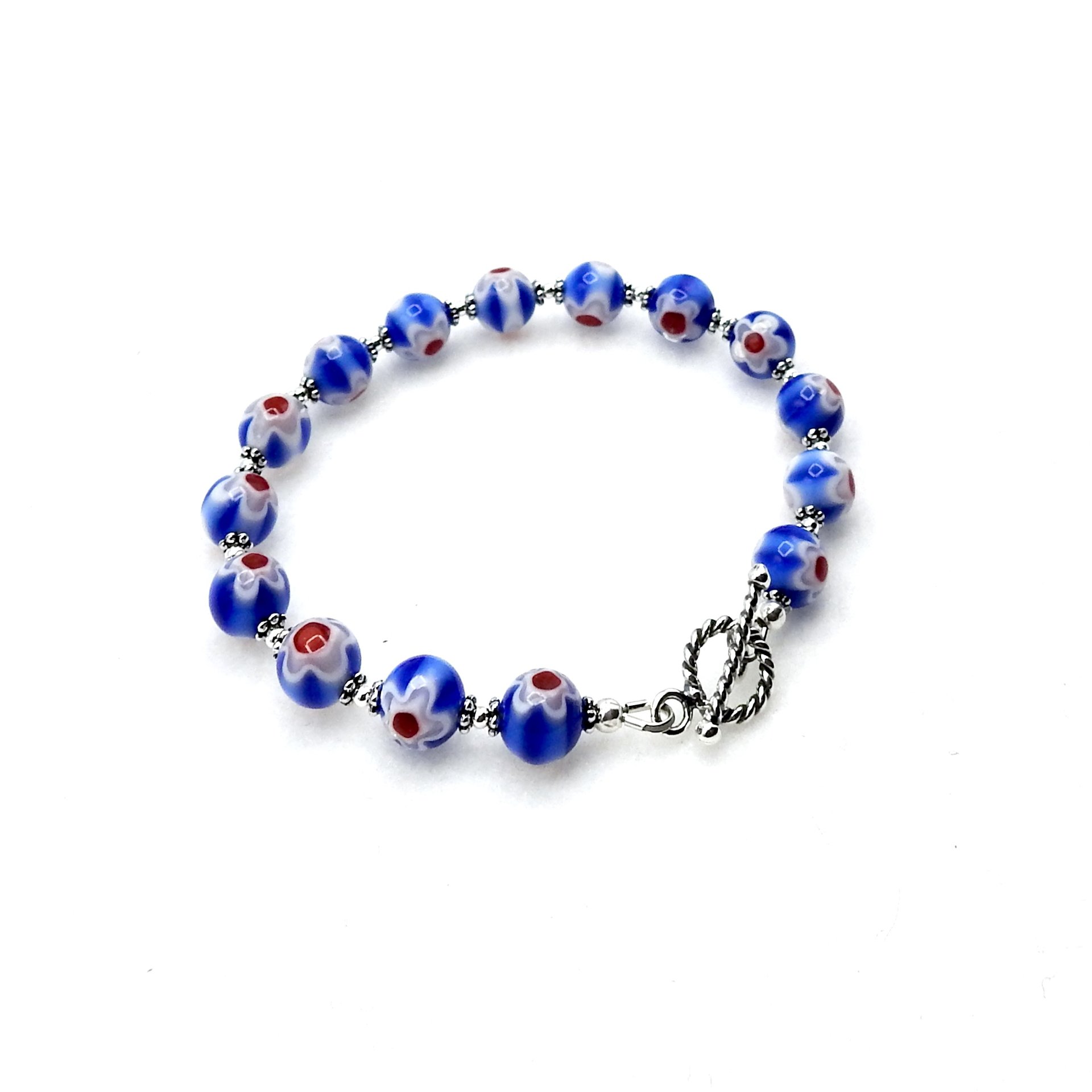 A delicate style bracelet, handmade with two tone blue glass millefiori beads with a white flower and bright red center design on both sides of the beads.