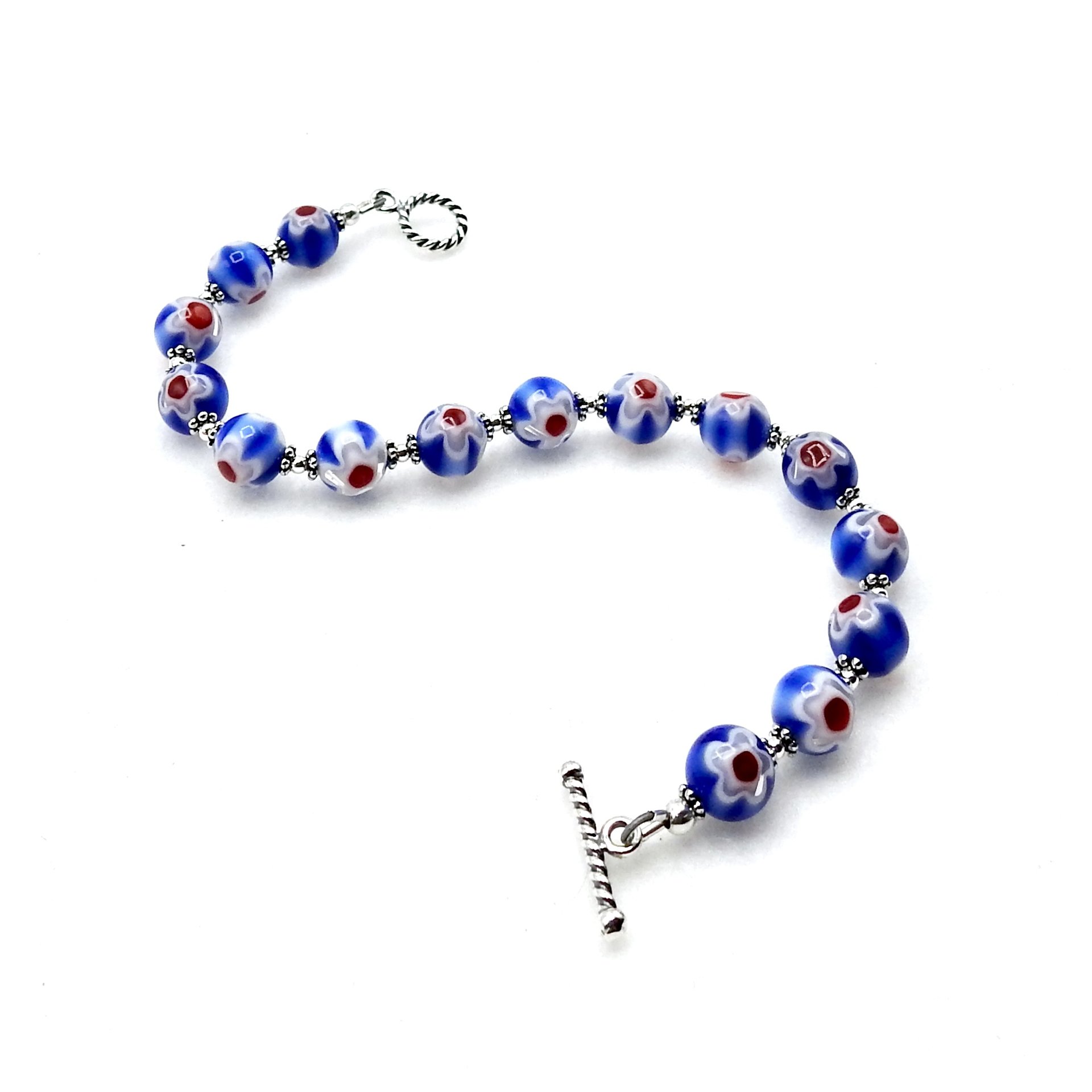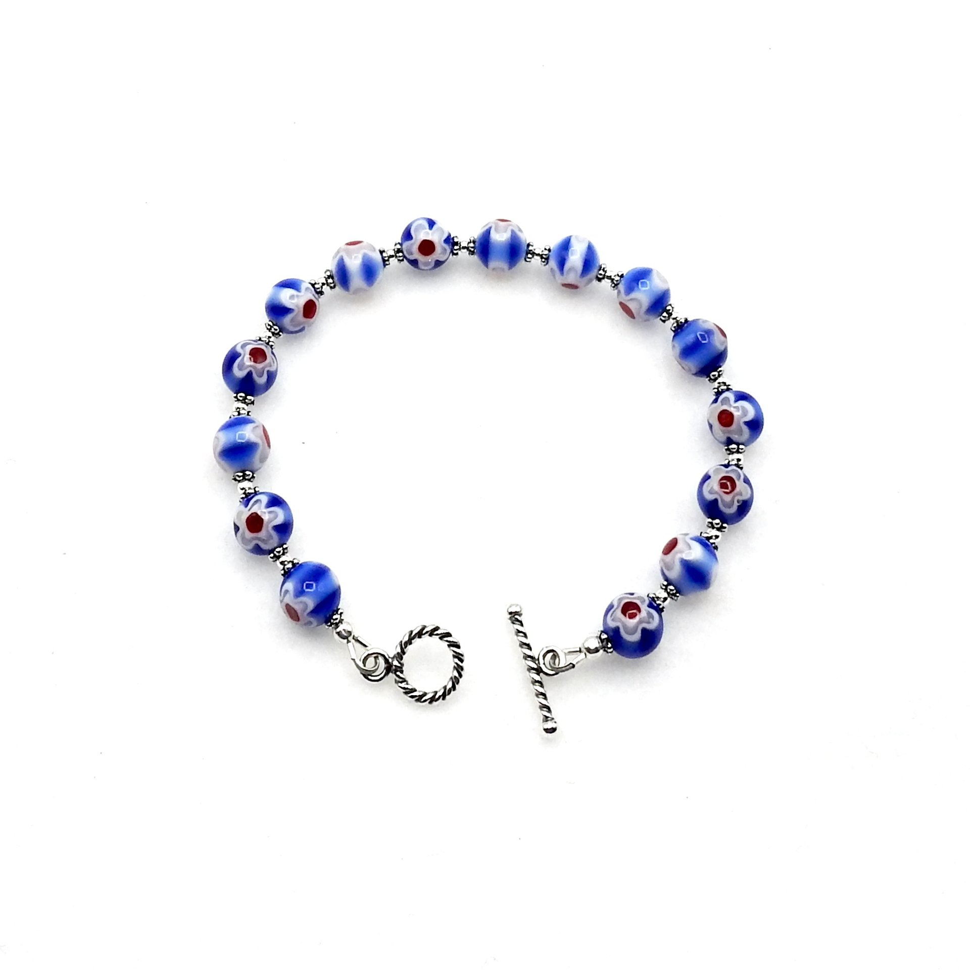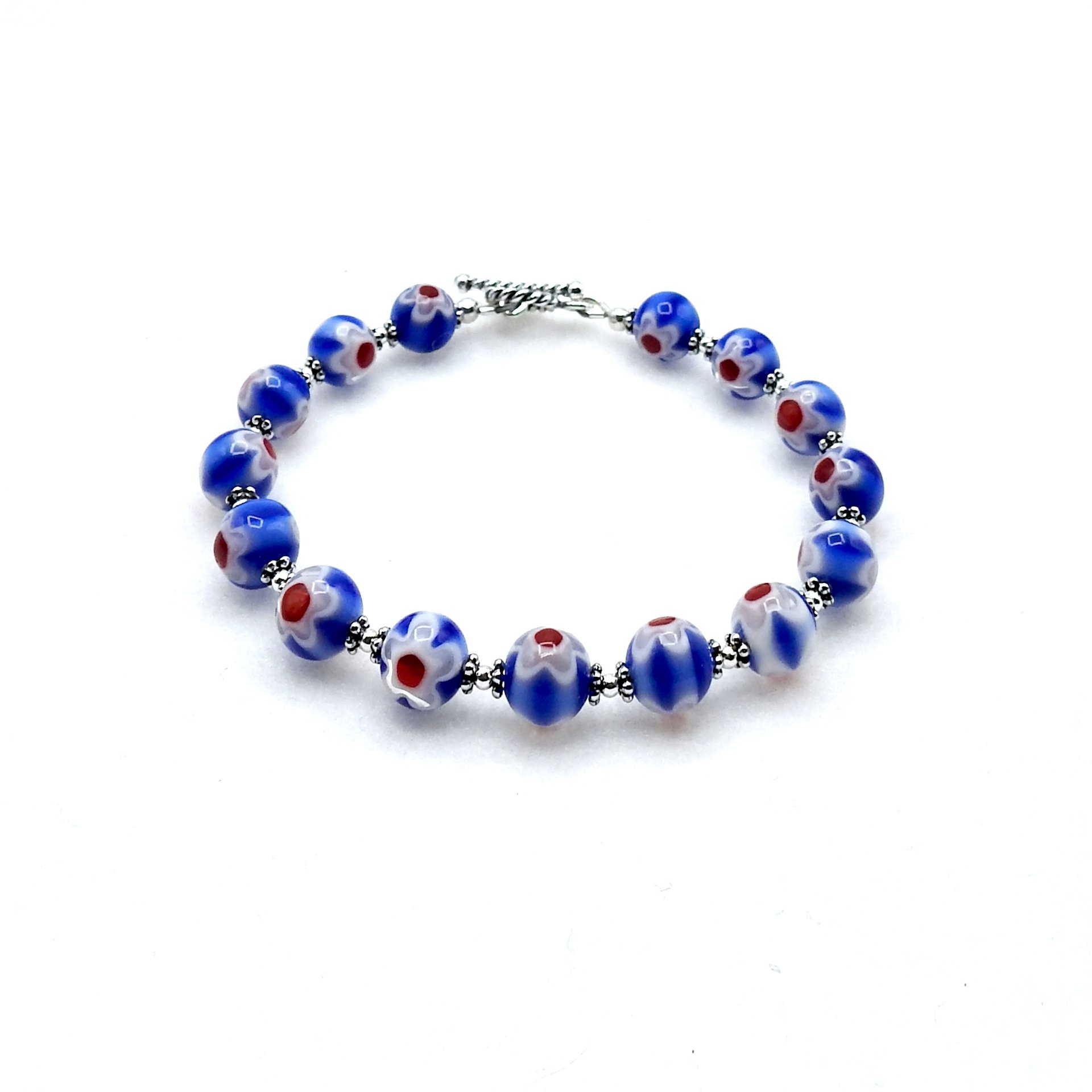 A delicate style bracelet, handmade with two tone blue glass millefiori beads with a white flower and bright red center design on both sides of the beads.