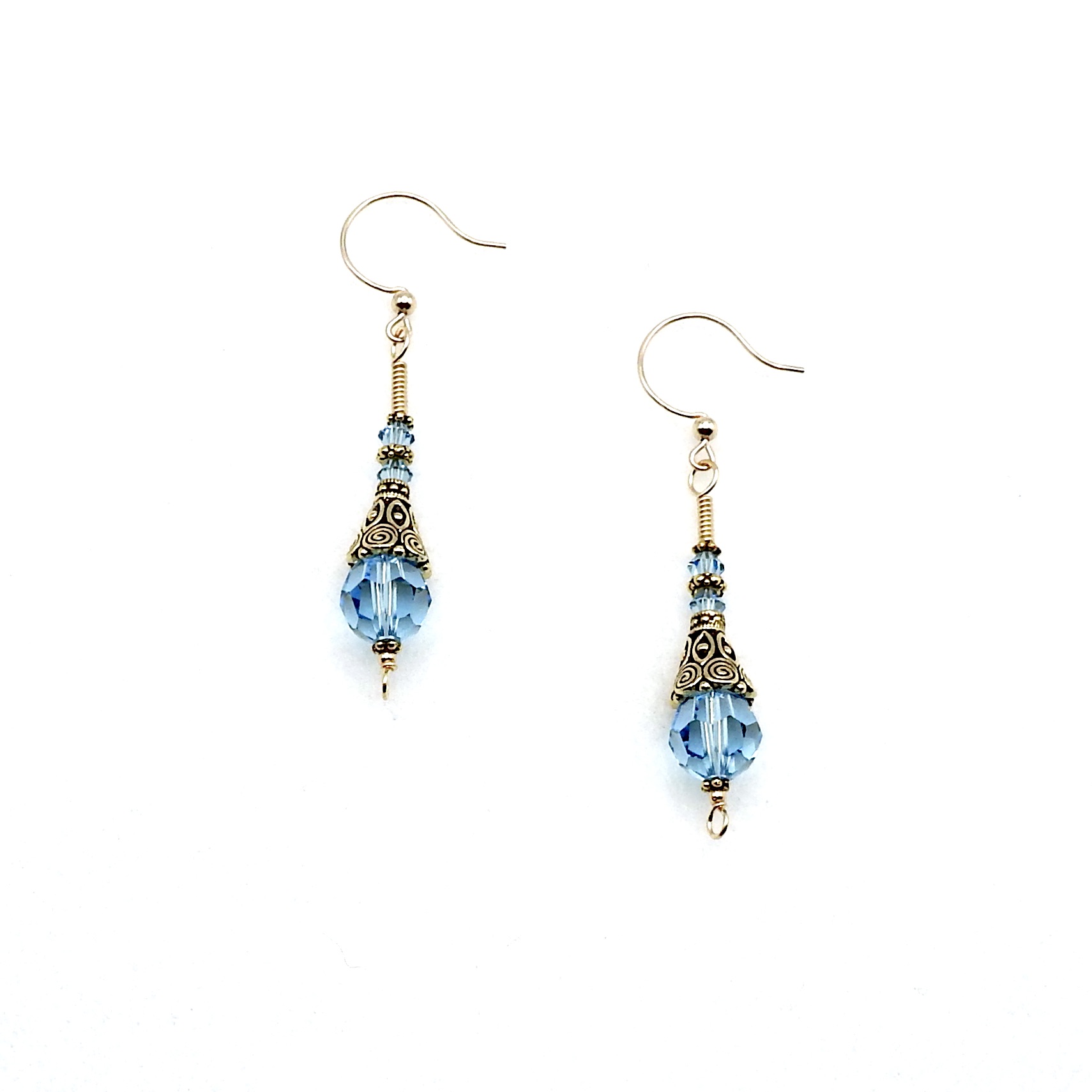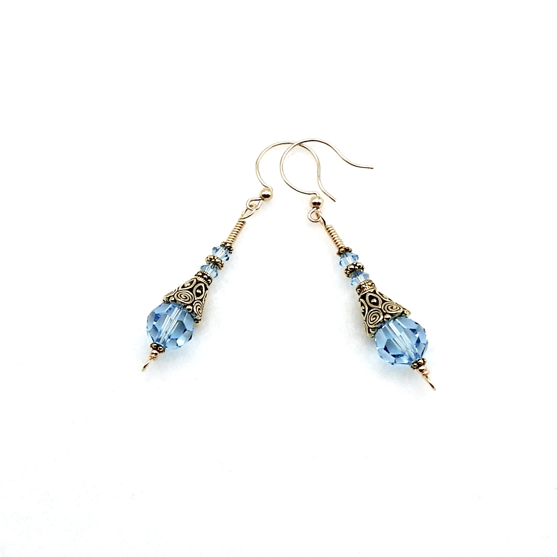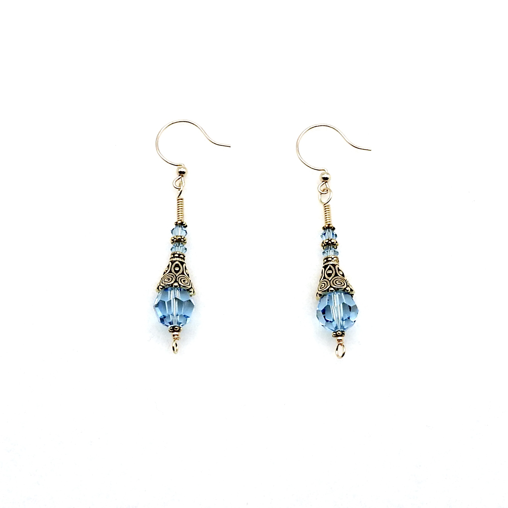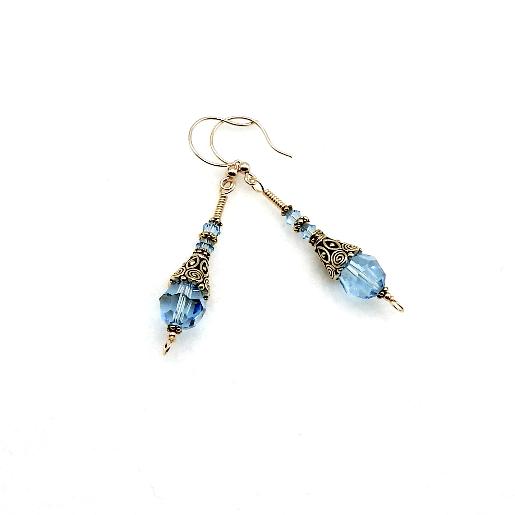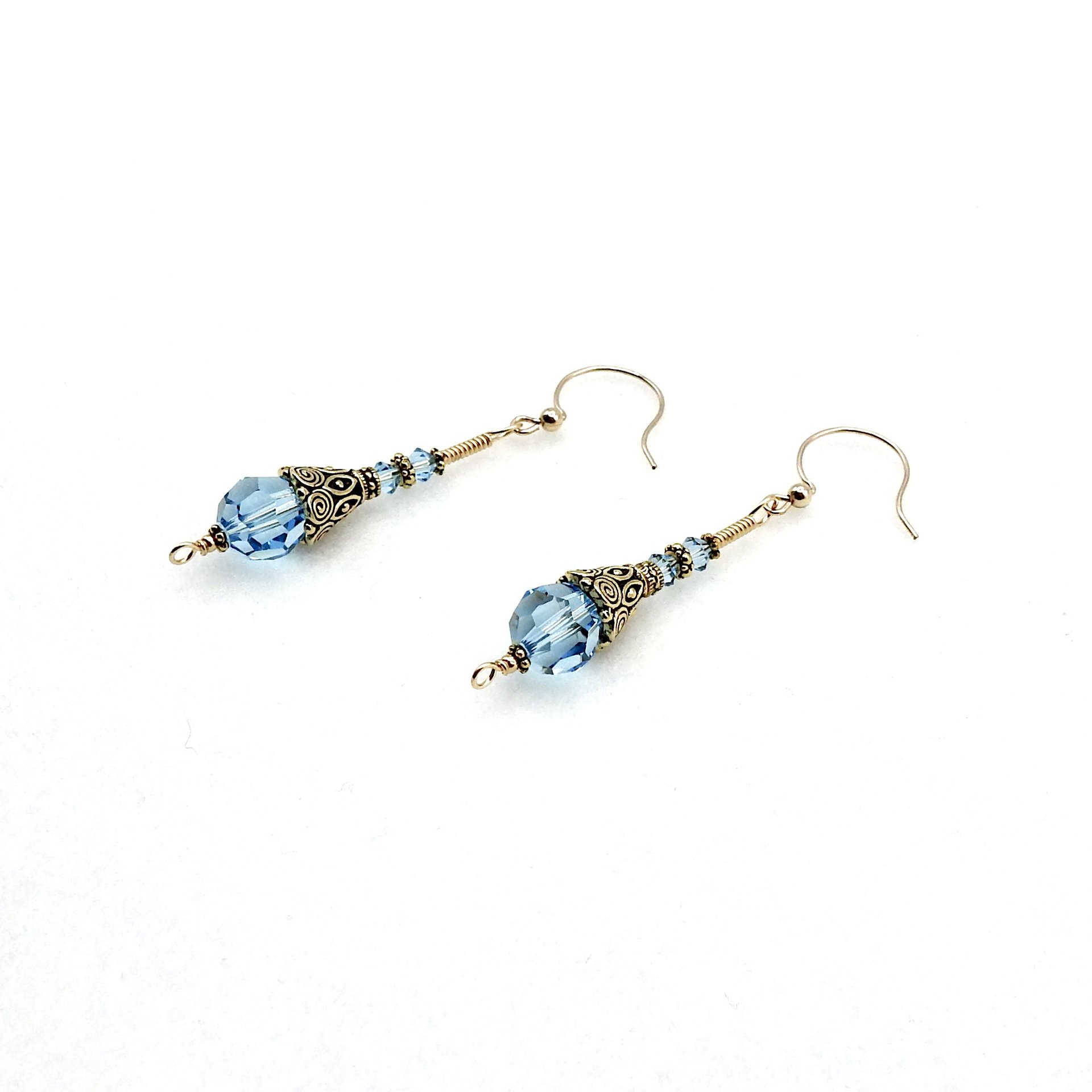 - materials - crystal beads (4mm and 10mm), 14K/20 gold filled ear wires, 14K/20 gold filled wire, gold plated pewter beads and cones