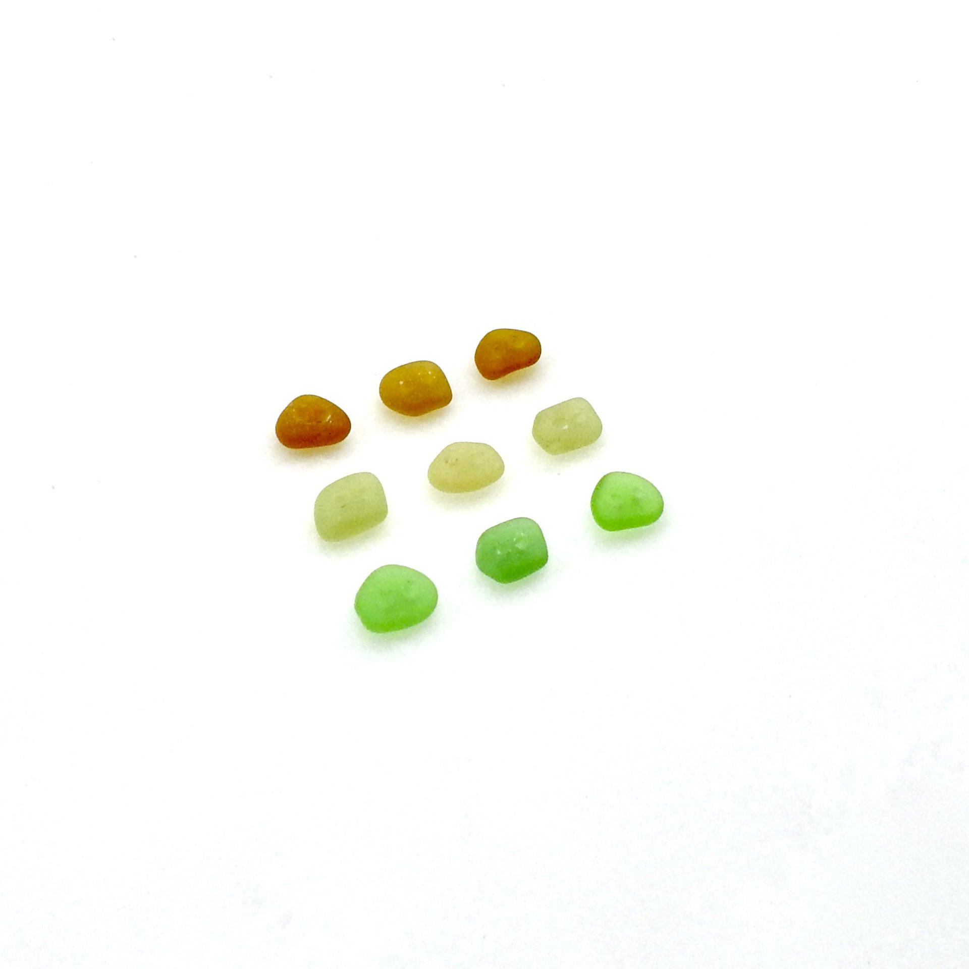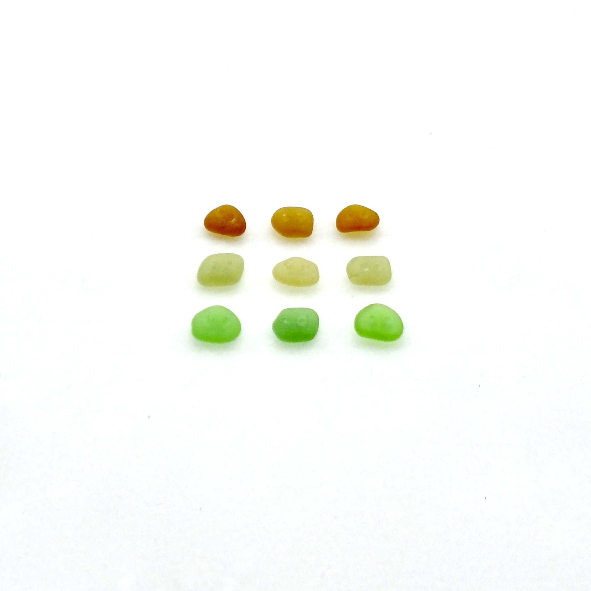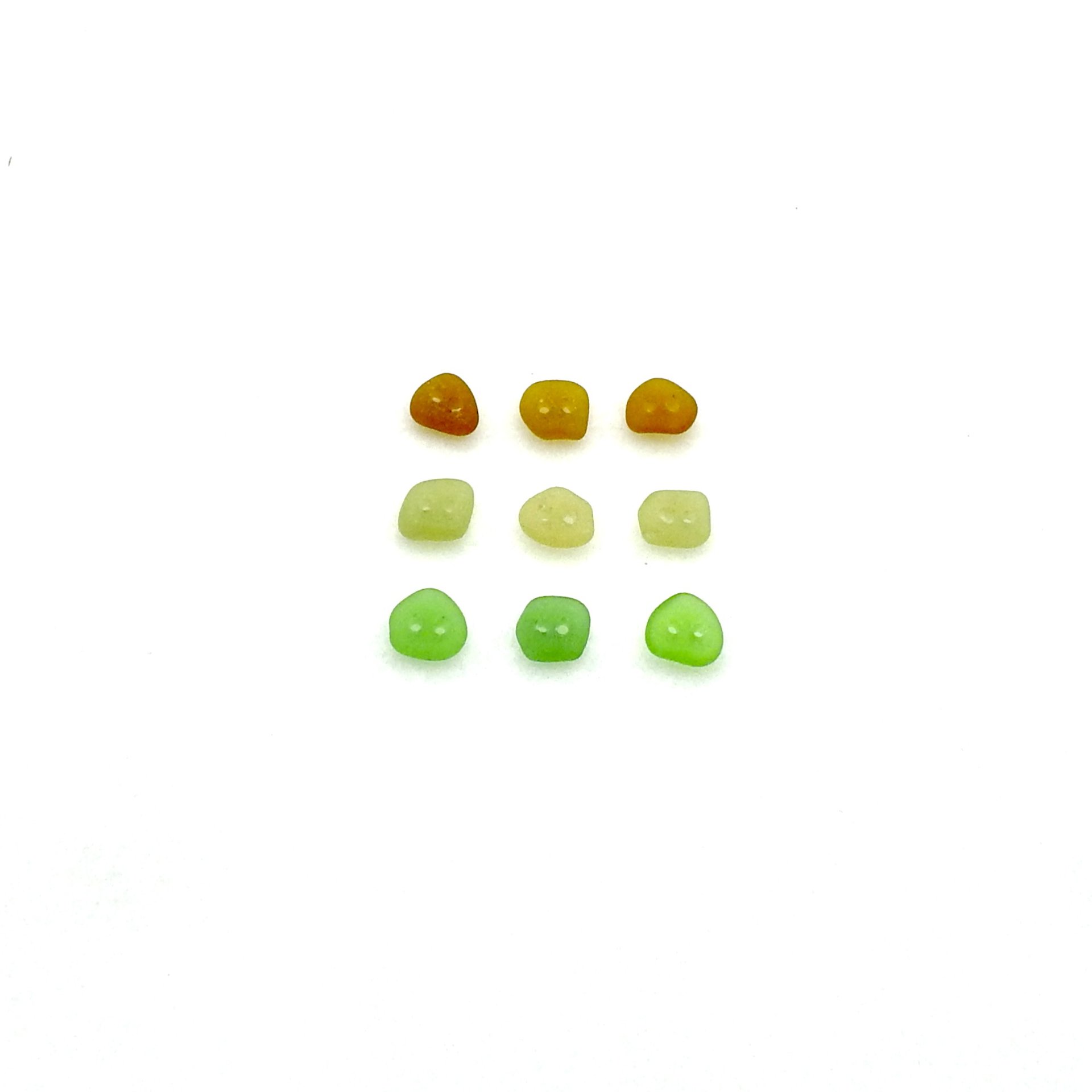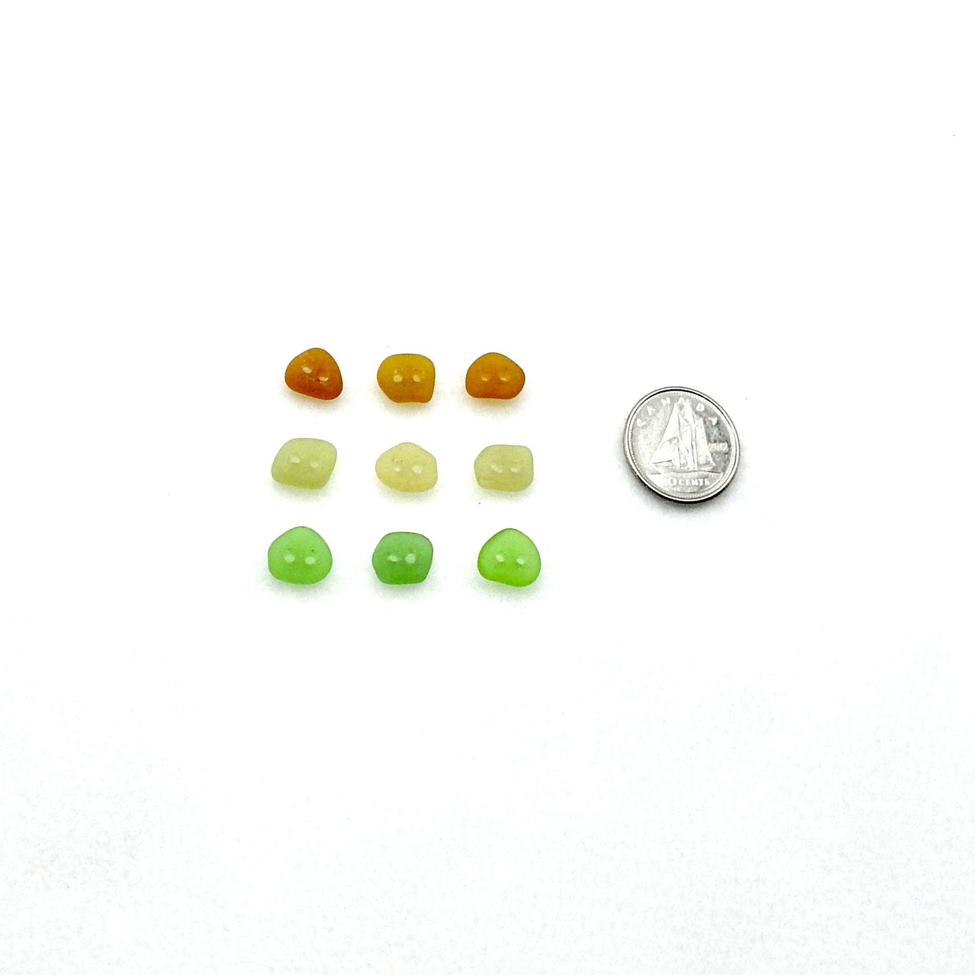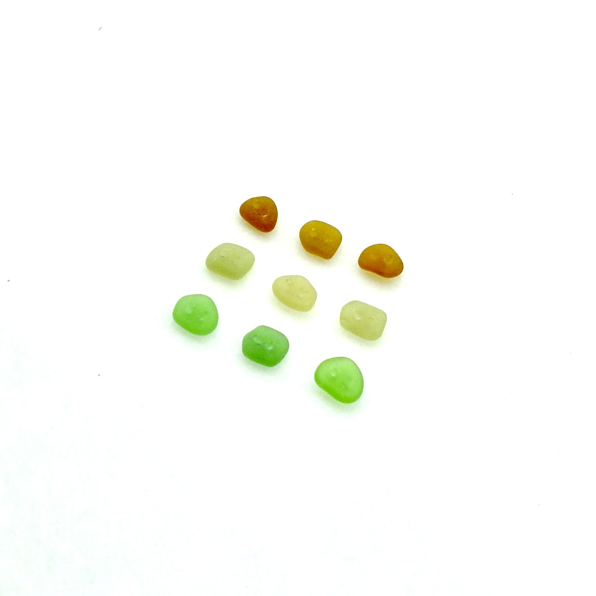 Tiny genuine sea glass buttons, set of 9, with two drilled holes in the colours of light brown, yellow and green. These one of a kind buttons could be used for sewing, knitting or crochet projects as well as jewelry and decoration.