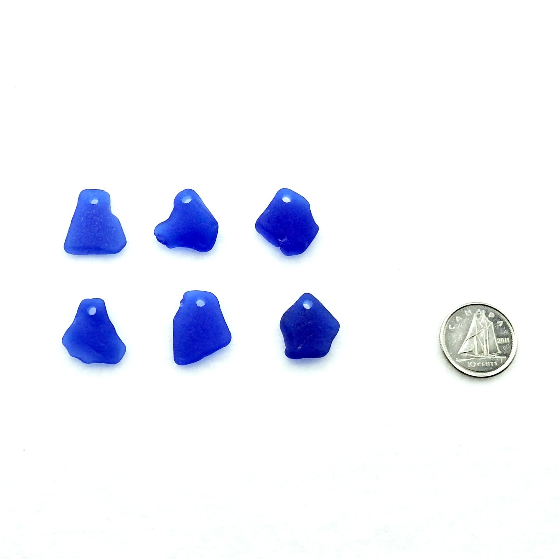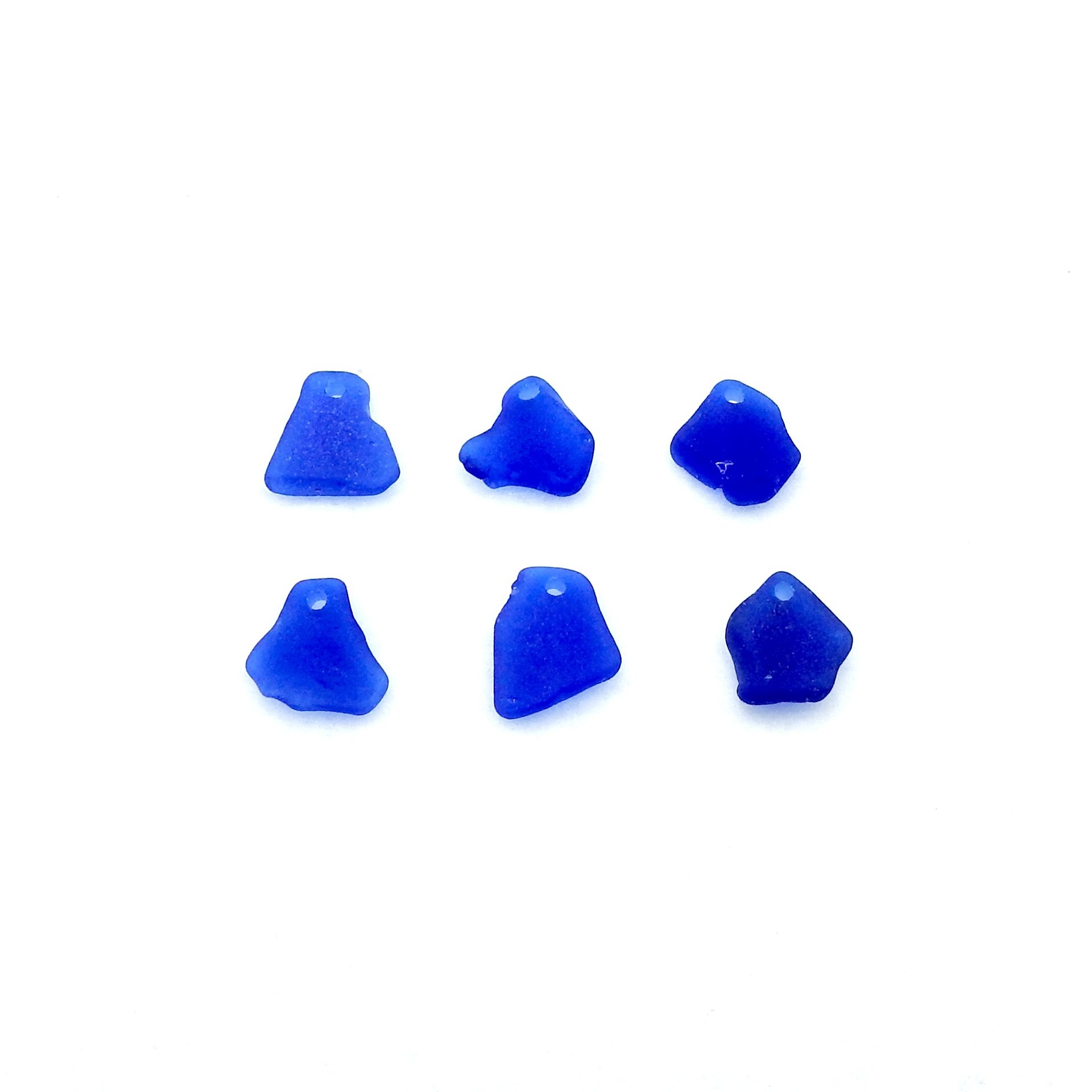 Genuine sea glass charms, set of 6, in shades of cobalt blue with top drilled holes for jewelry making or other beach themed crafts.
