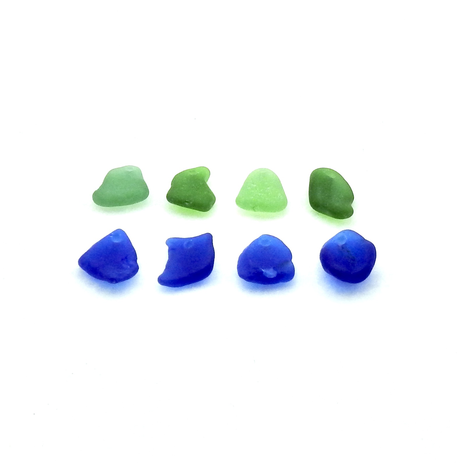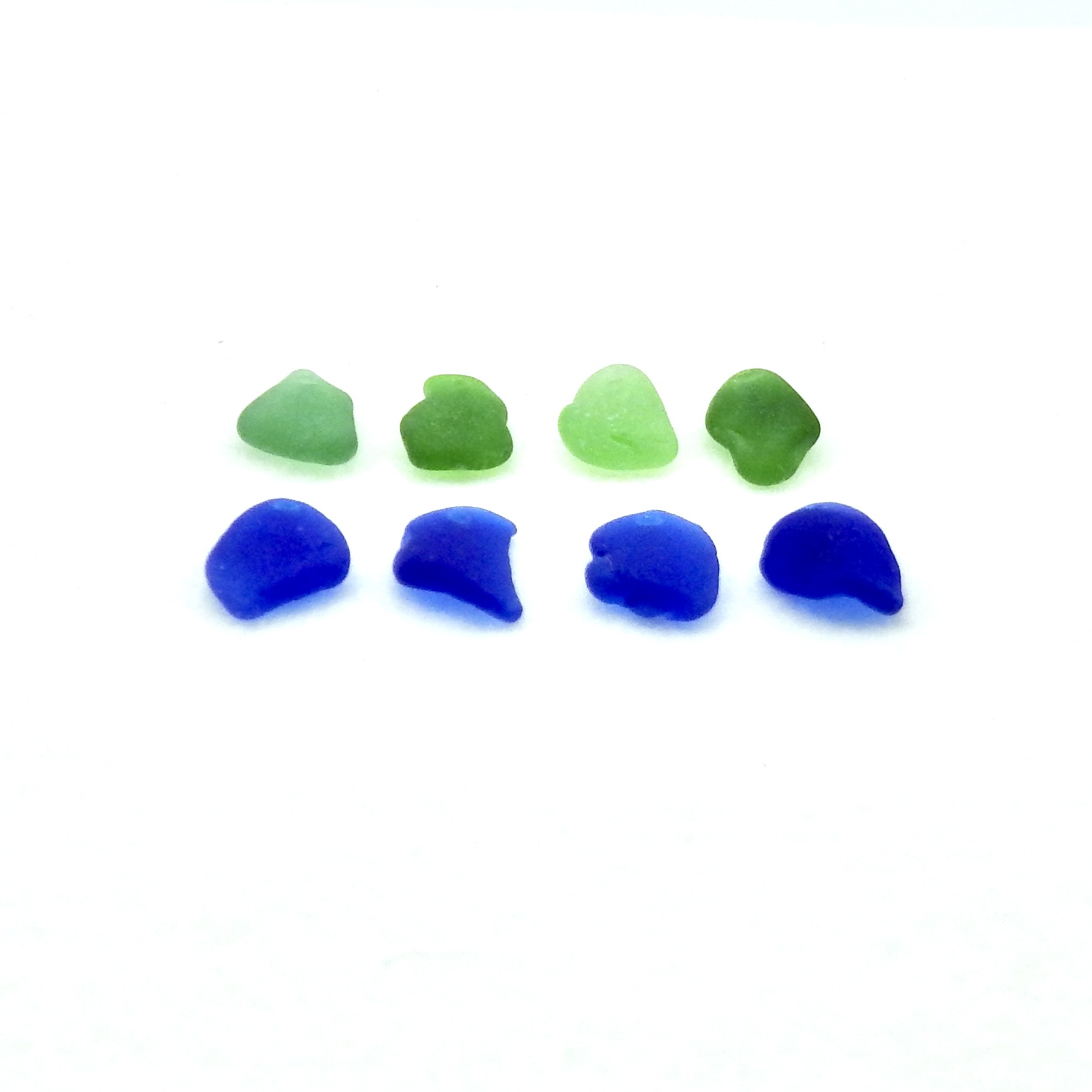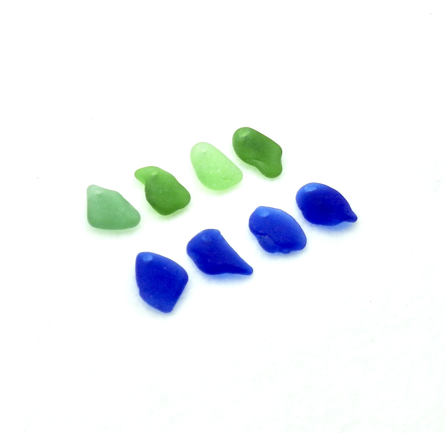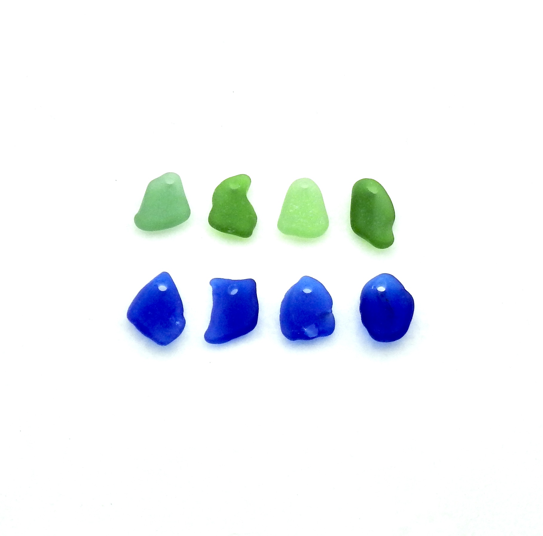 Genuine sea glass charms, set of 8, in shades of cobalt blue and green with top drilled holes for jewelry making or other beach themed crafts.