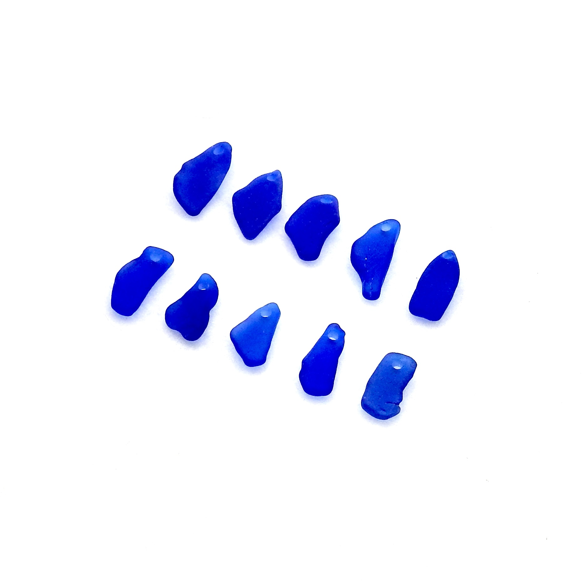 Genuine sea glass charms, set of 10, in shades of cobalt blue with top drilled holes for jewelry making, or other beach themed crafts.