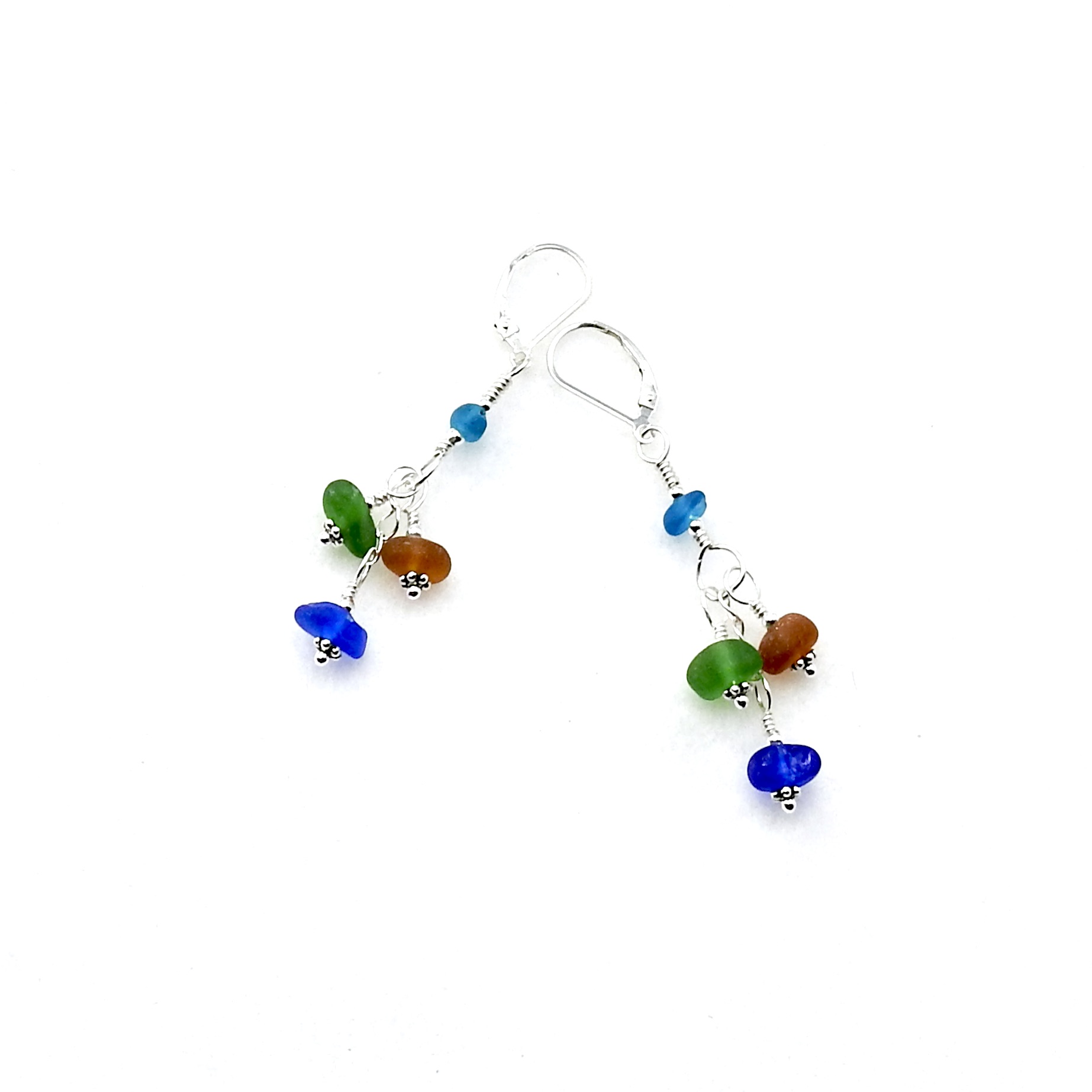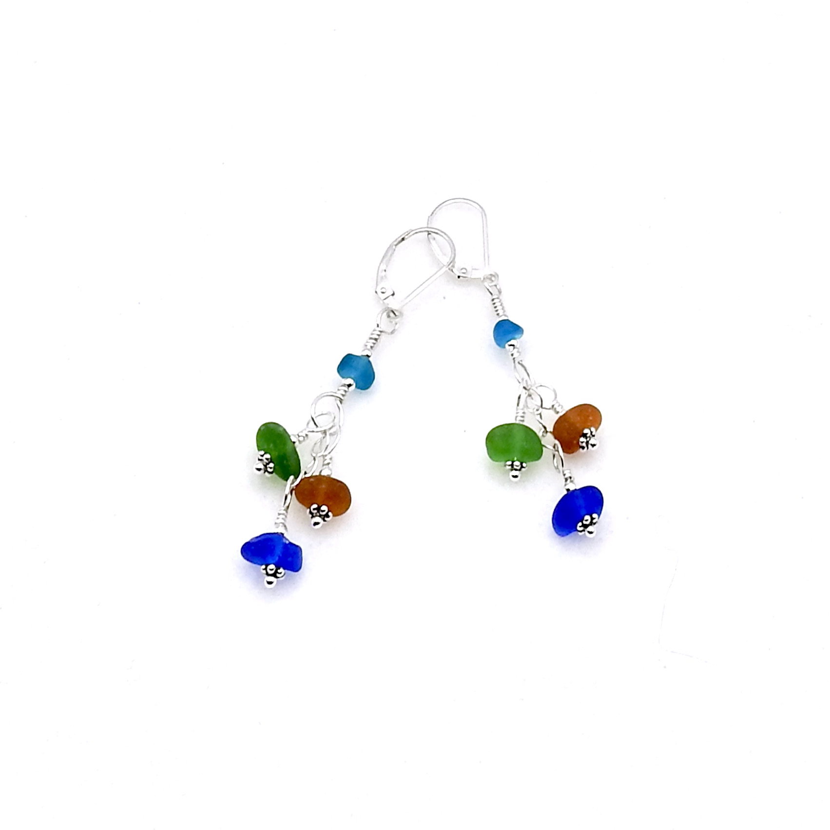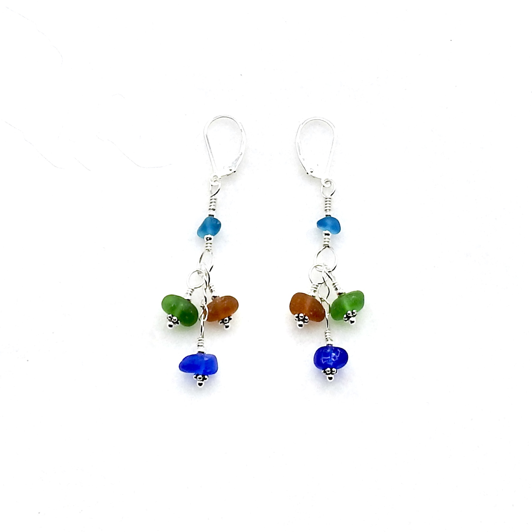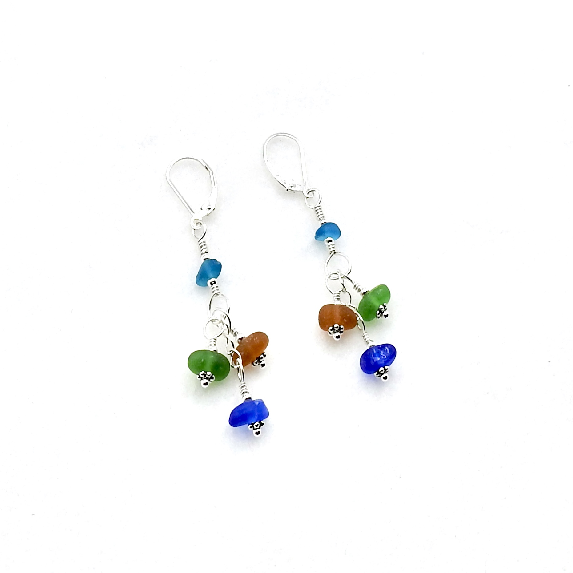 Colourful sea glass drop earrings, handmade with genuine sea glass pieces in bright shades with sterling silver lever back ear wires.