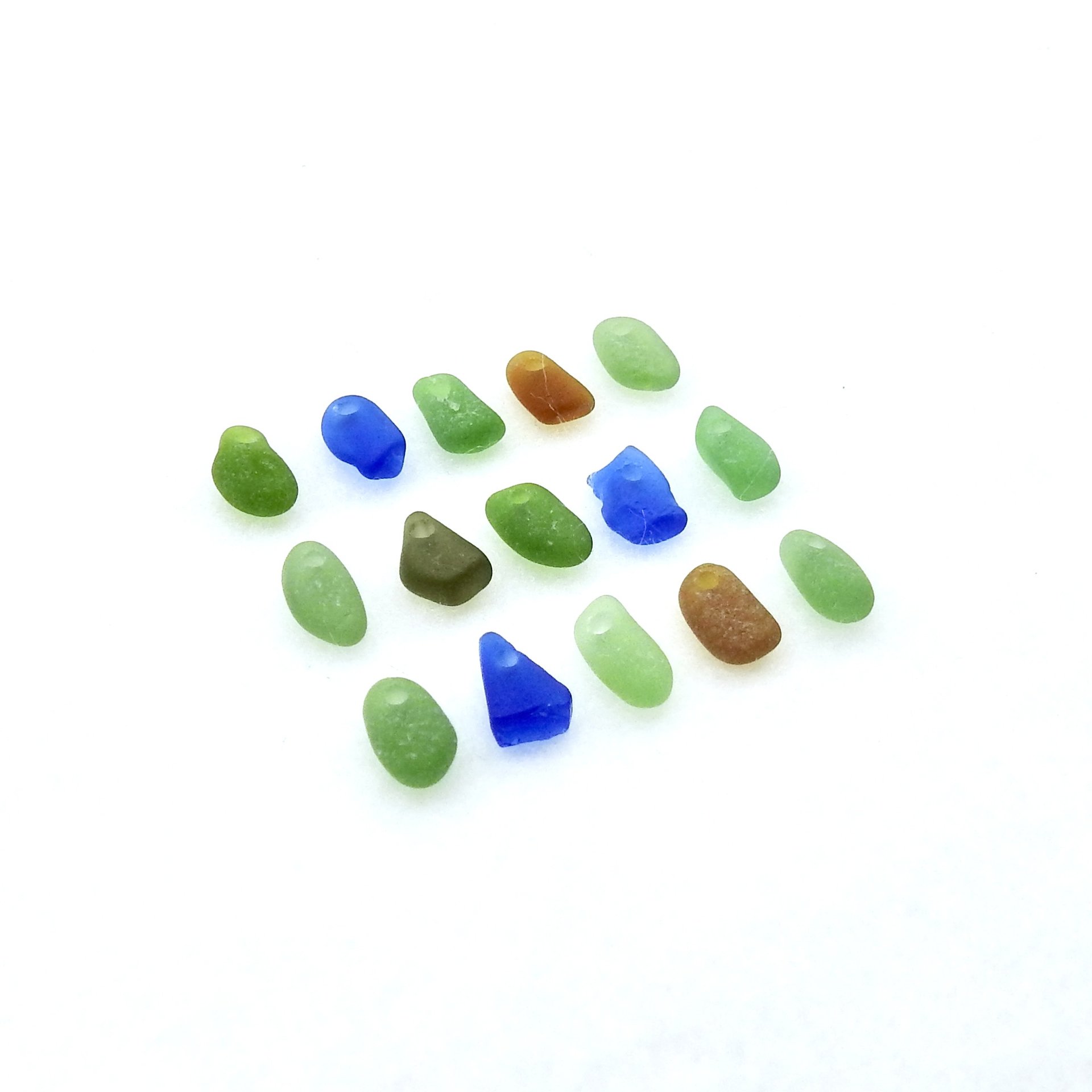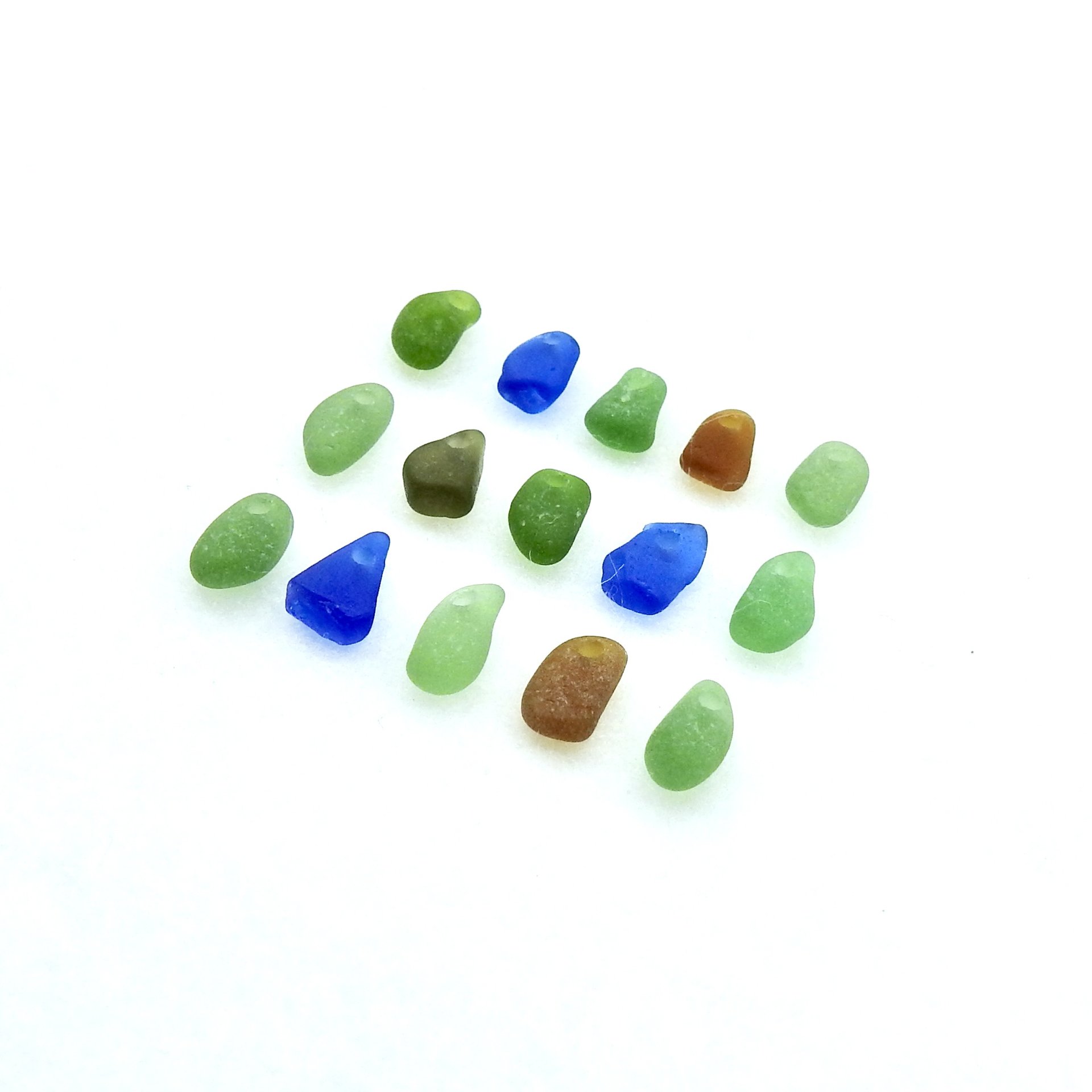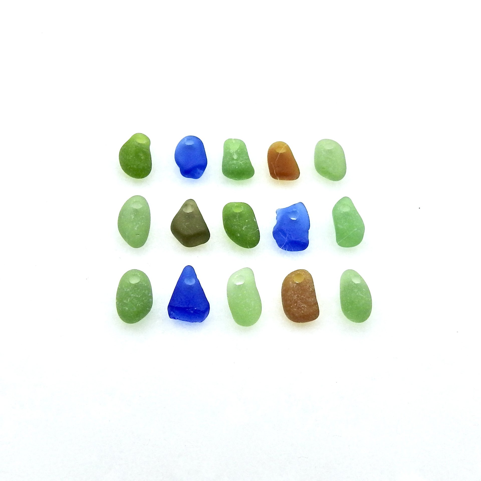 Very tiny genuine sea glass charms, set of 15, in multi colours with top drilled holes for jewelry making, sew on fringe or other beach themed crafts.