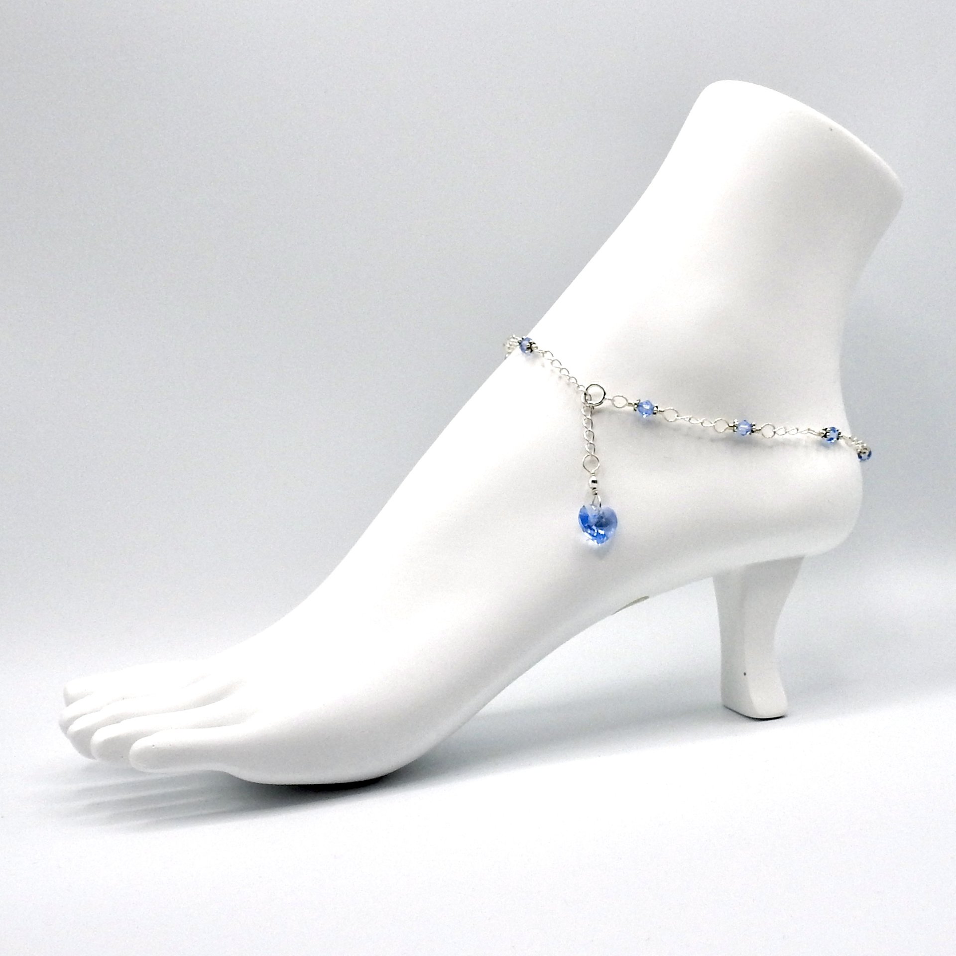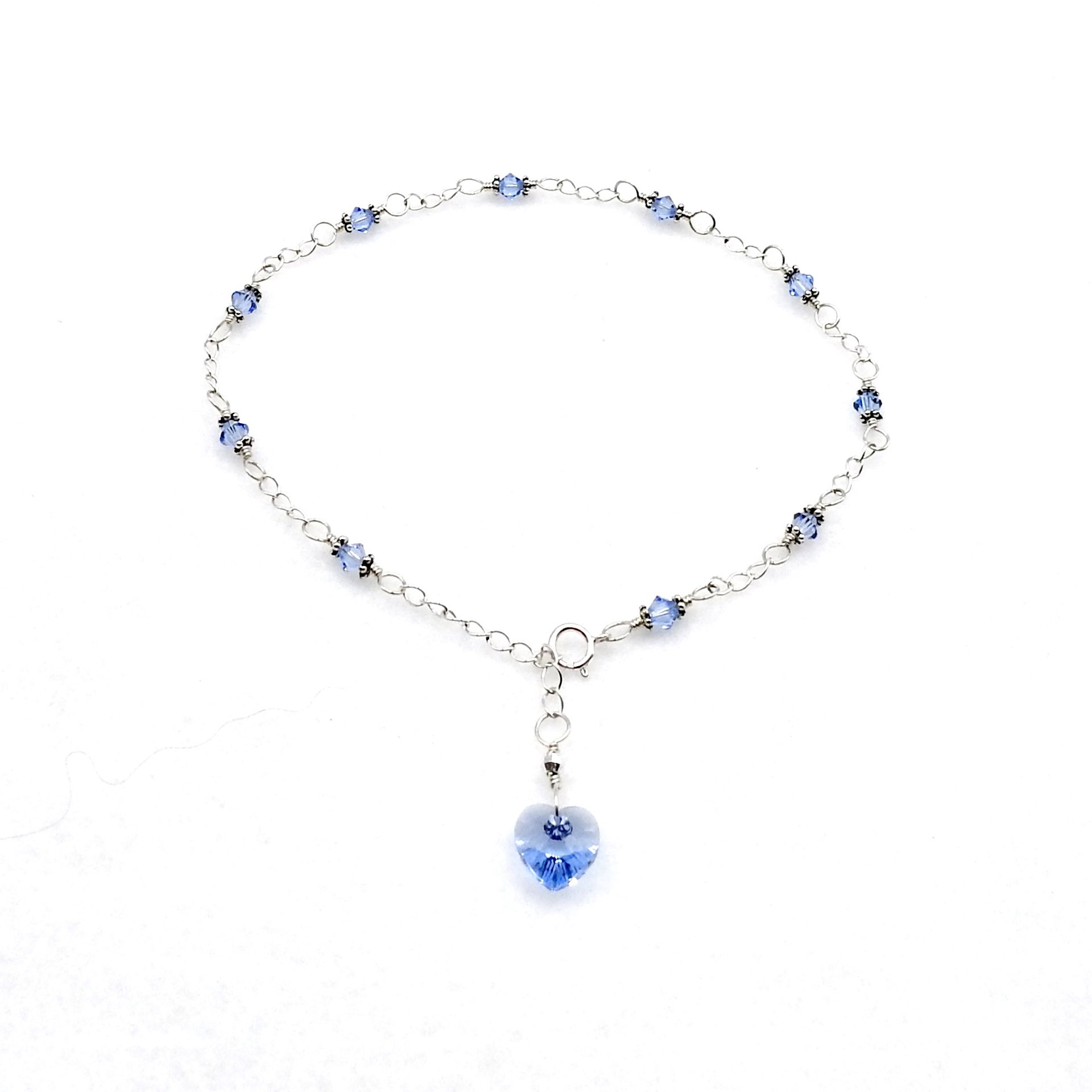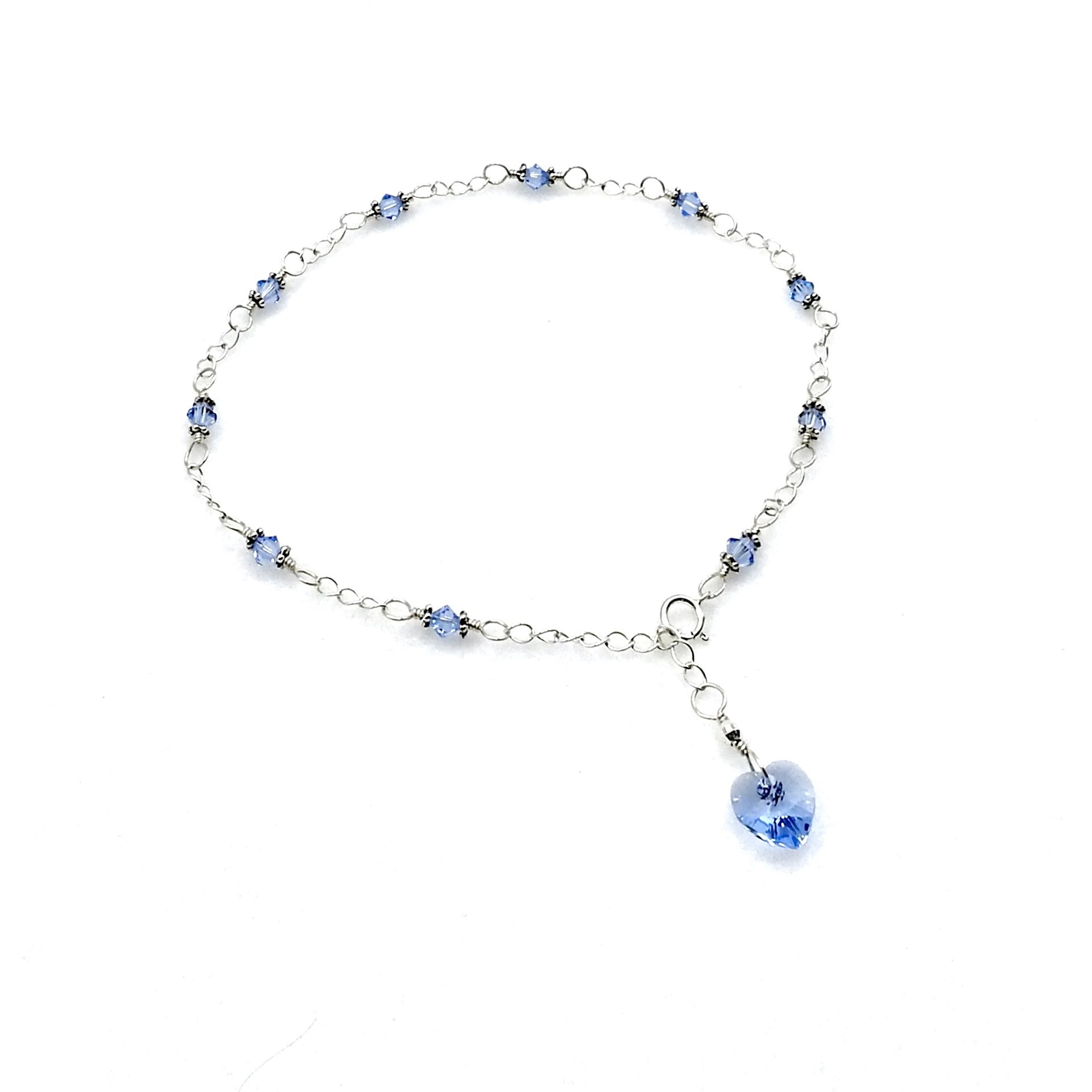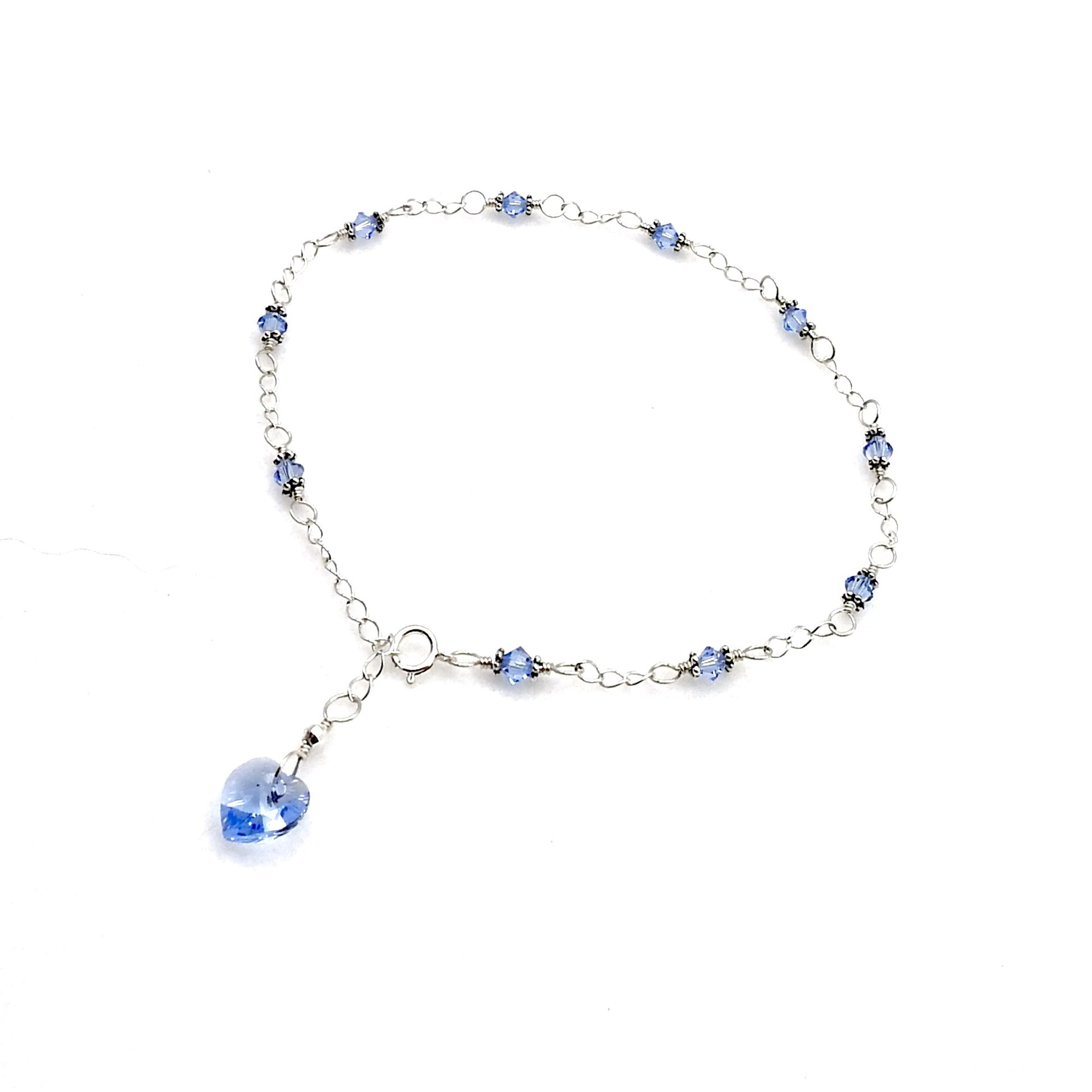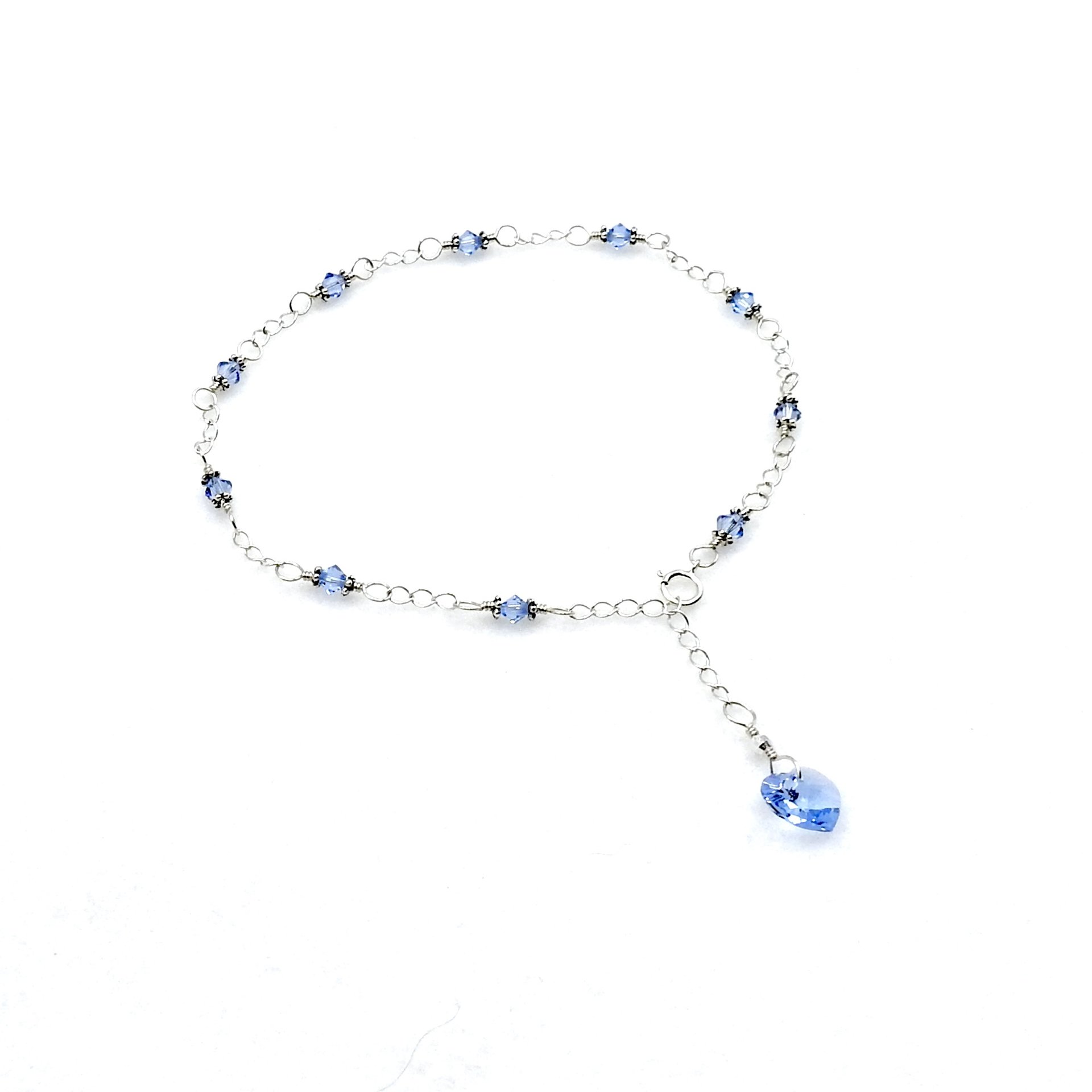 A delicate style adjustable anklet with light sapphire blue Swarovski Elements crystal beads and heart charm dangle.