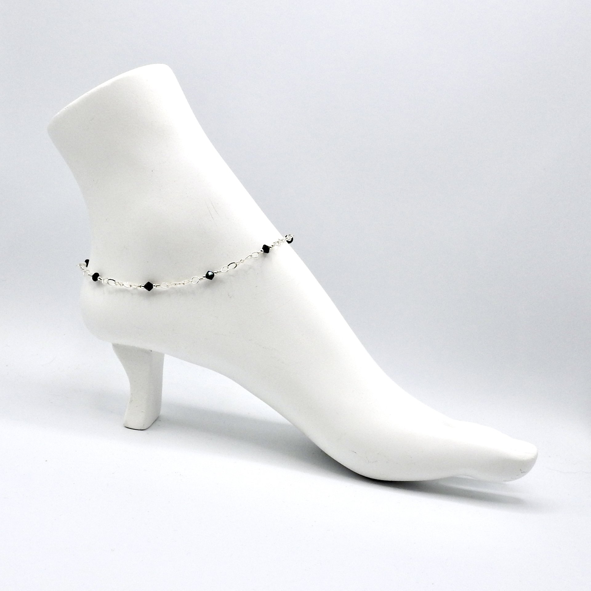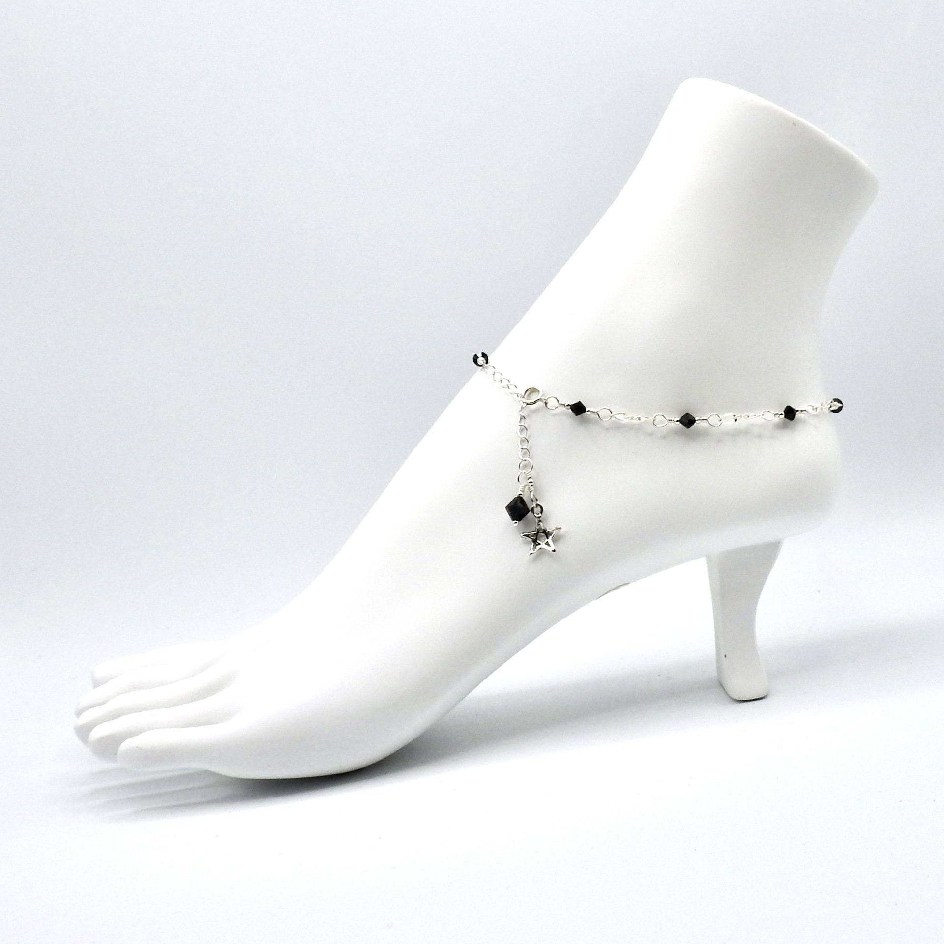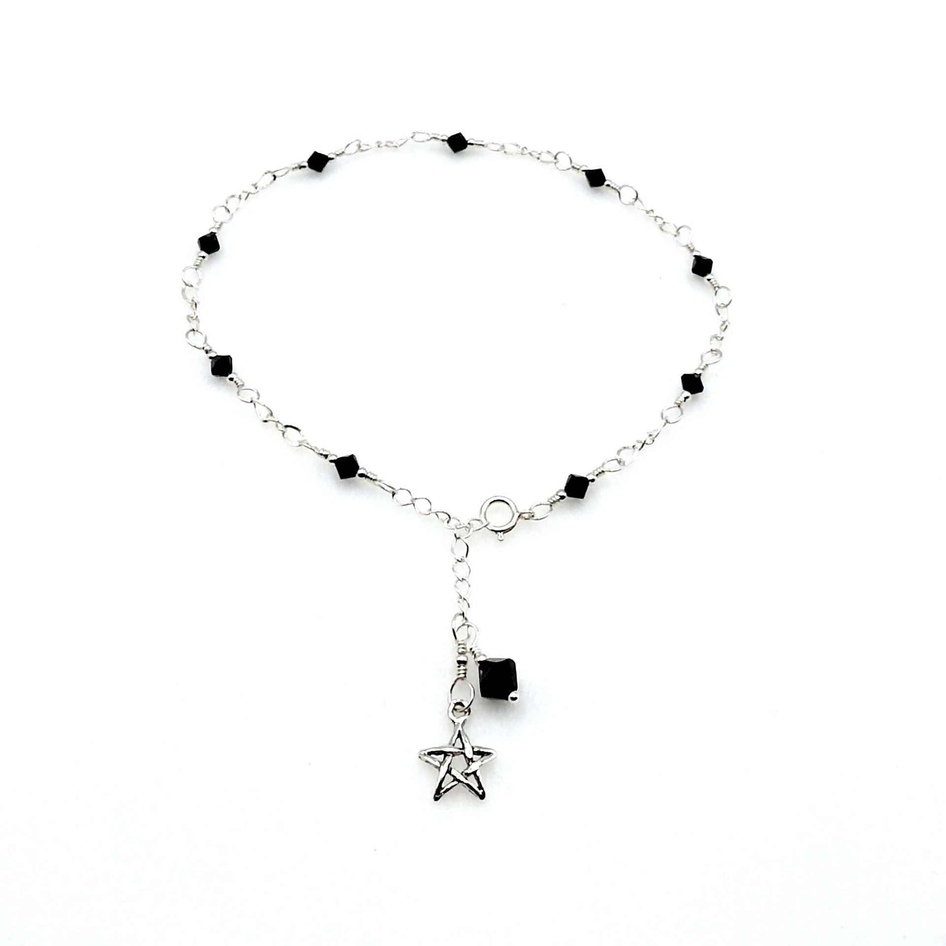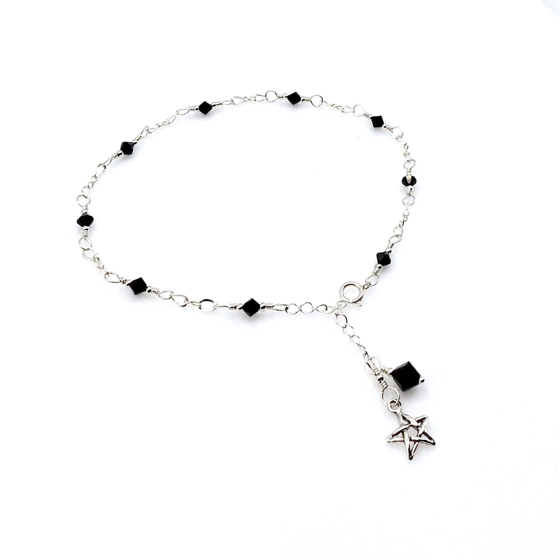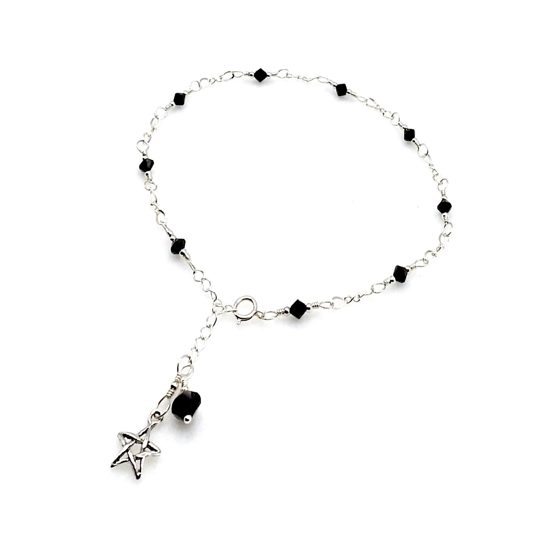 A delicate style adjustable anklet with jet black Swarovski Elements crystal beads and sterling star charm dangle.