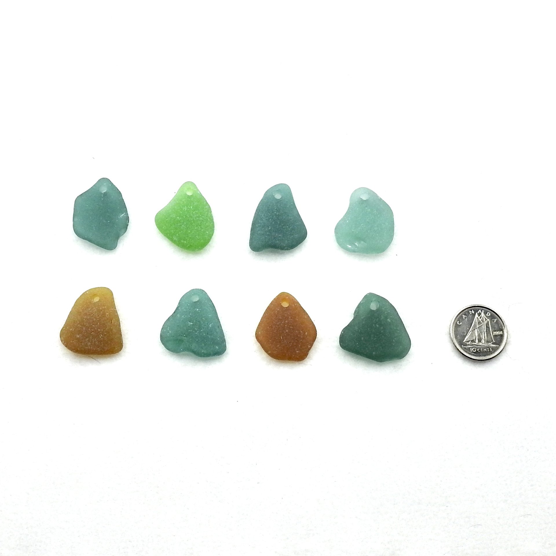 Real sea glass pendants, set of 8, with top drilled holes for jewelry making or other beached themed crafts.