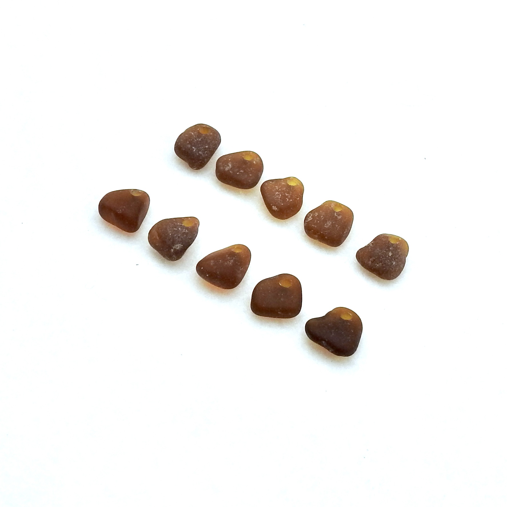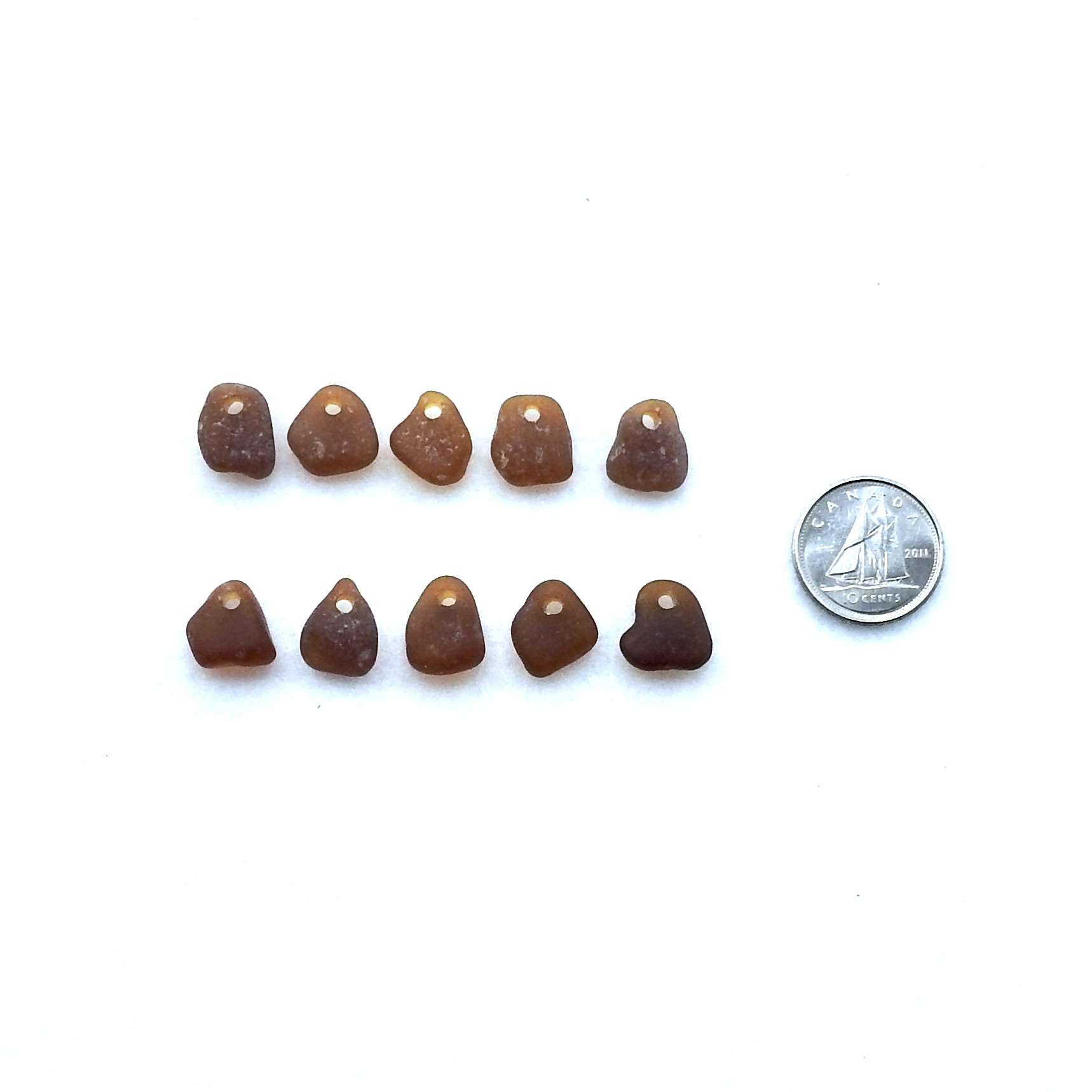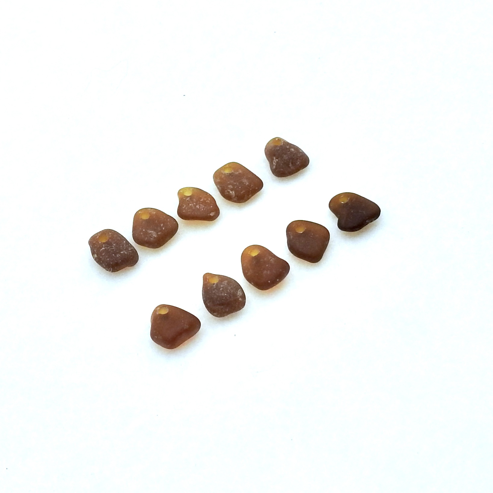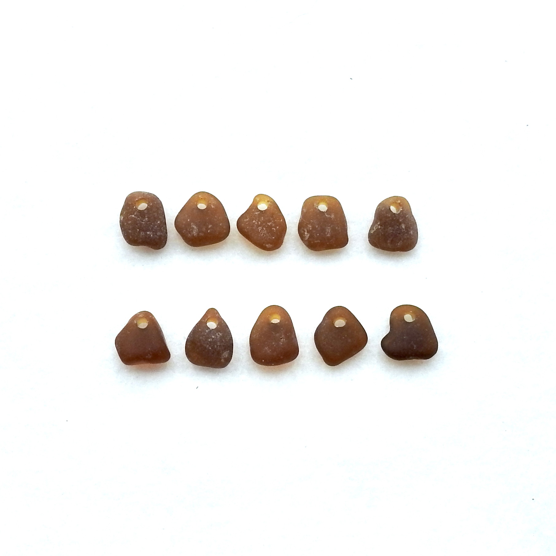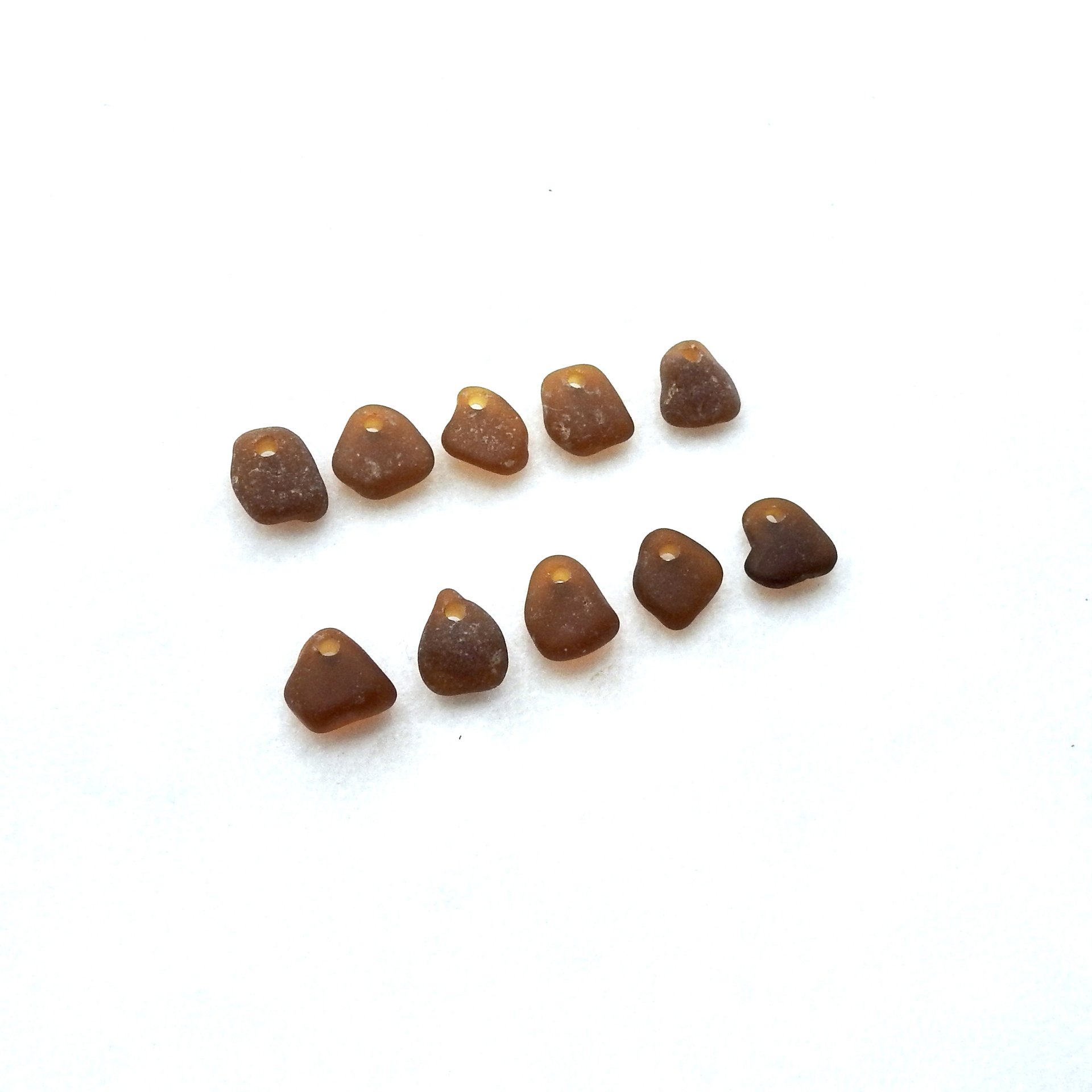 Tiny genuine sea glass charms, set of 10, in shades of brown with top drilled holes for jewelry making, sew on fringe or other beach themed crafts.