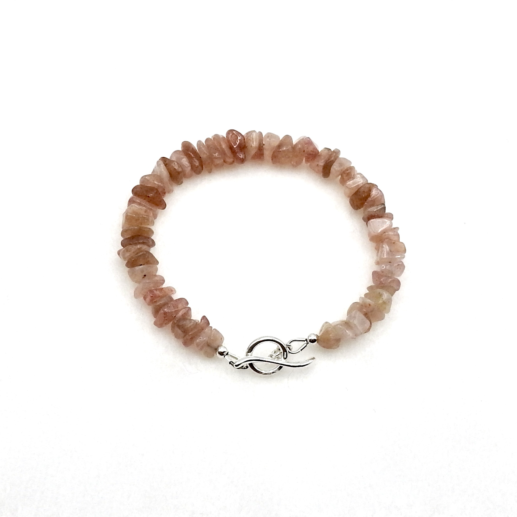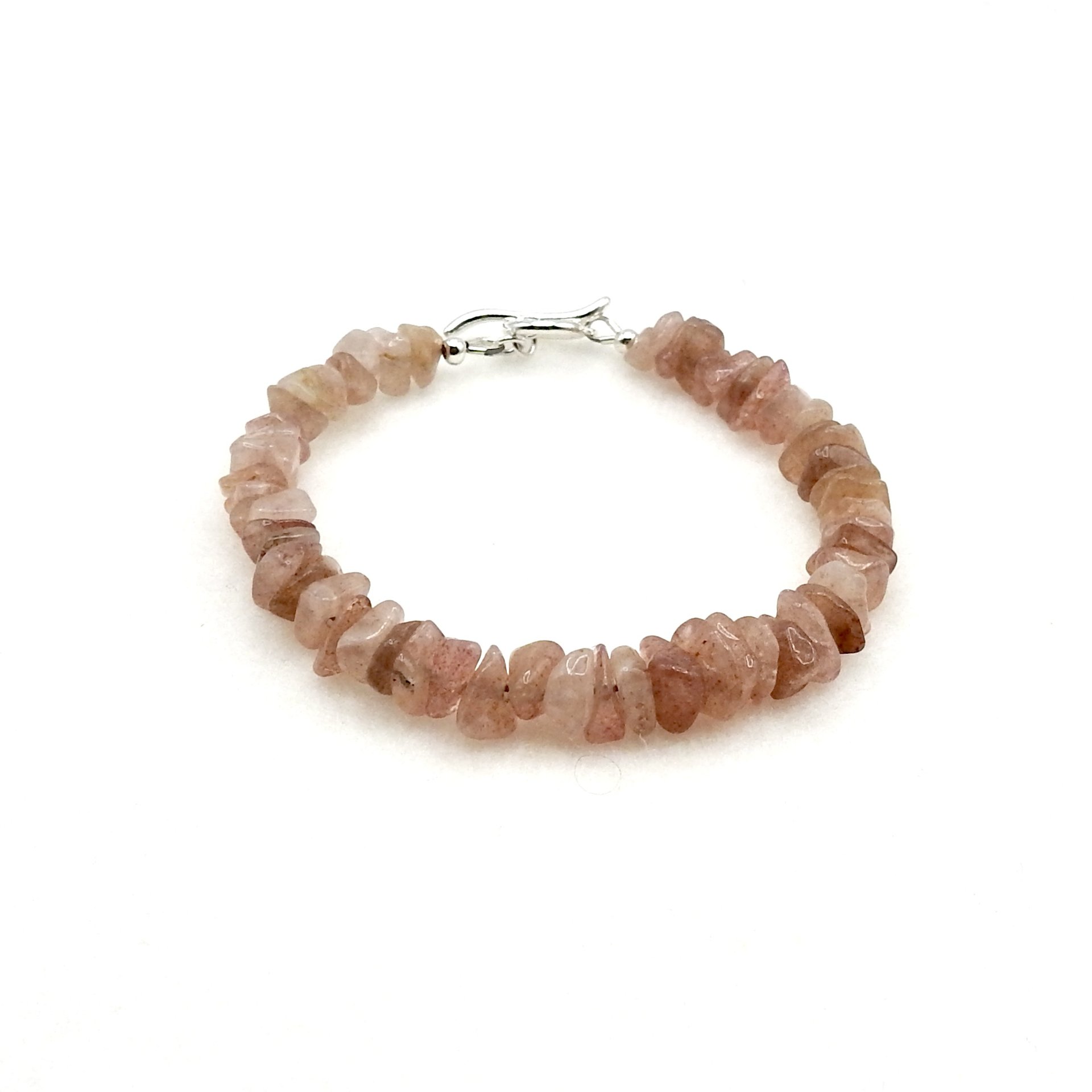 A delicate style bracelet with a silky feel, handmade with tiny strawberry quartz gemstone beads and a sterling silver curve design toggle clasp.