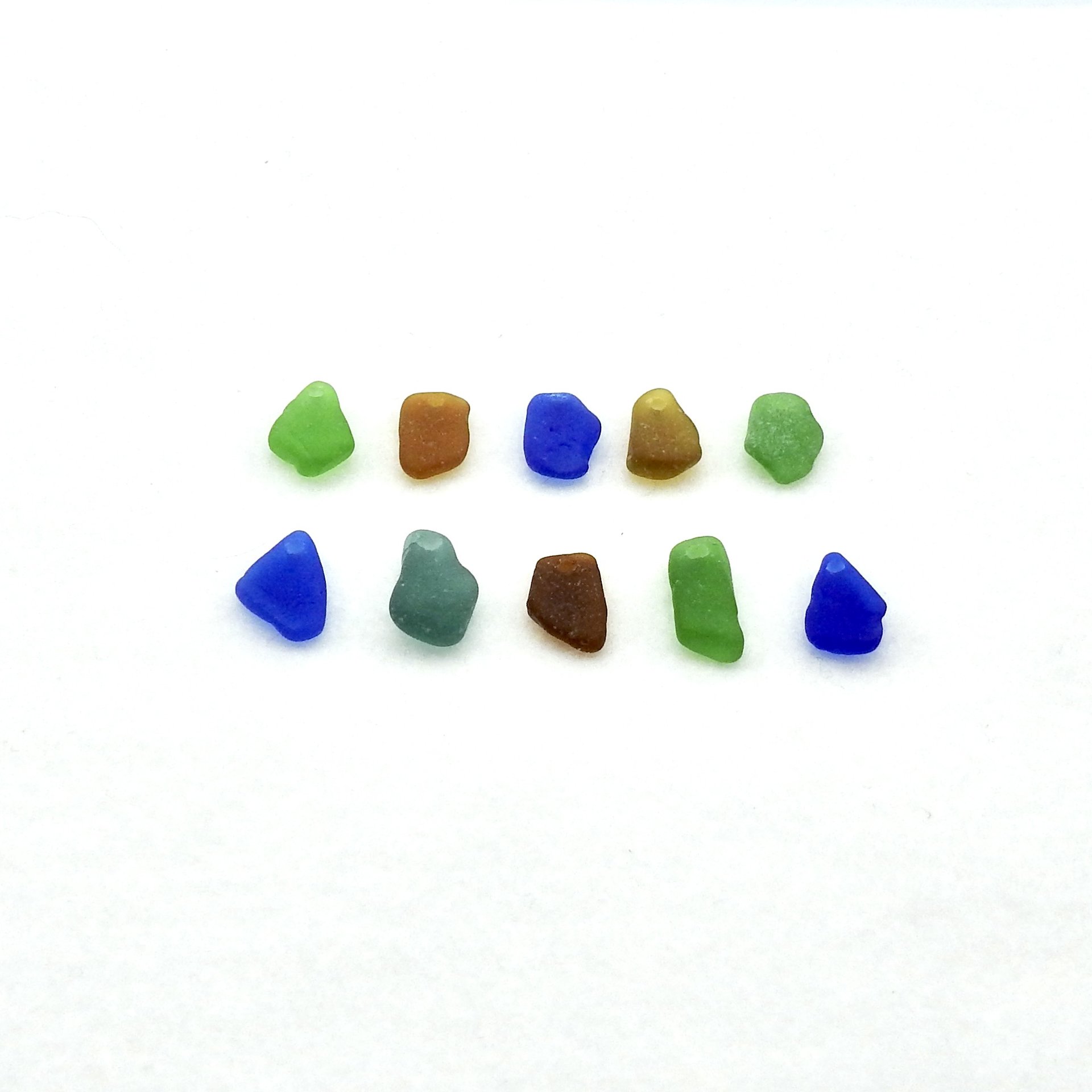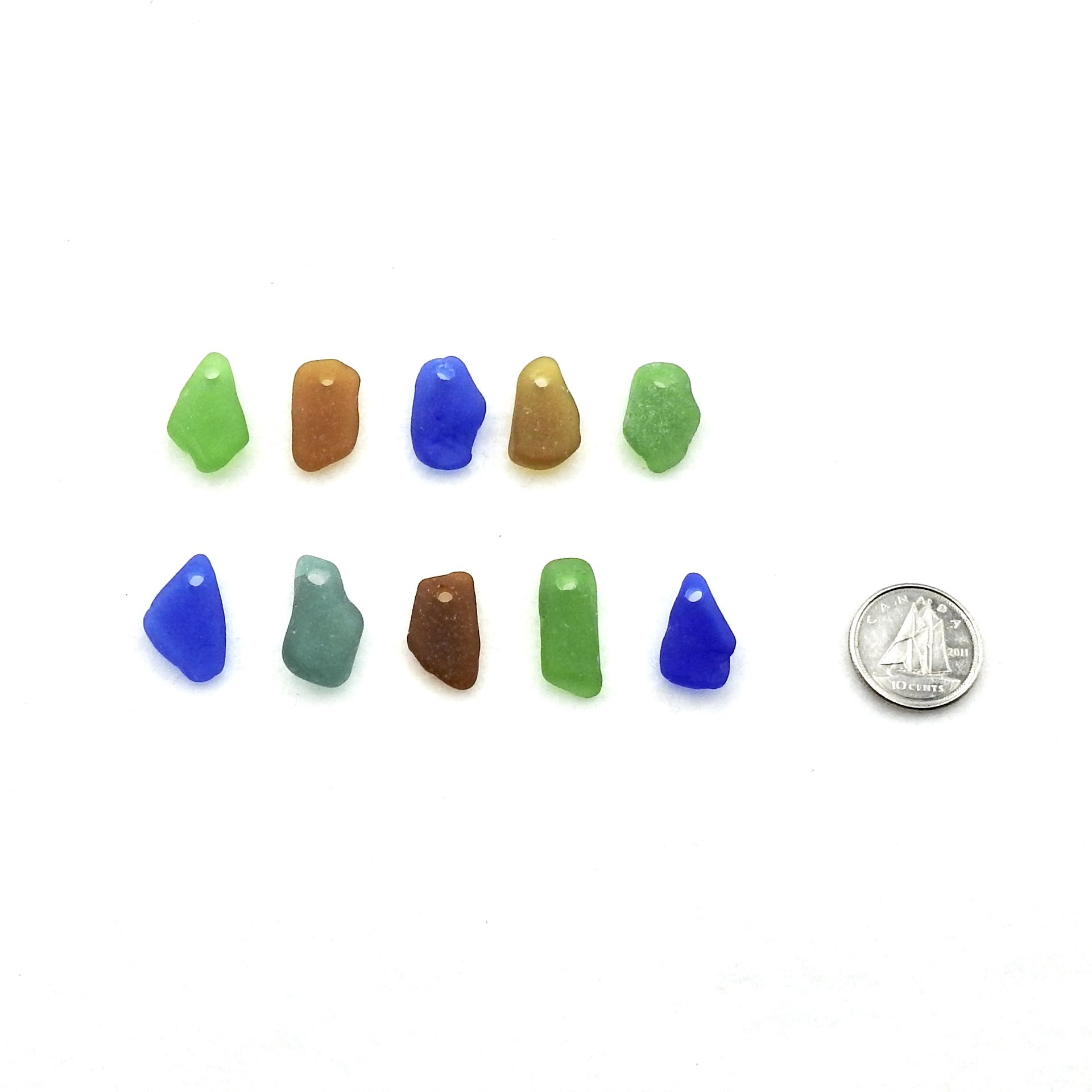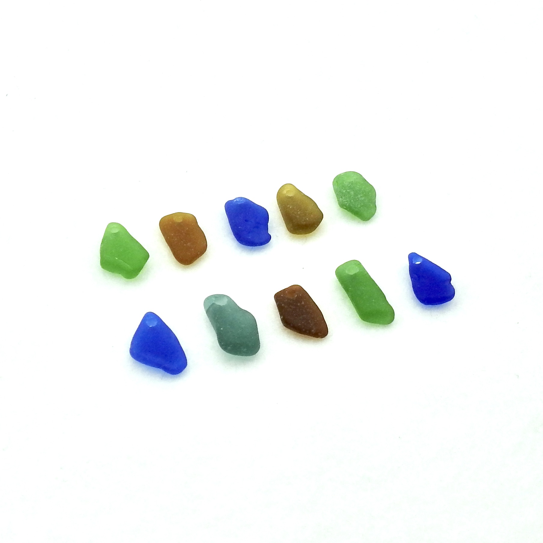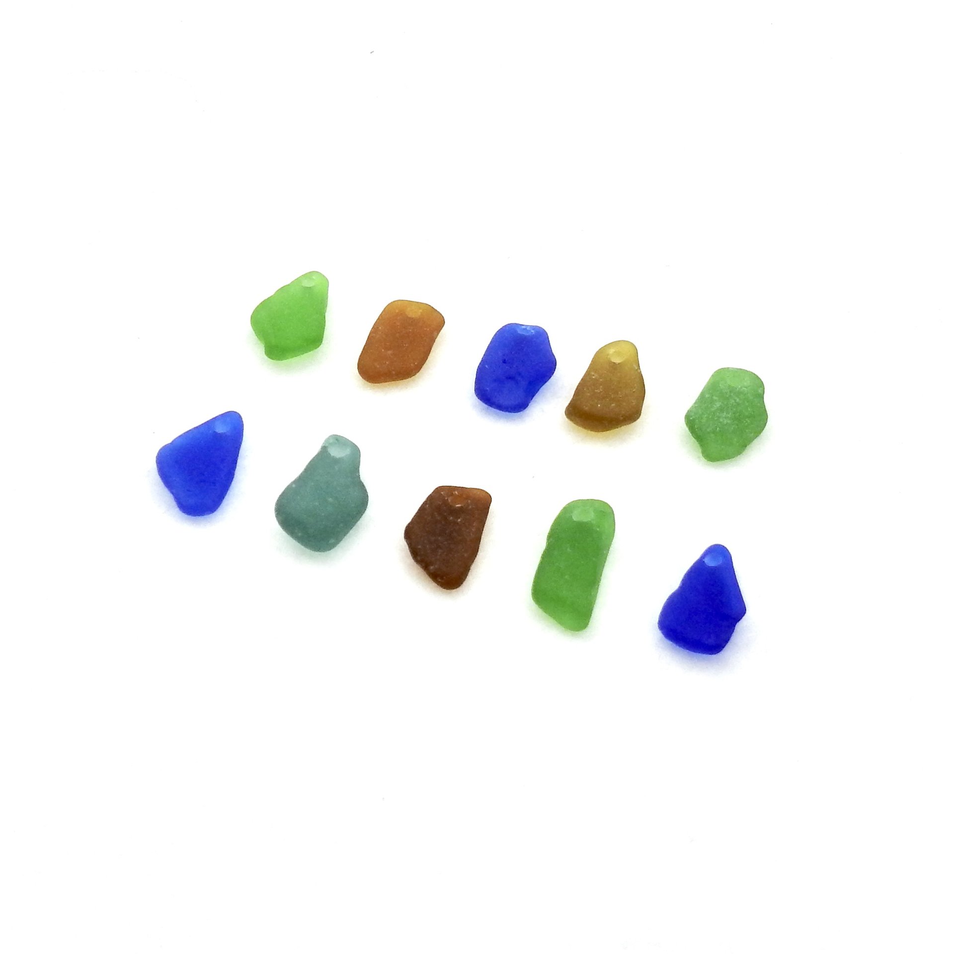 Genuine sea glass charms, set of 10, in assorted colours with top drilled holes for jewelry making or other beach themed crafts.