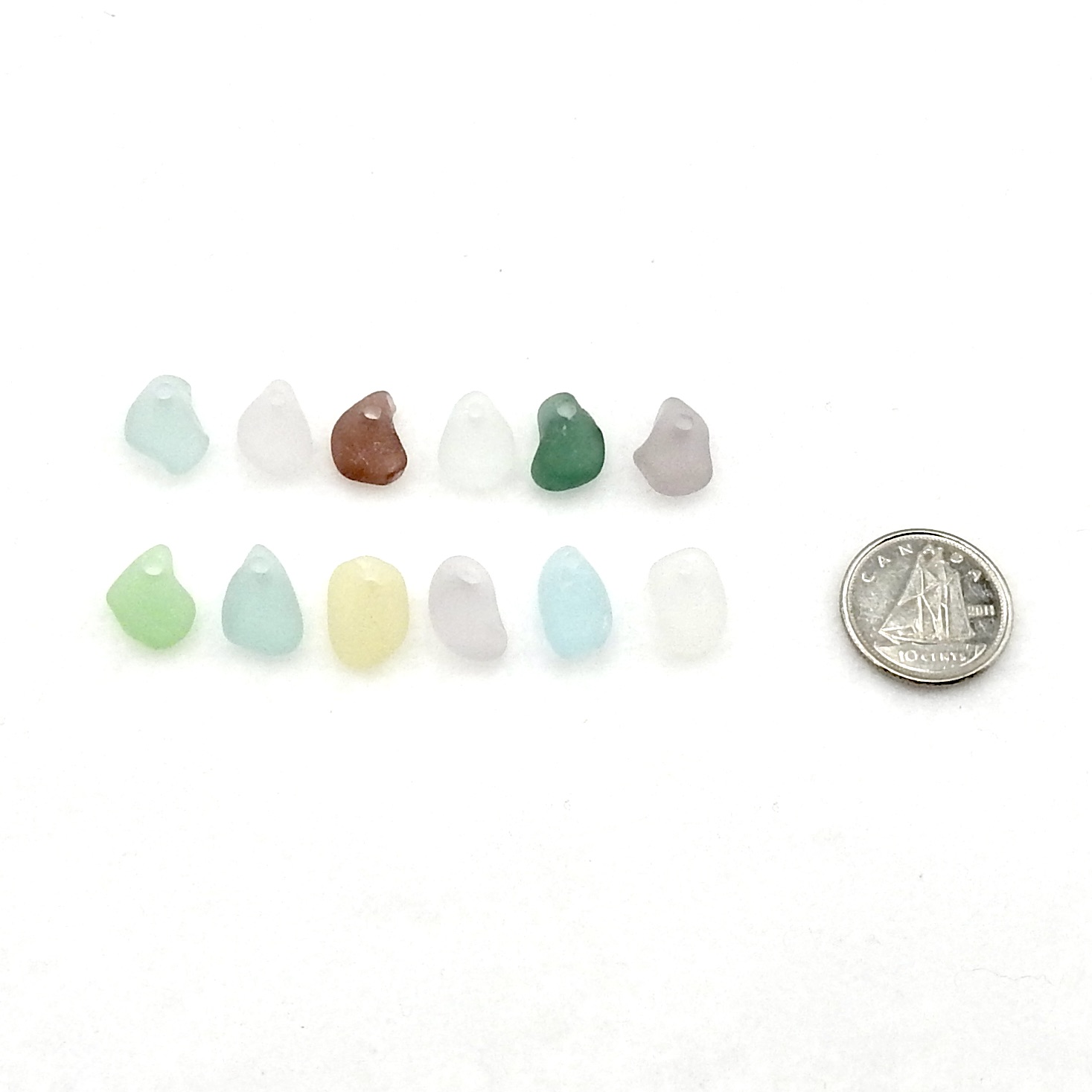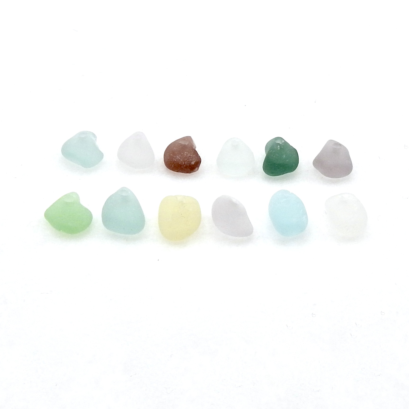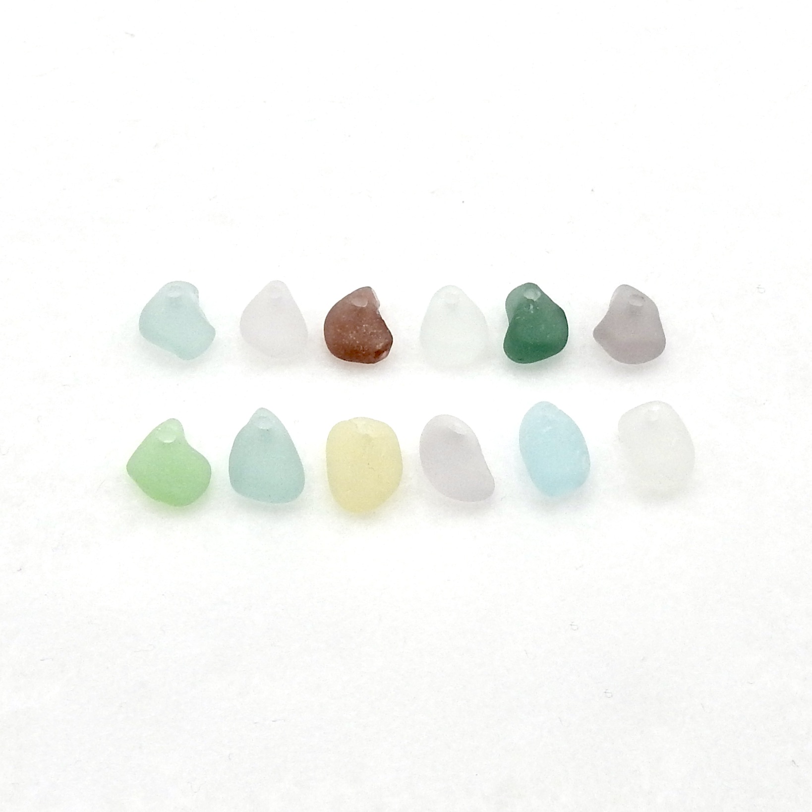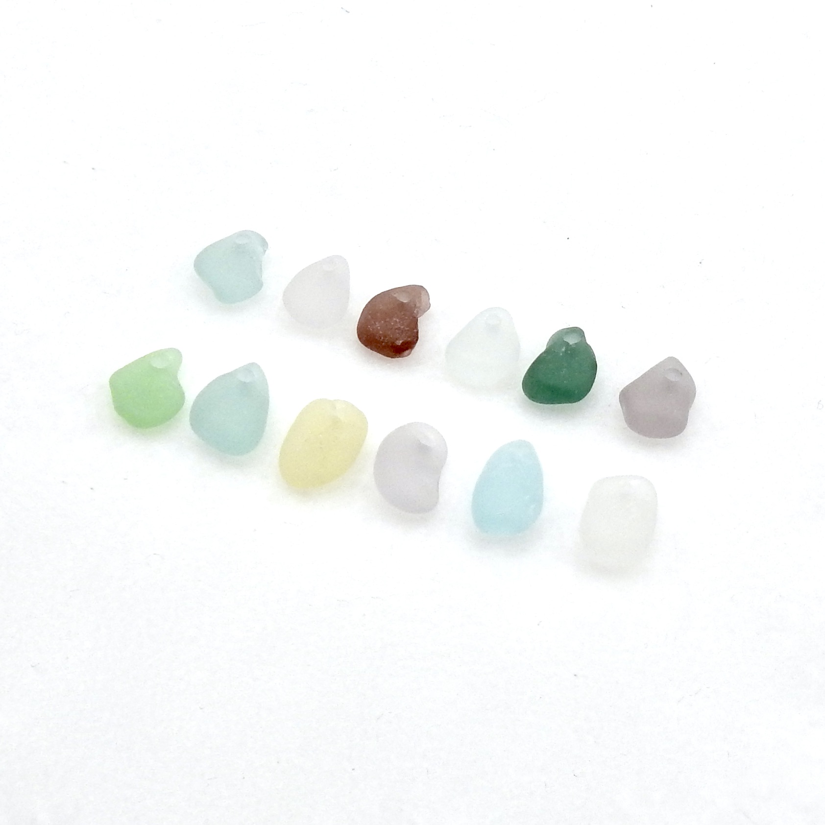 Genuine sea glass charms, set of 12, with top drilled holes for jewelry making or other beach themed crafts.