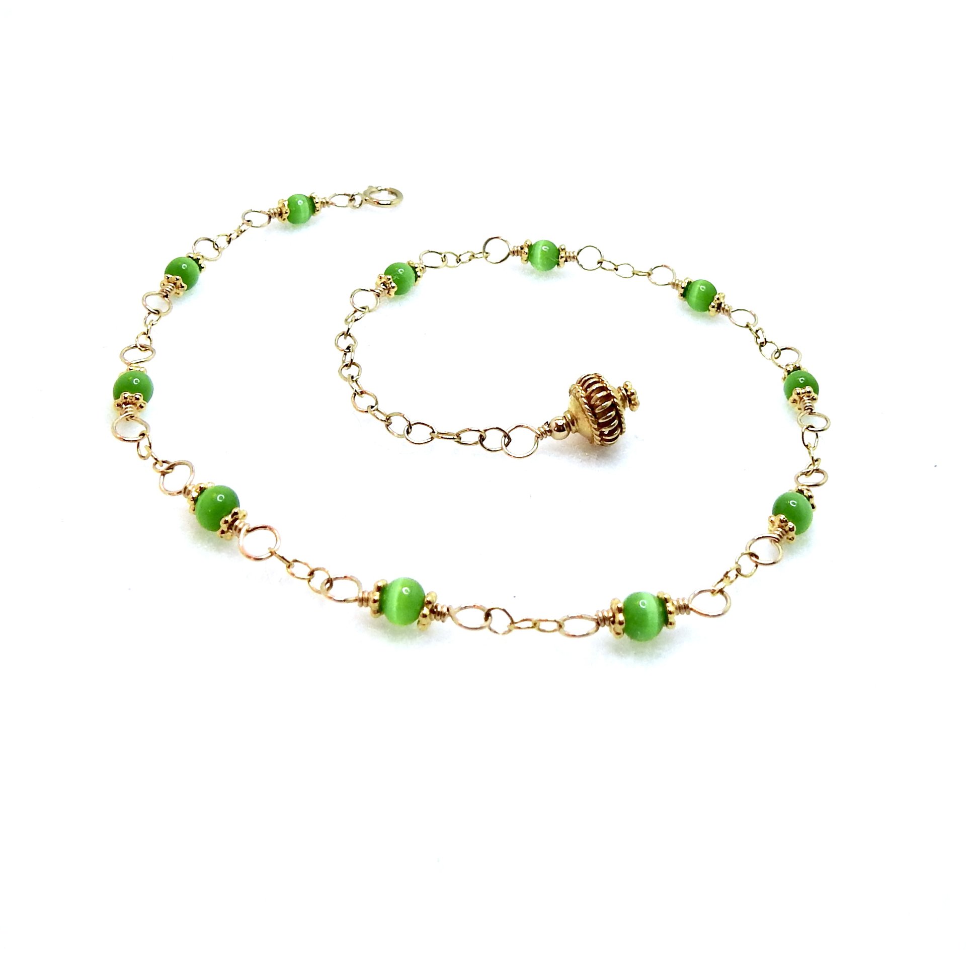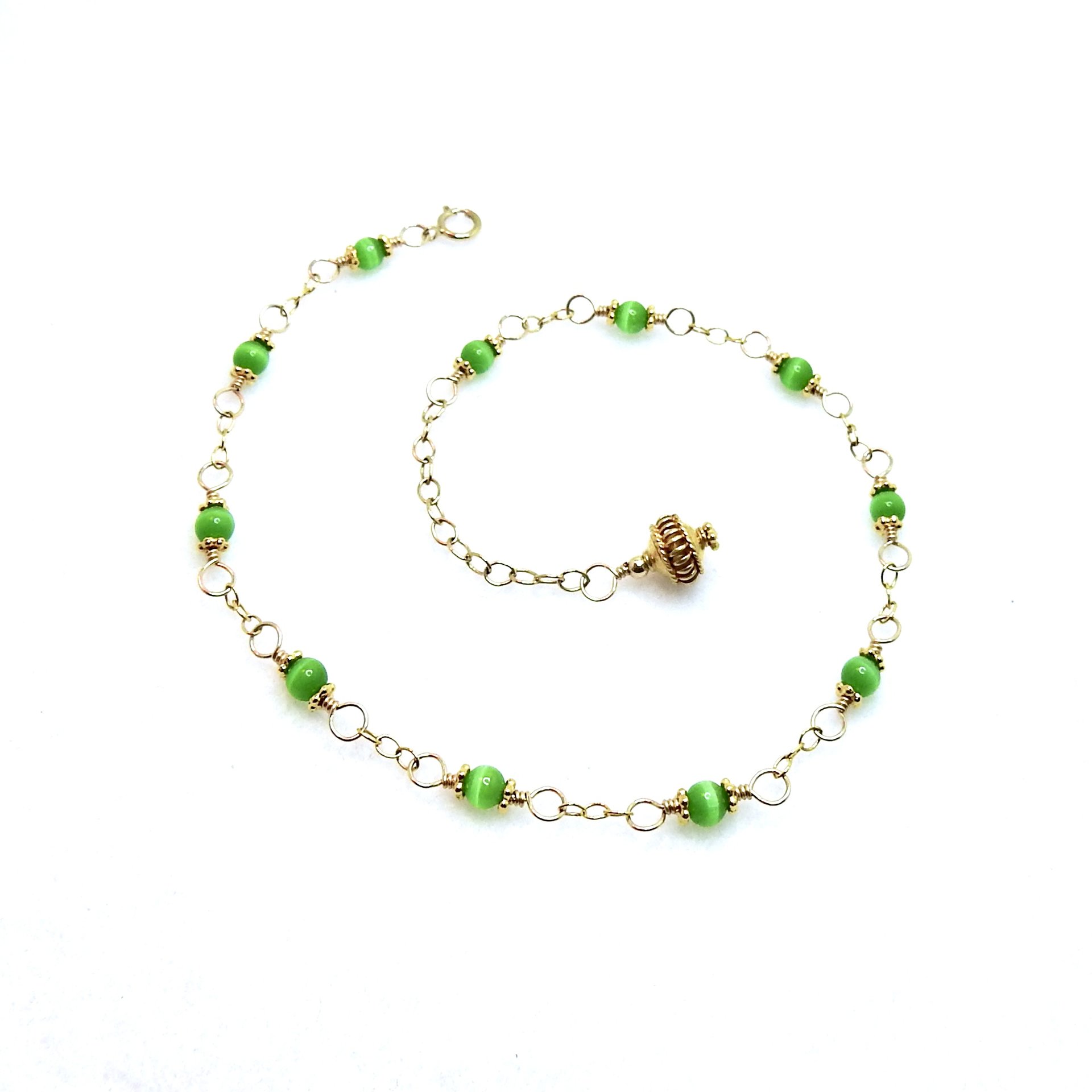 A bright green anklet for women, handmade with tiny cat's eye beads and an adjustable vermeil gold Bali bead dangle.