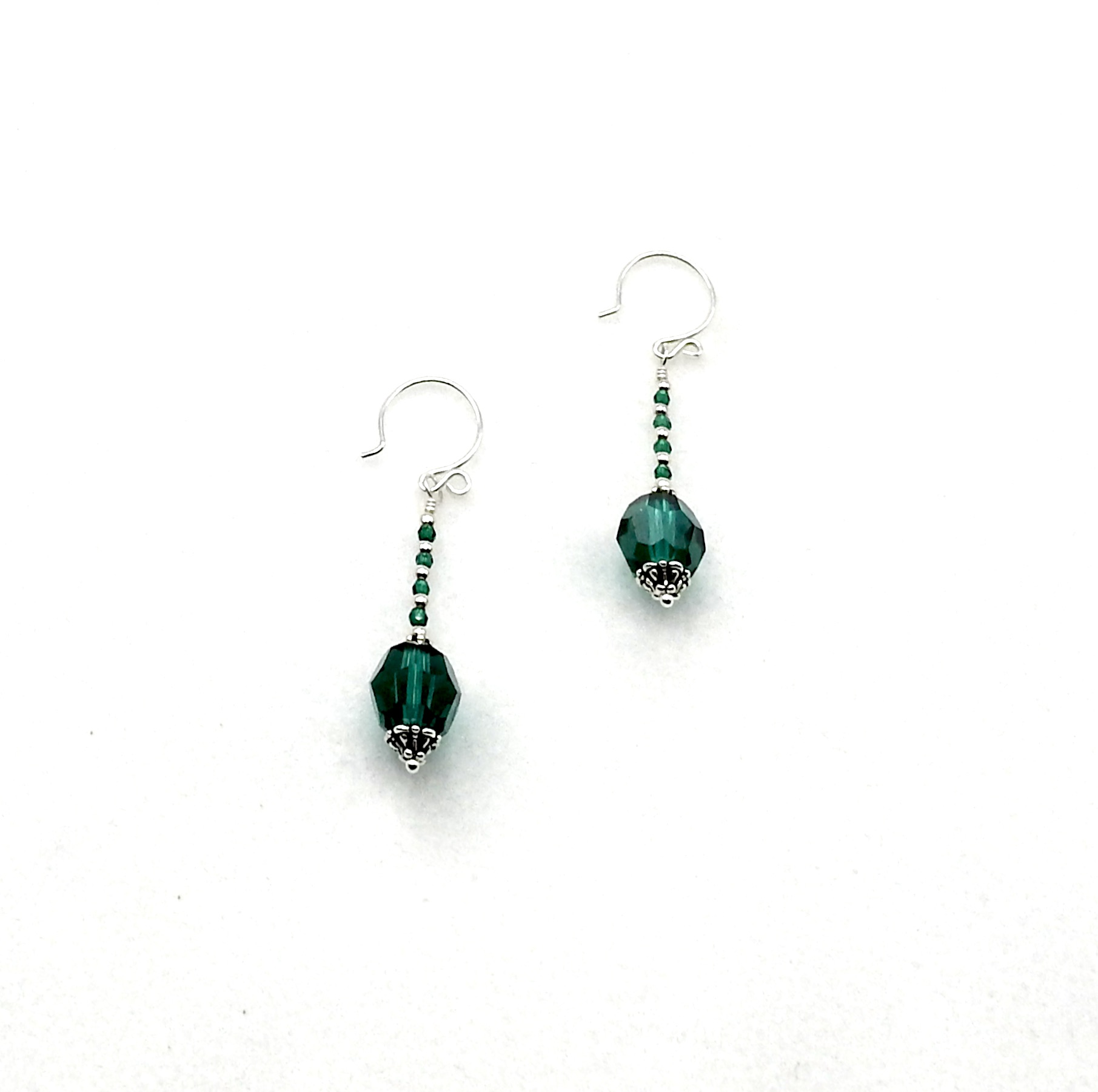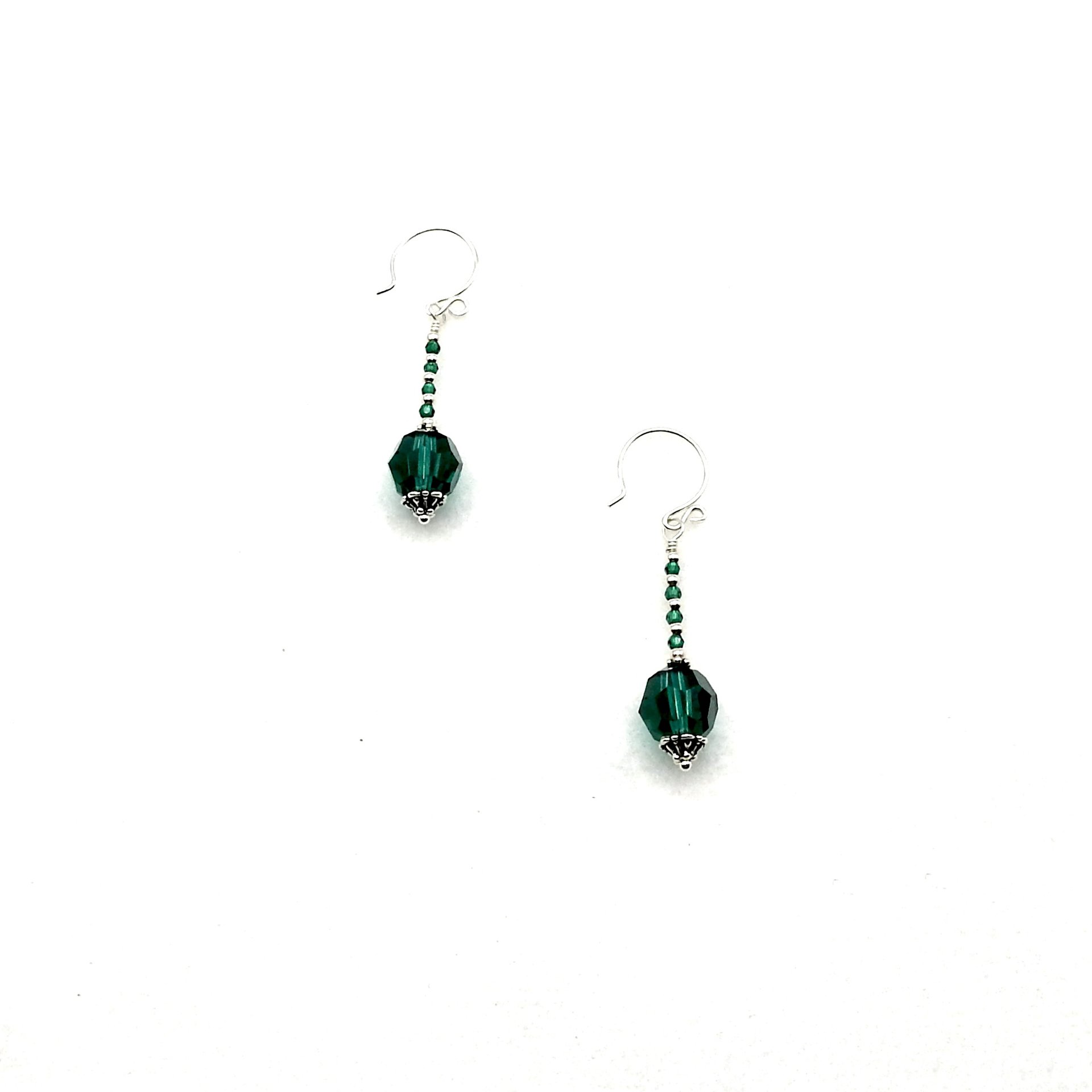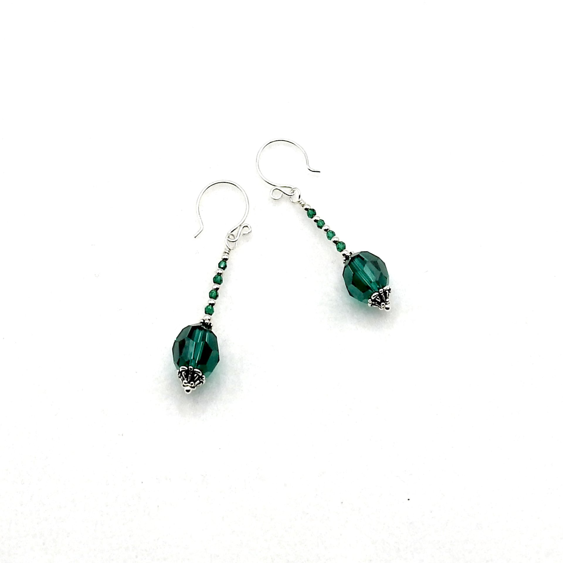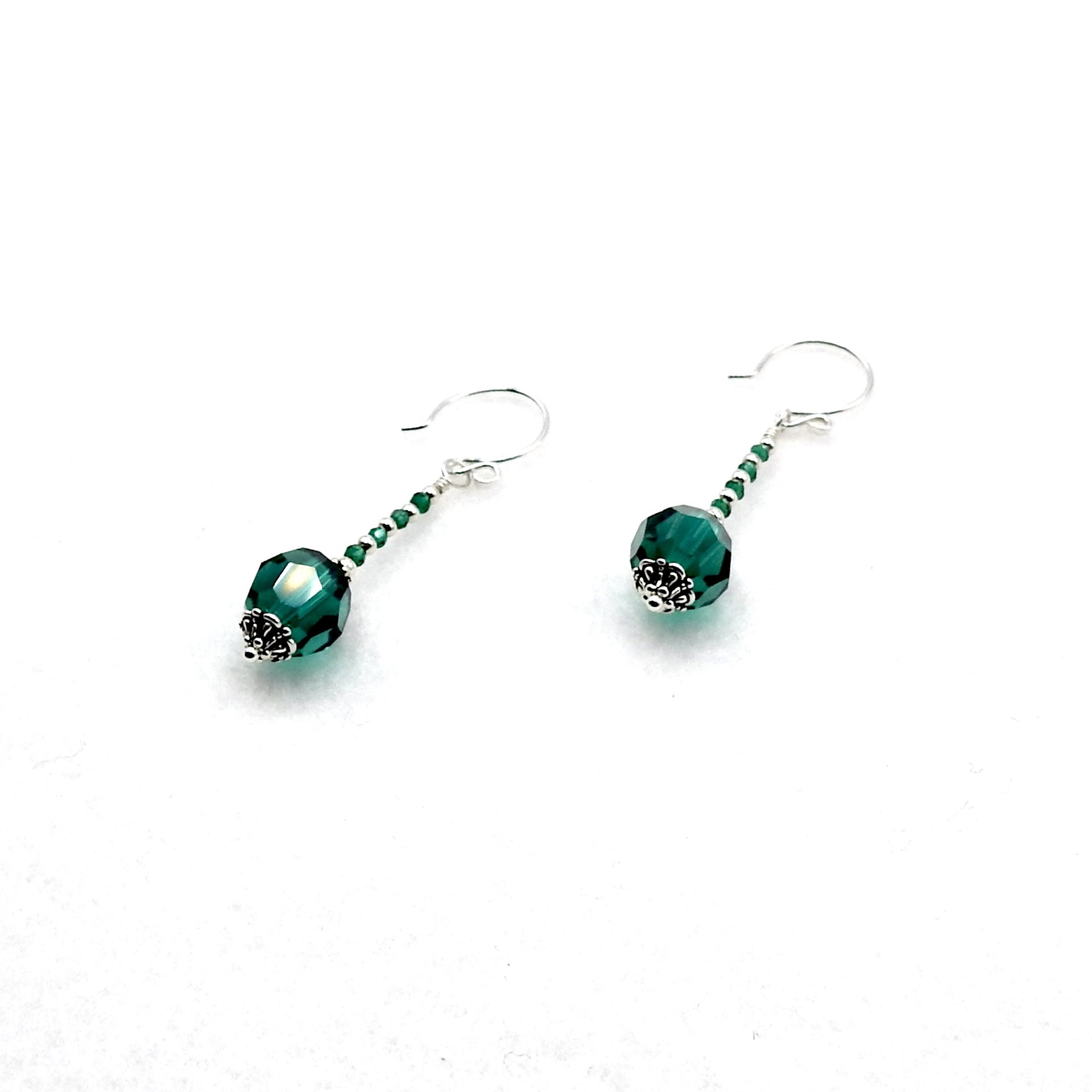 Emerald green silver beaded dangle earrings, handmade with Swarovski Elements crystal beads and round pierced ear wires.
