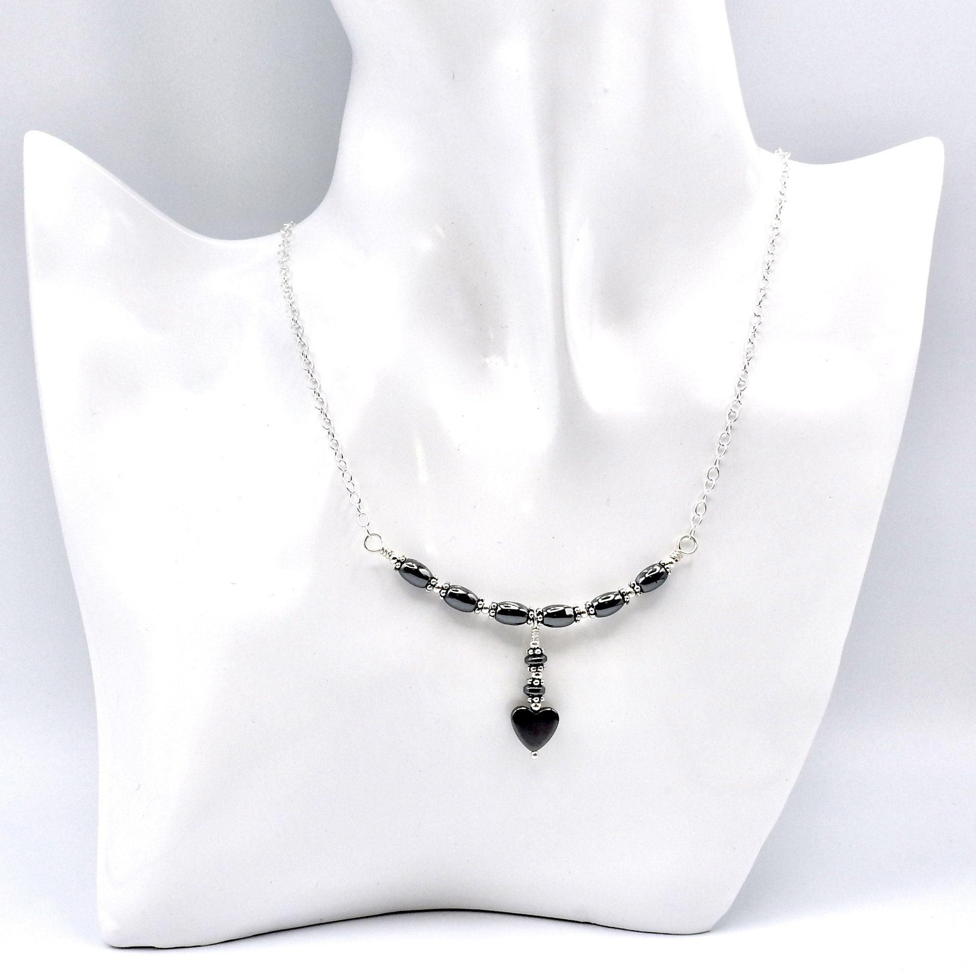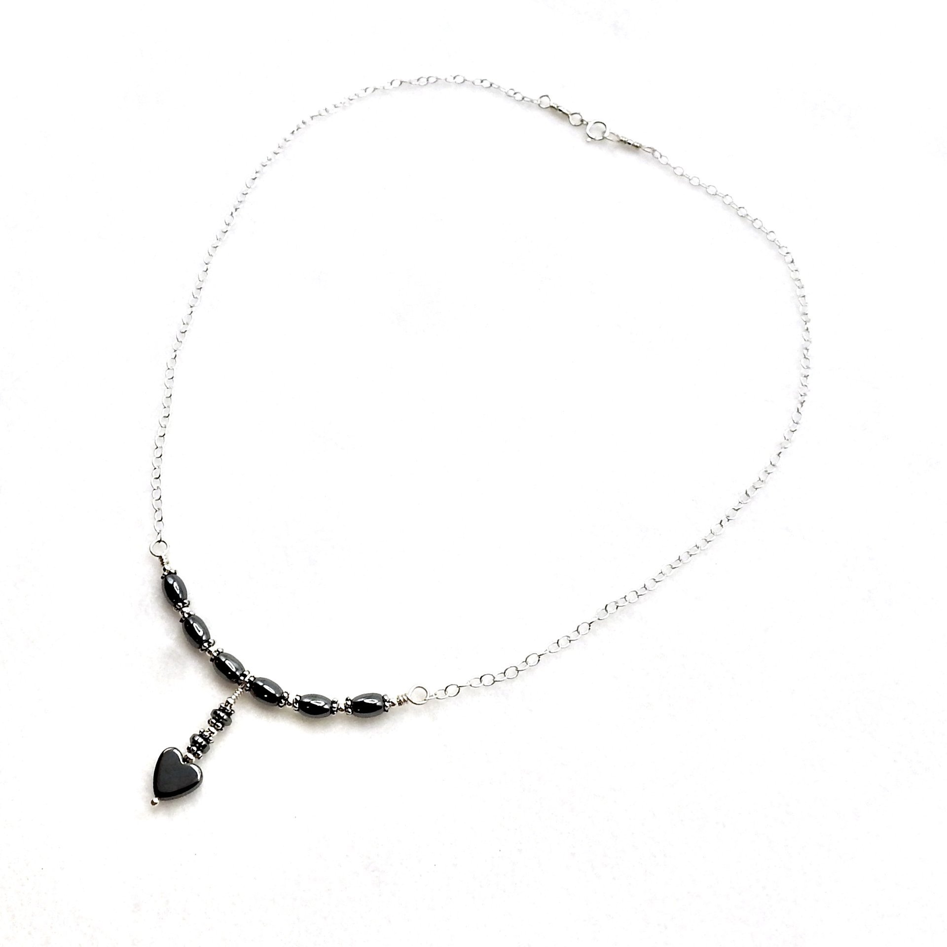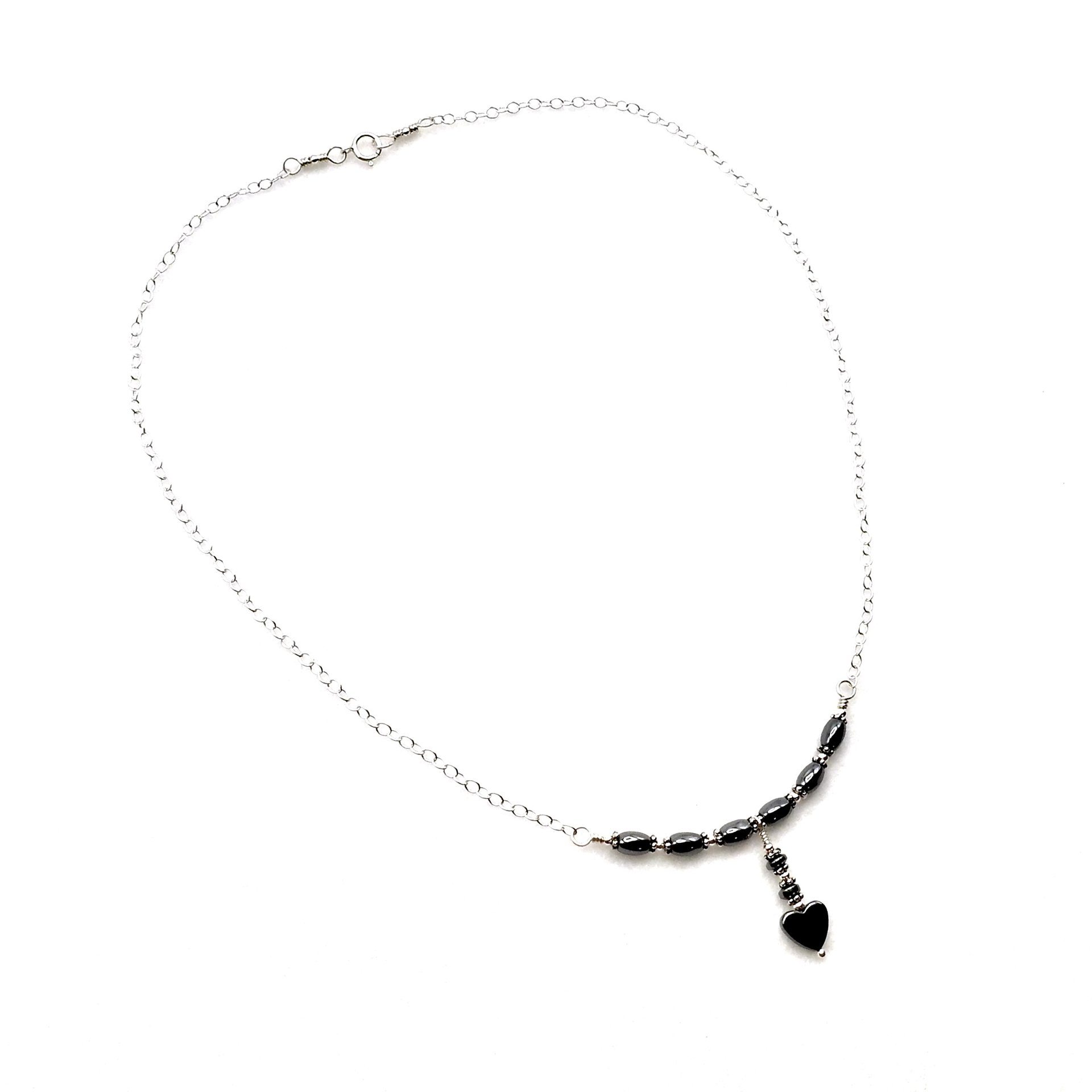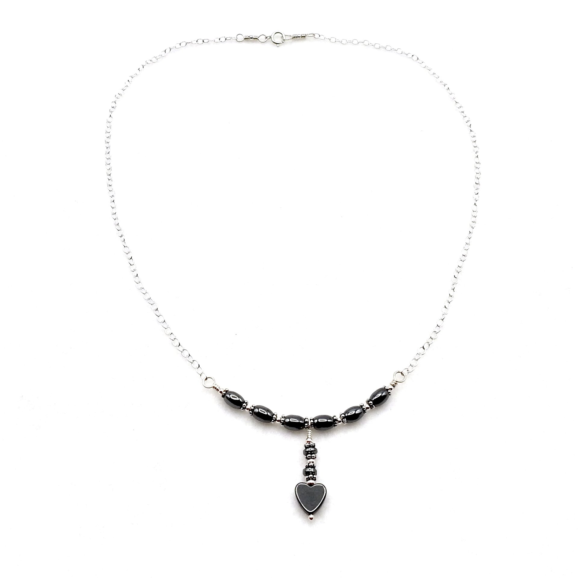 A delicate style necklace, handmade with tiny oval Hematite gemstone beads and a heart drop pendant.