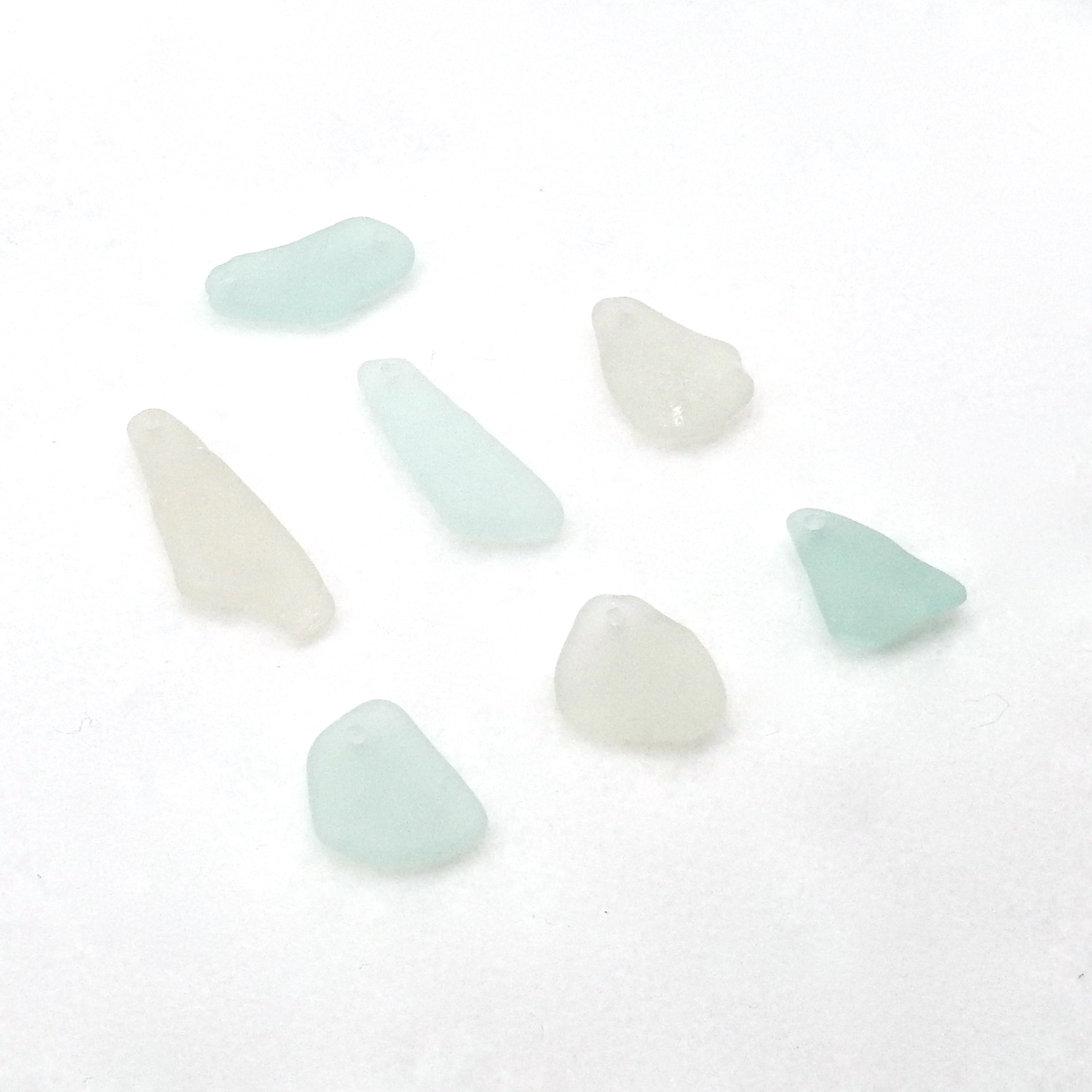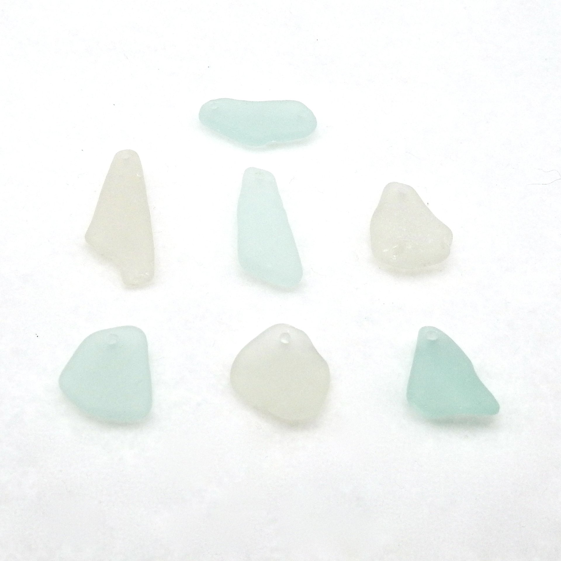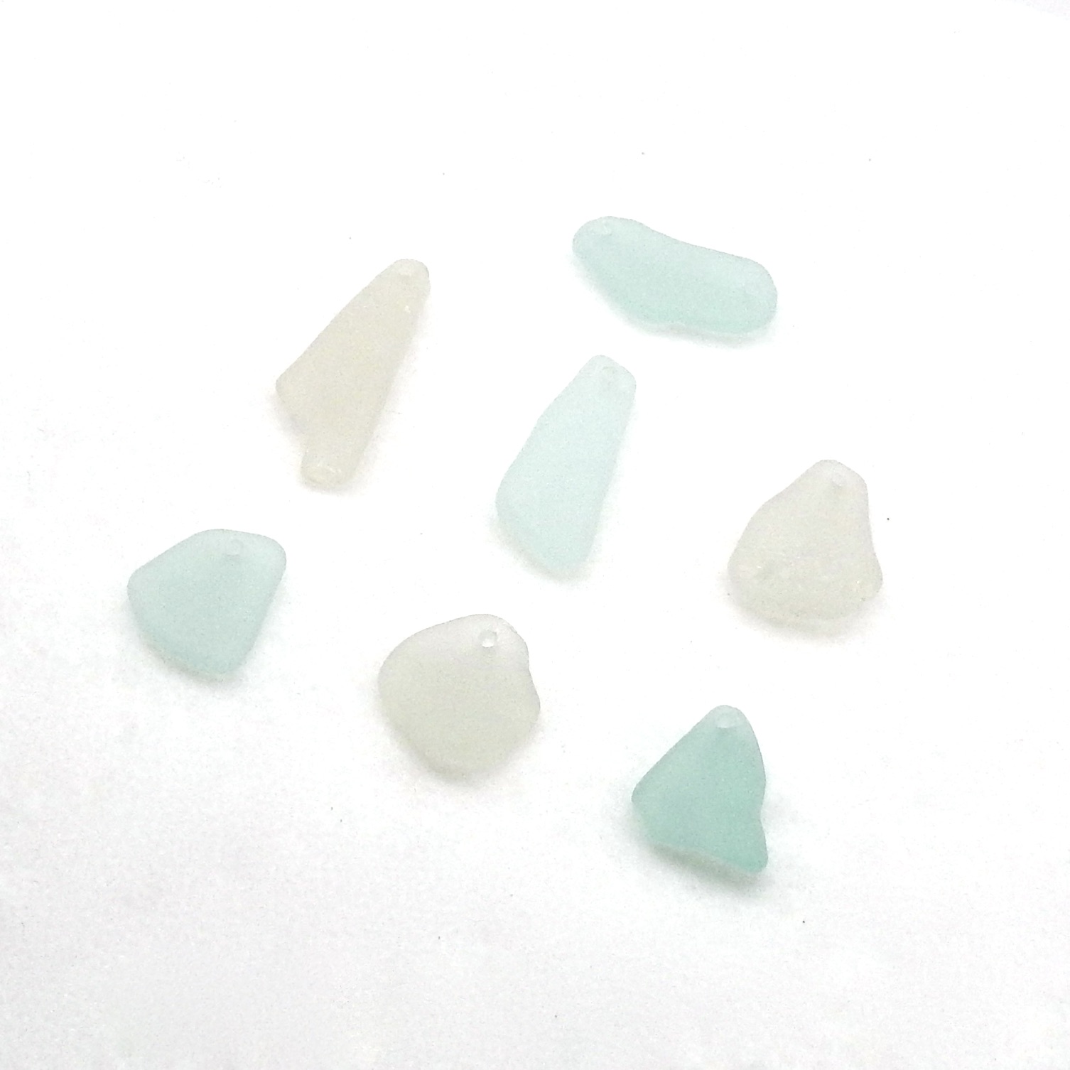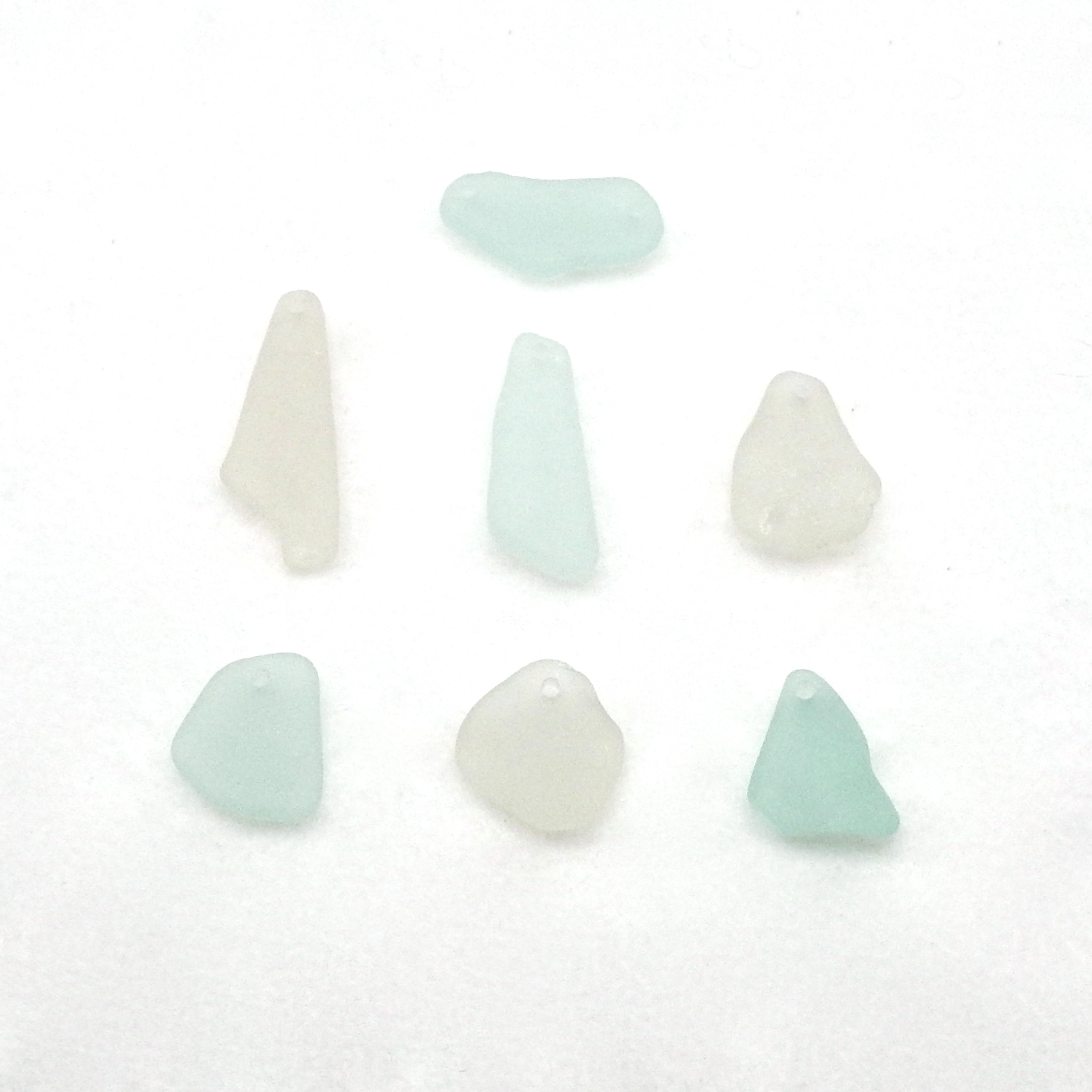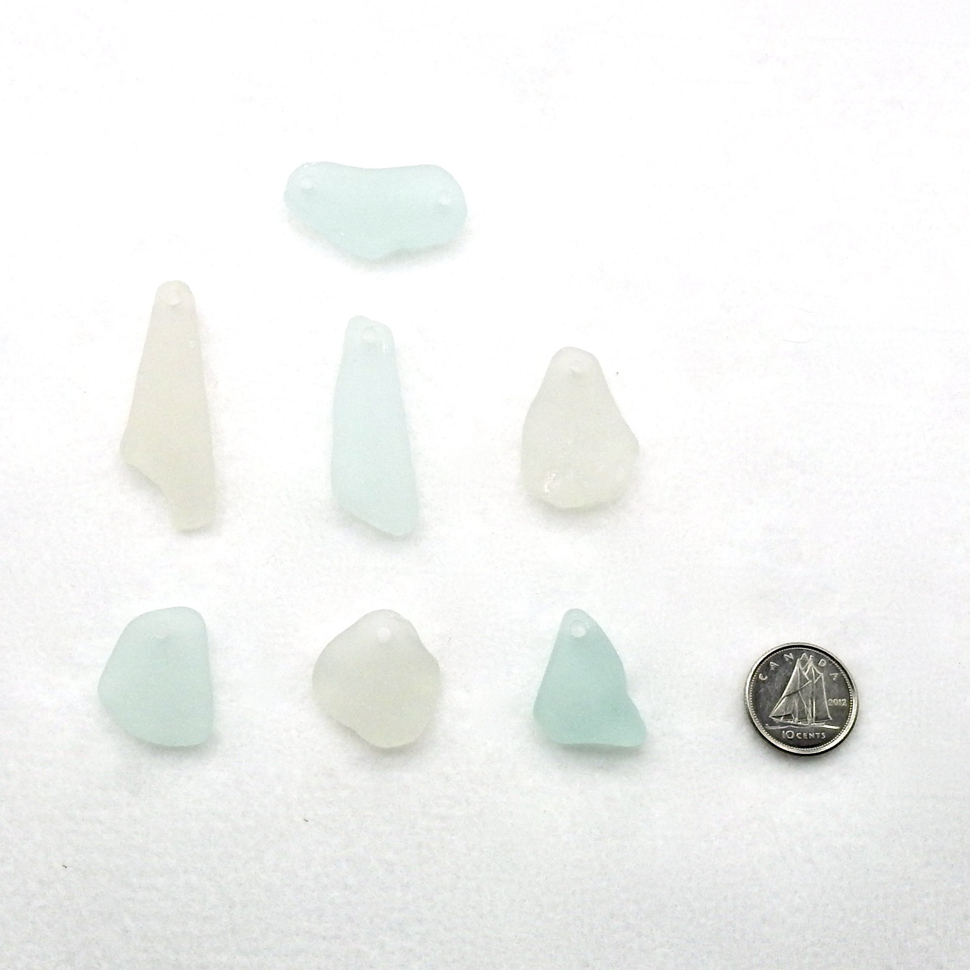 Genuine sea glass pendants, set of 7, in soft pastel colours with top drilled holes for jewelry making, keychains or other beach themed crafts.
