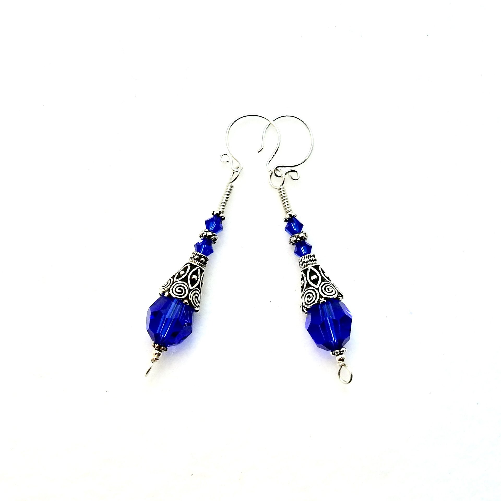 Long pierced dangle earrings, handmade with majestic blue Swarovski Elements crystal beads and decorative silver cones and caps.