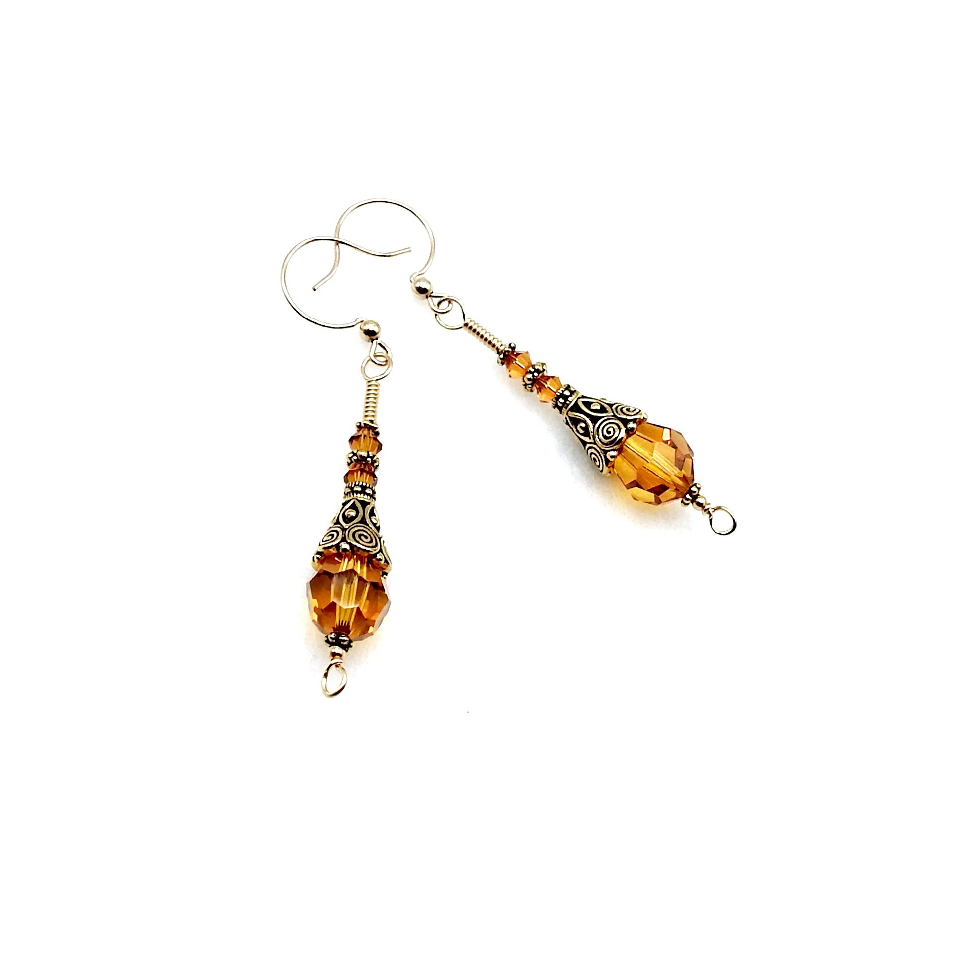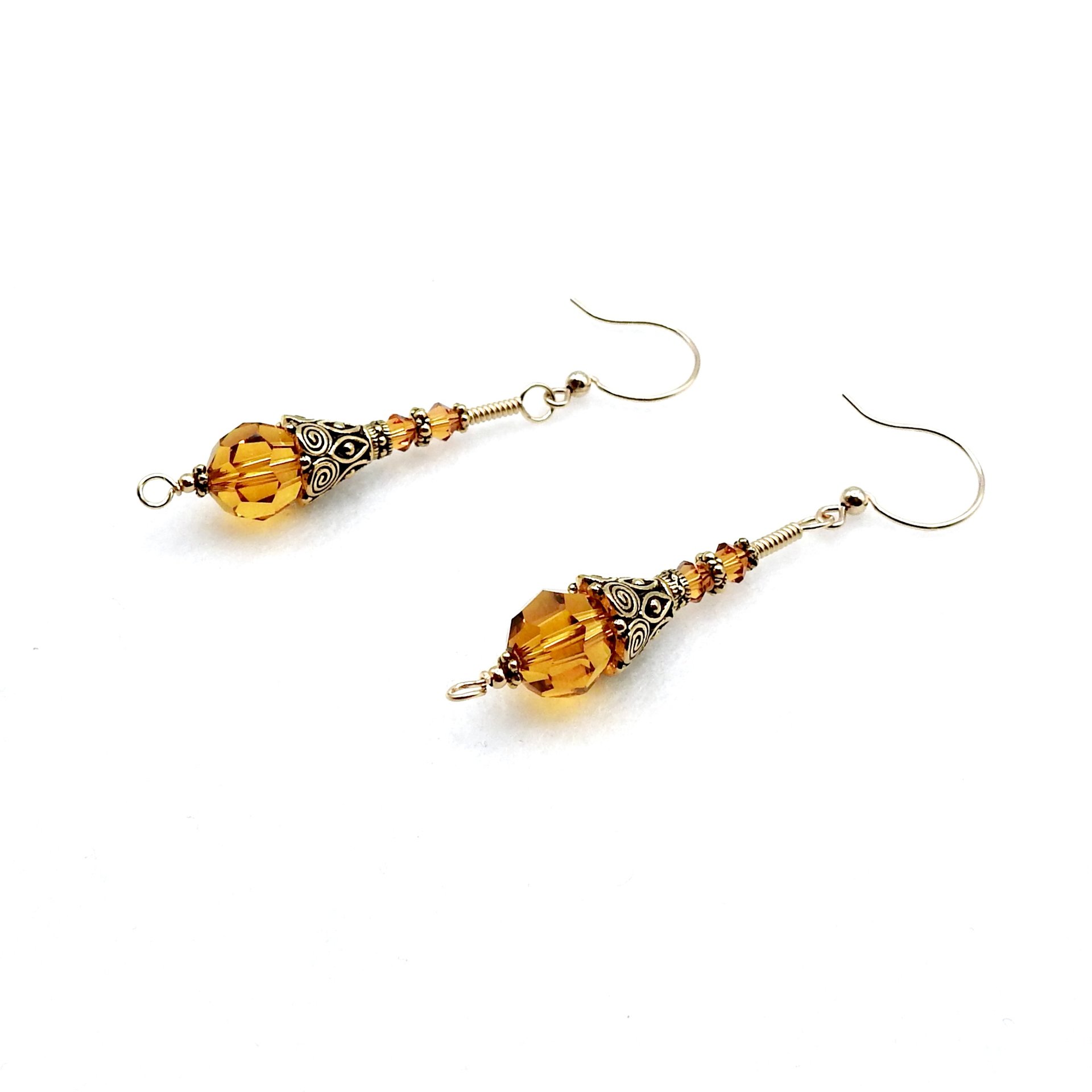 Long orange dangle earrings, handmade with Swarovski Elements topaz crystal beads and decorative gold cones with round pierced ear wires.