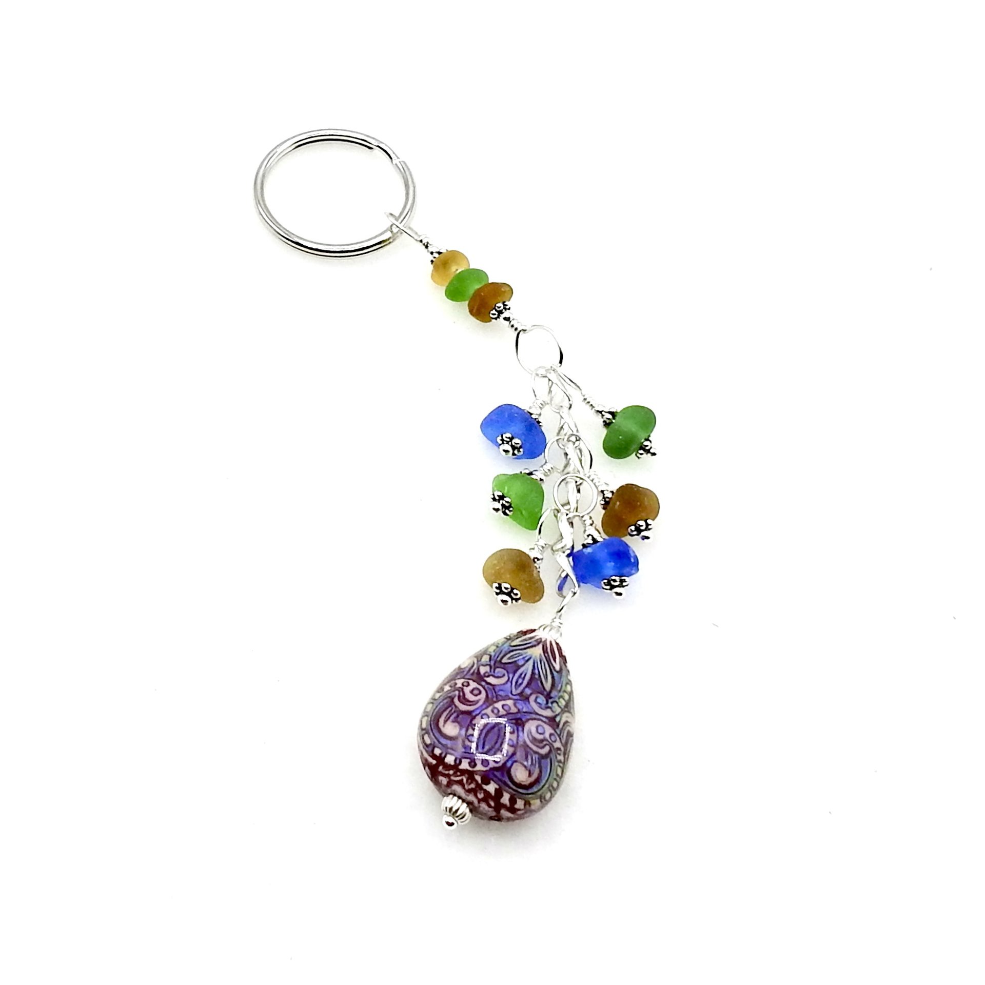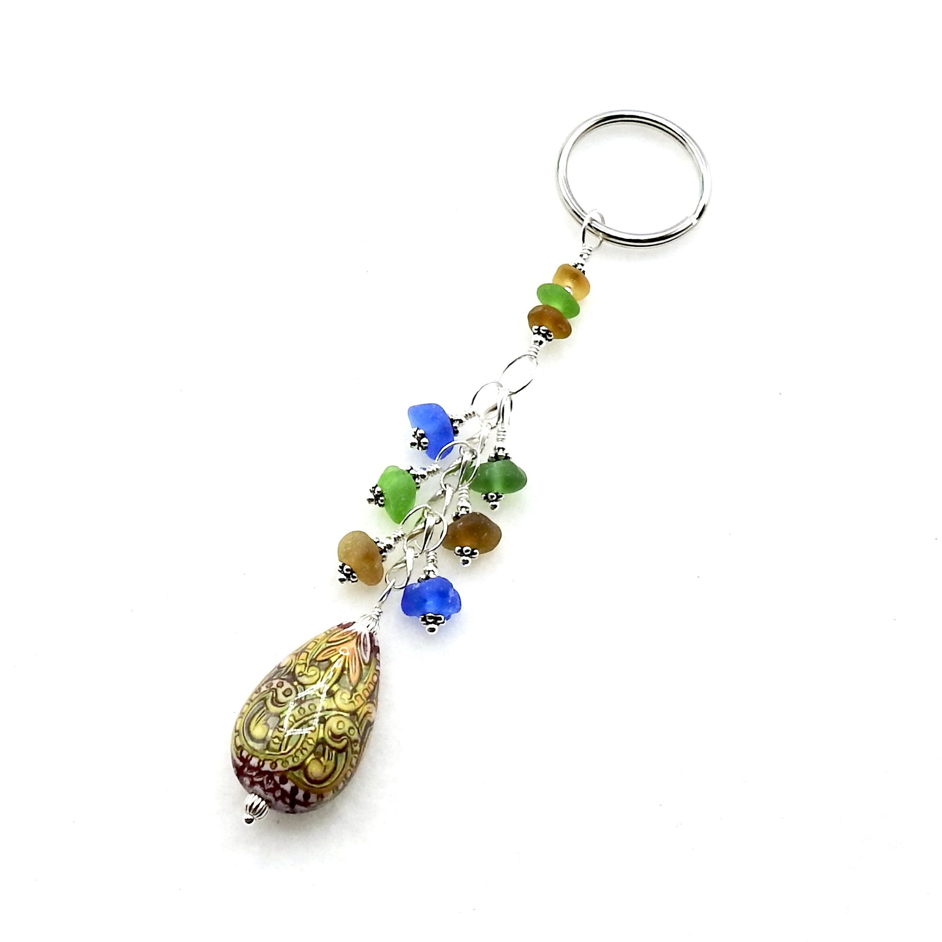 A teardrop mood bead with a twisted vine design dangles below brightly colored genuine sea glass beads on this handcrafted keychain.