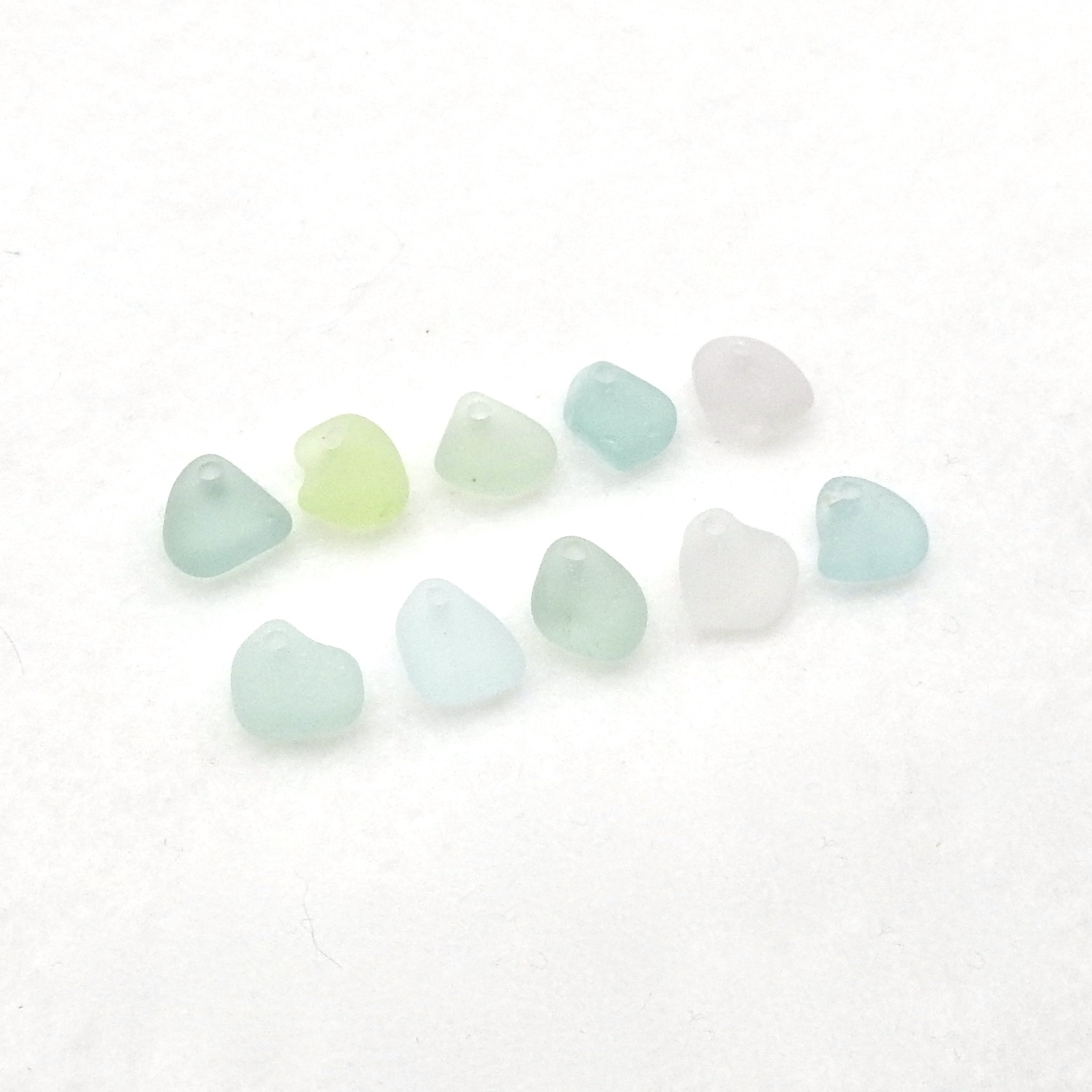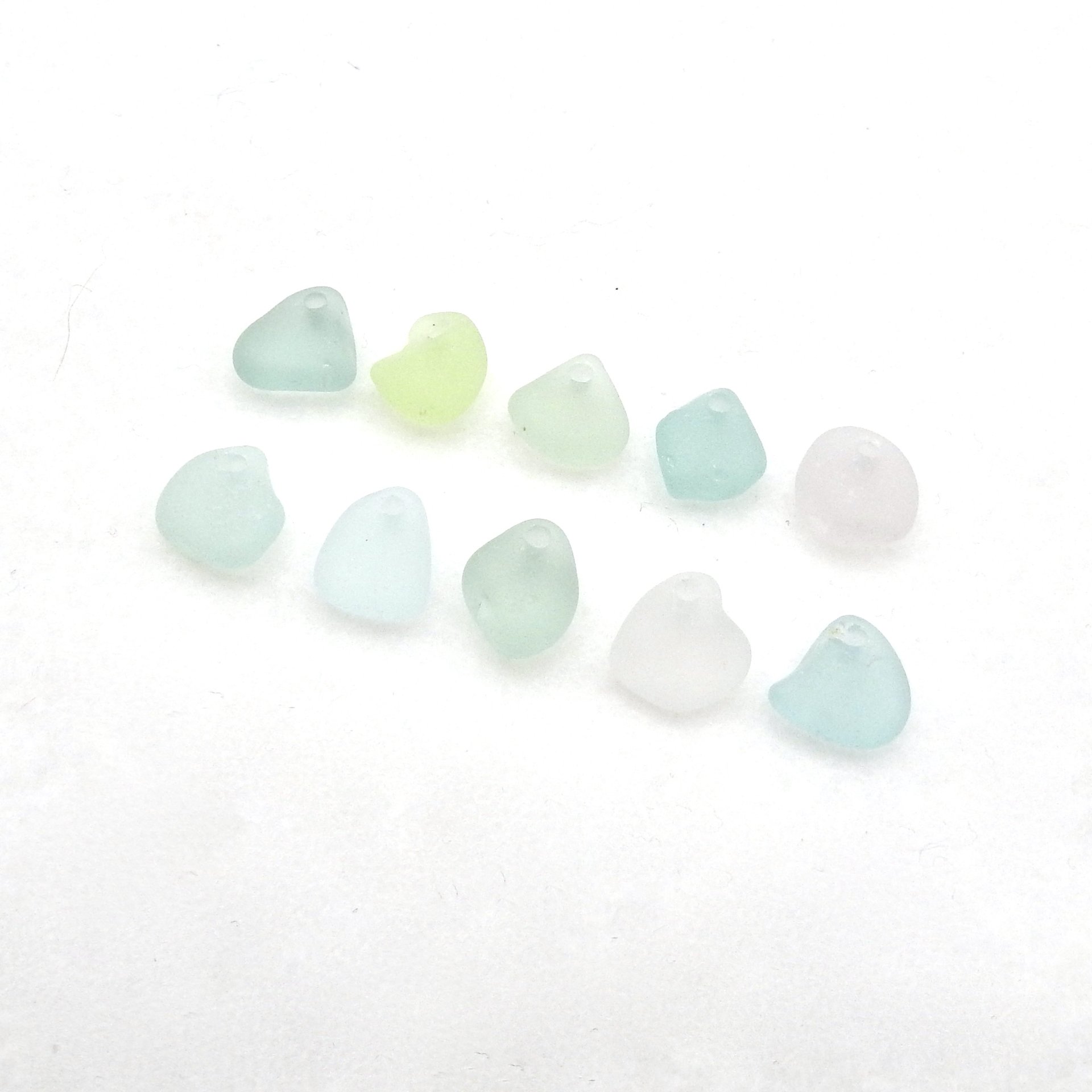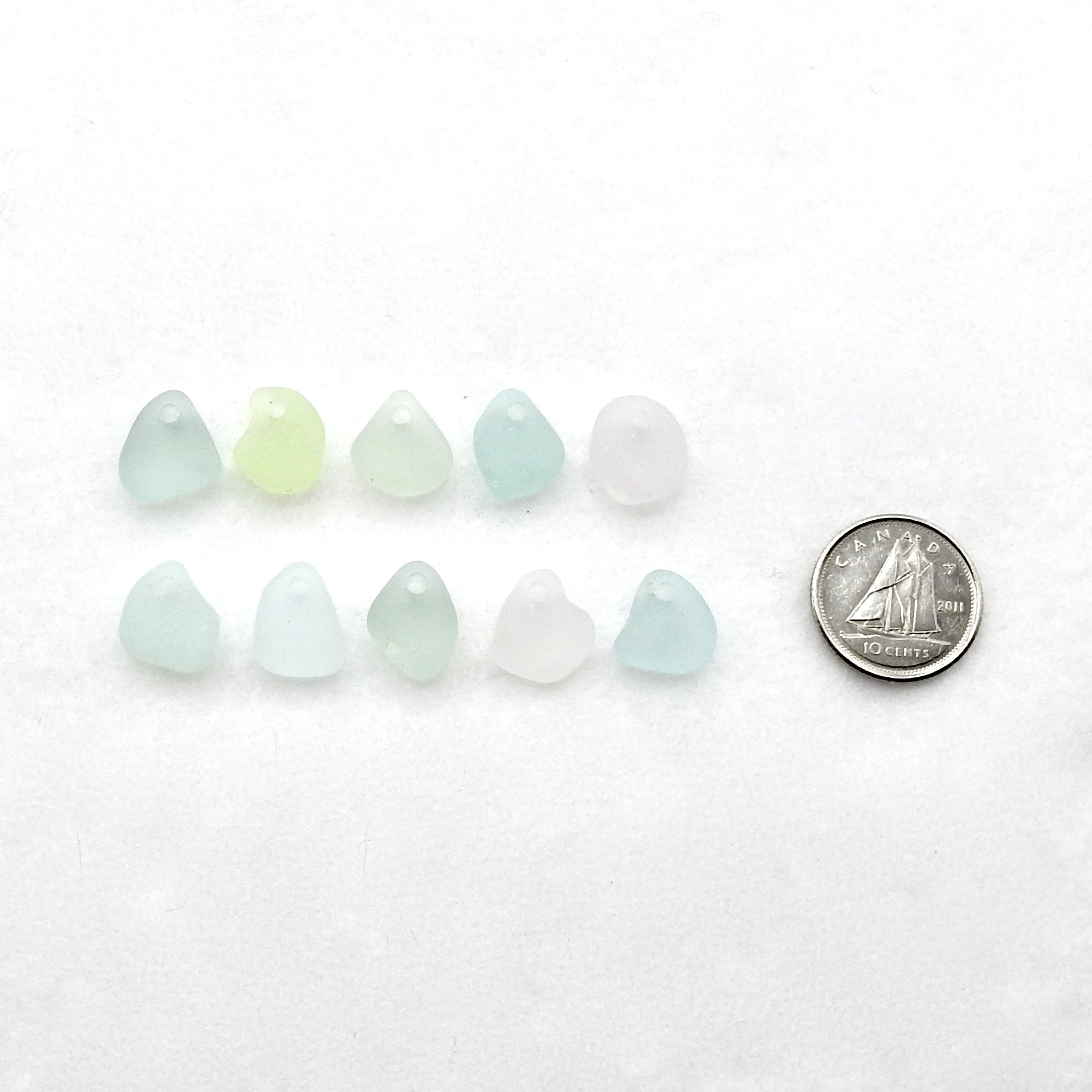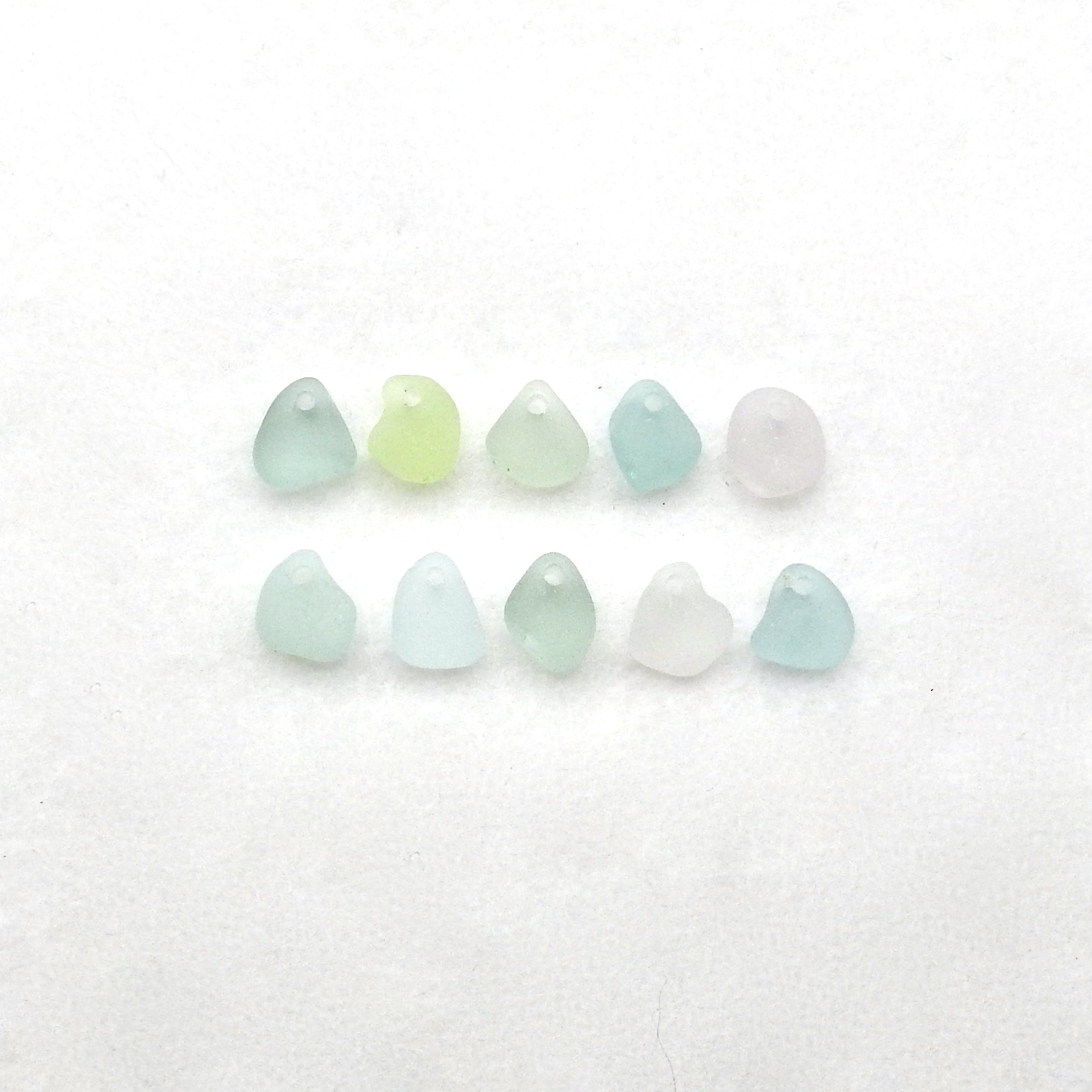 Genuine sea glass charms, set of 10, in soft pastel colours with top drilled holes for jewelry making or other beach themed crafts.