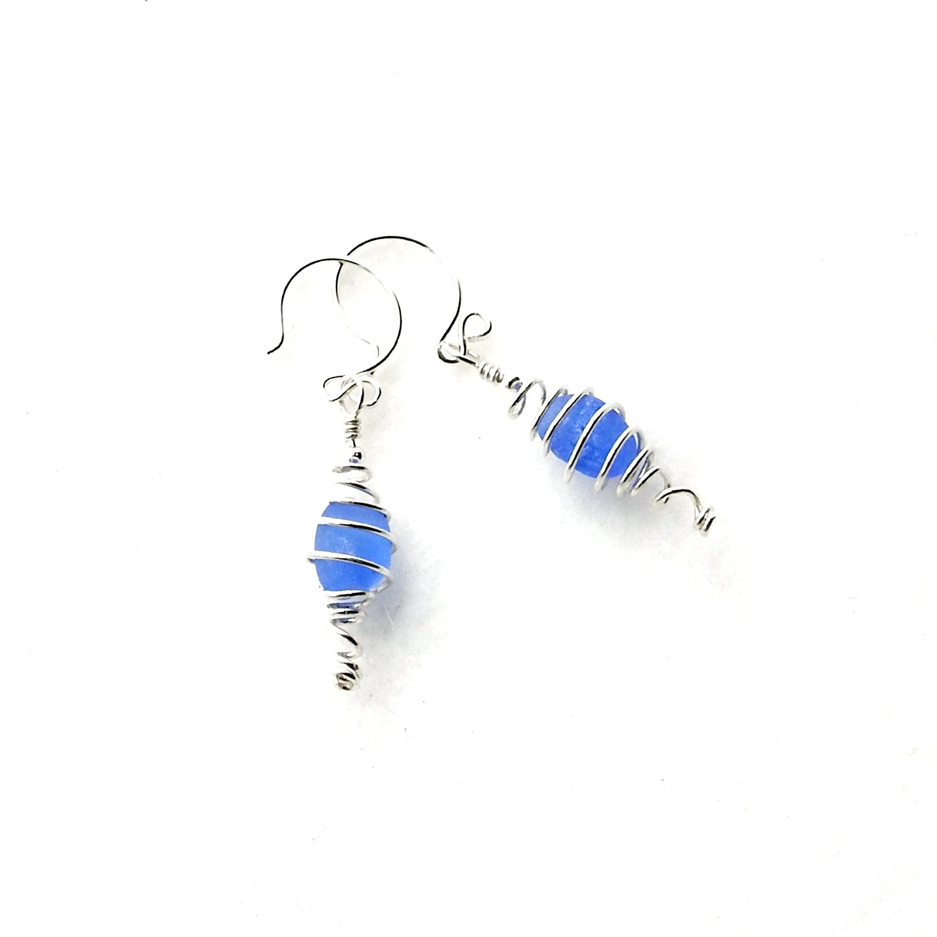 Real Beach Glass Earrings Cornflower Blue Silver Spiral Jewelry