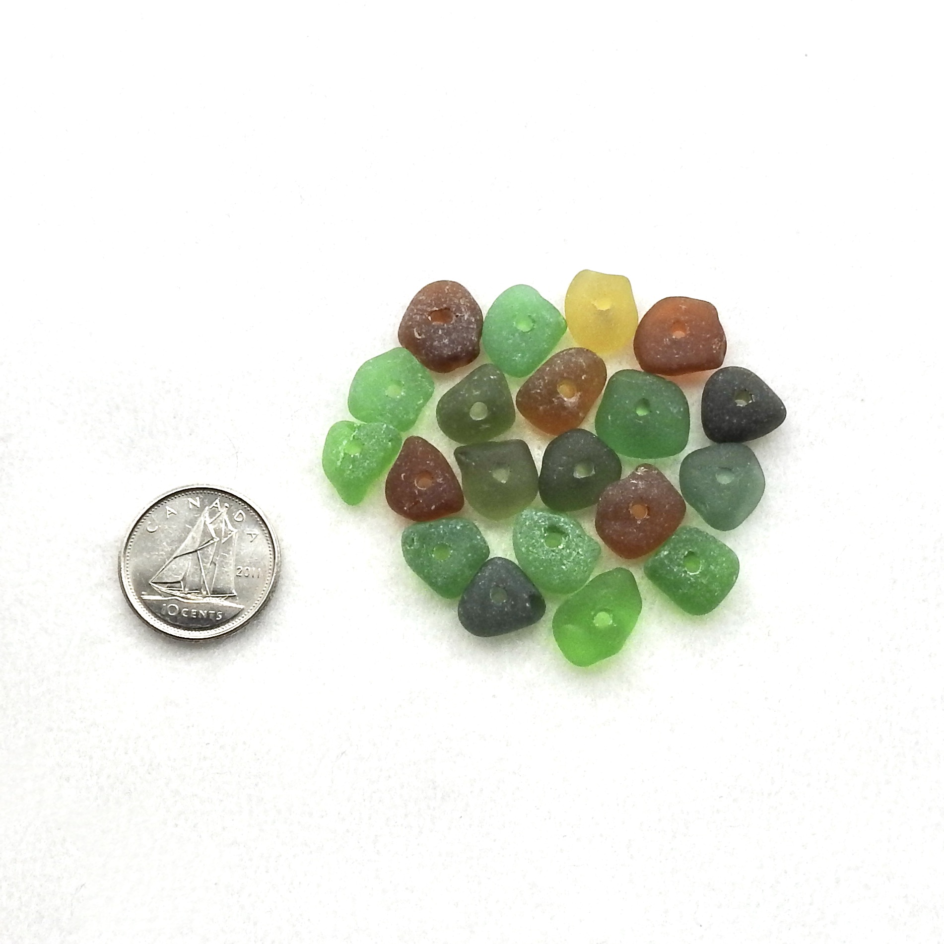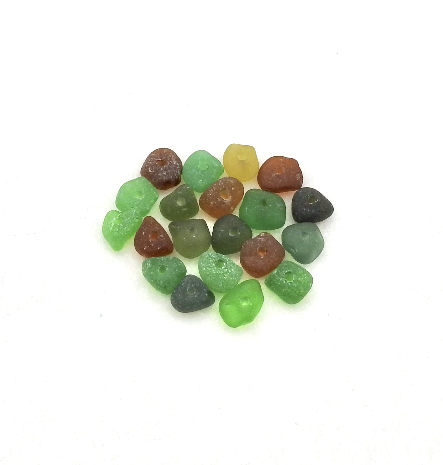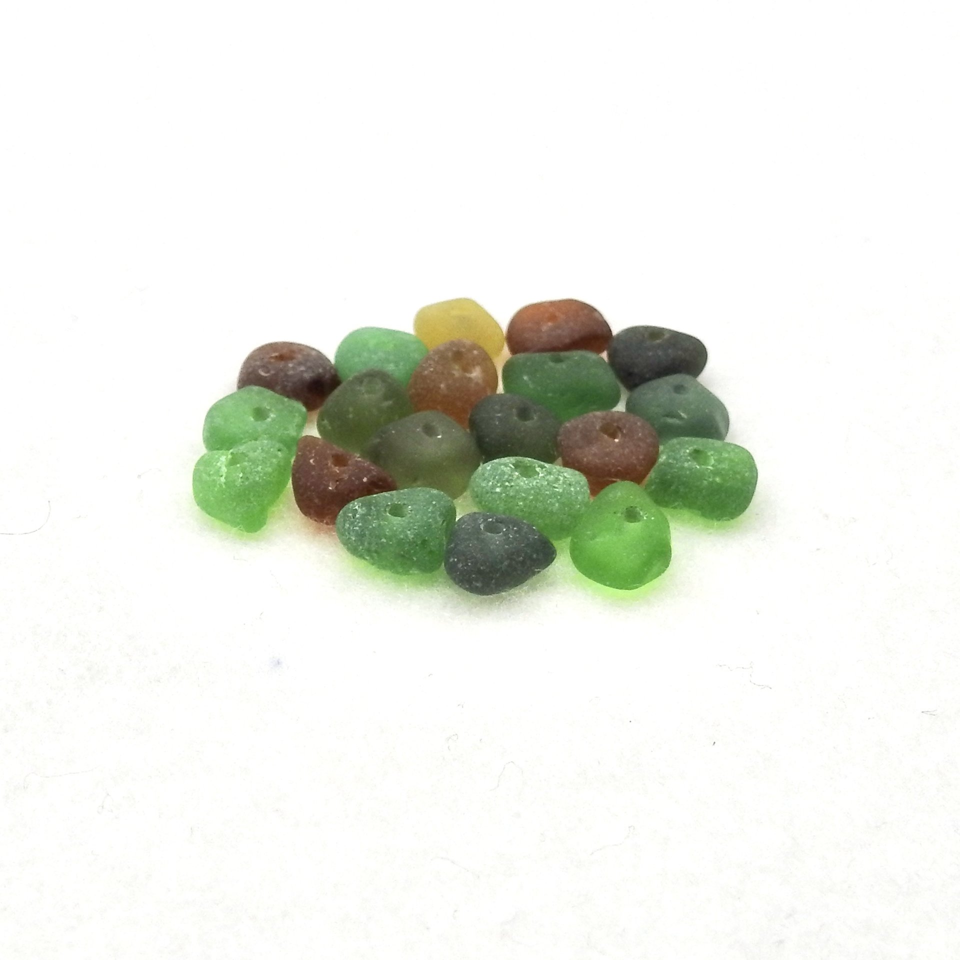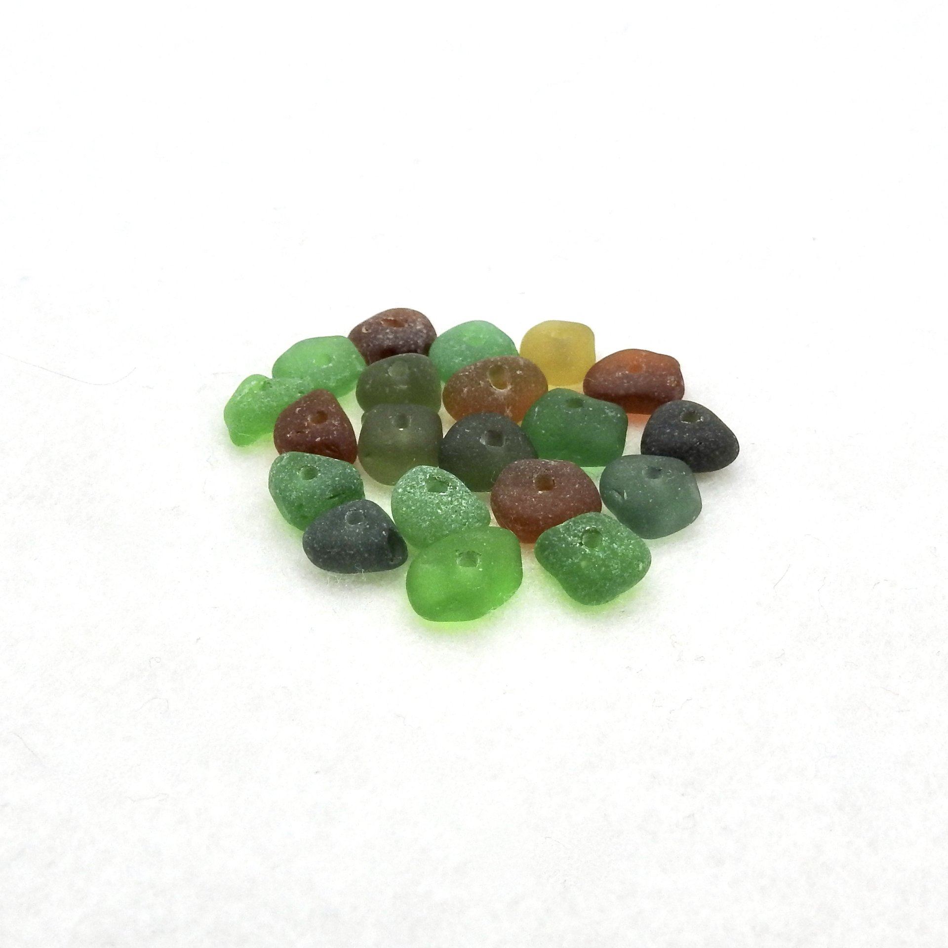 Genuine sea glass beads with center drilled holes, set of 20, in assorted colours for jewelry making or other beach themed crafts.