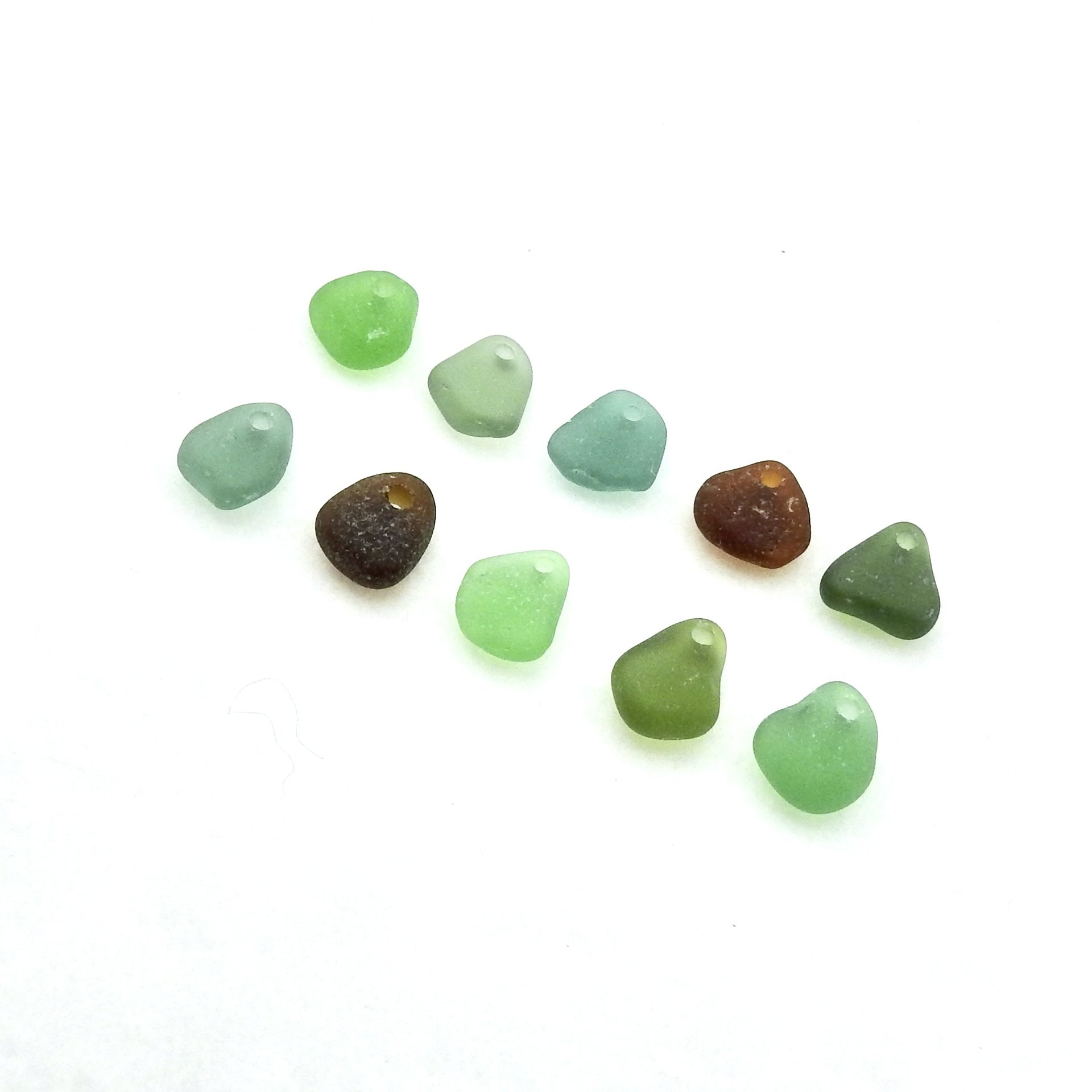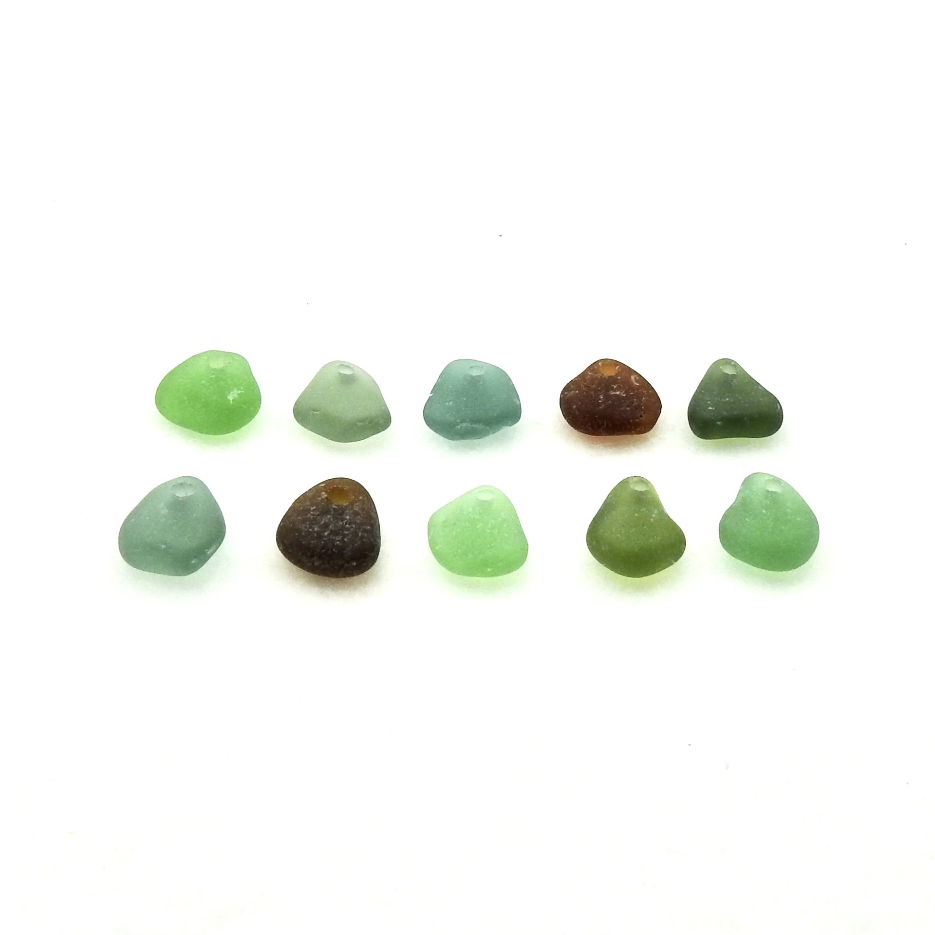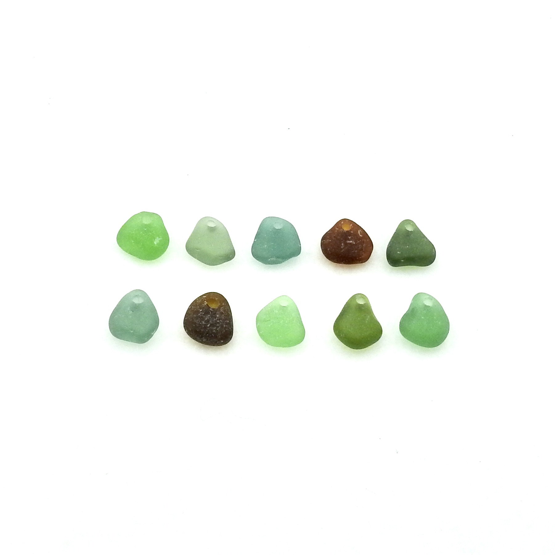 Genuine sea glass charms, set of 10, in mixed colours with top drilled holes for jewelry making or other beach themed crafts.