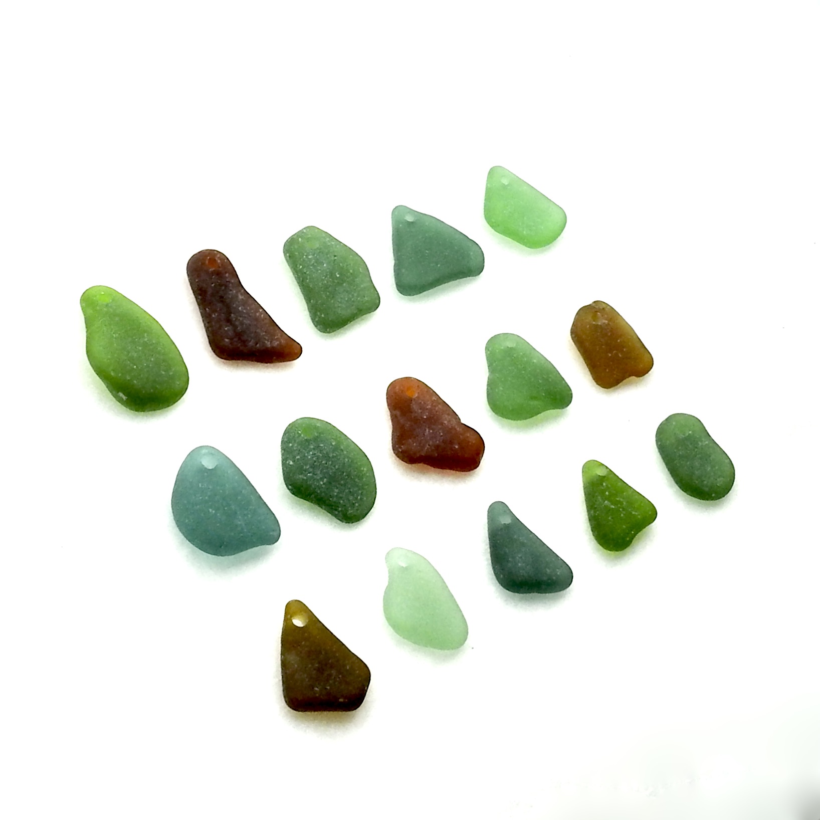 Genuine sea glass charms, set of 15, in mixed colours with top drilled holes for jewelry making or other beach themed crafts.