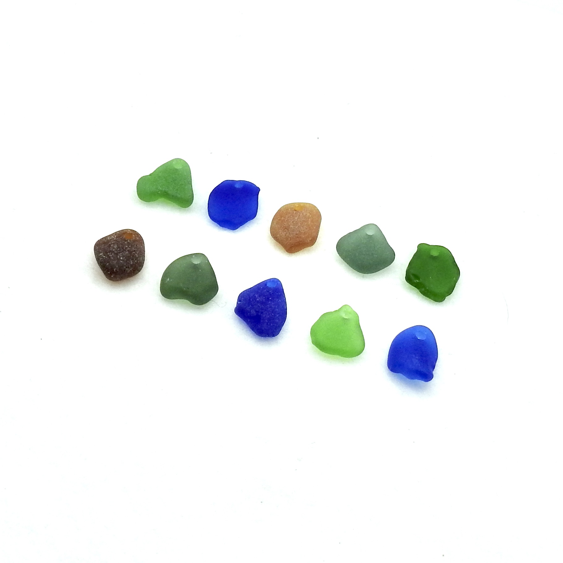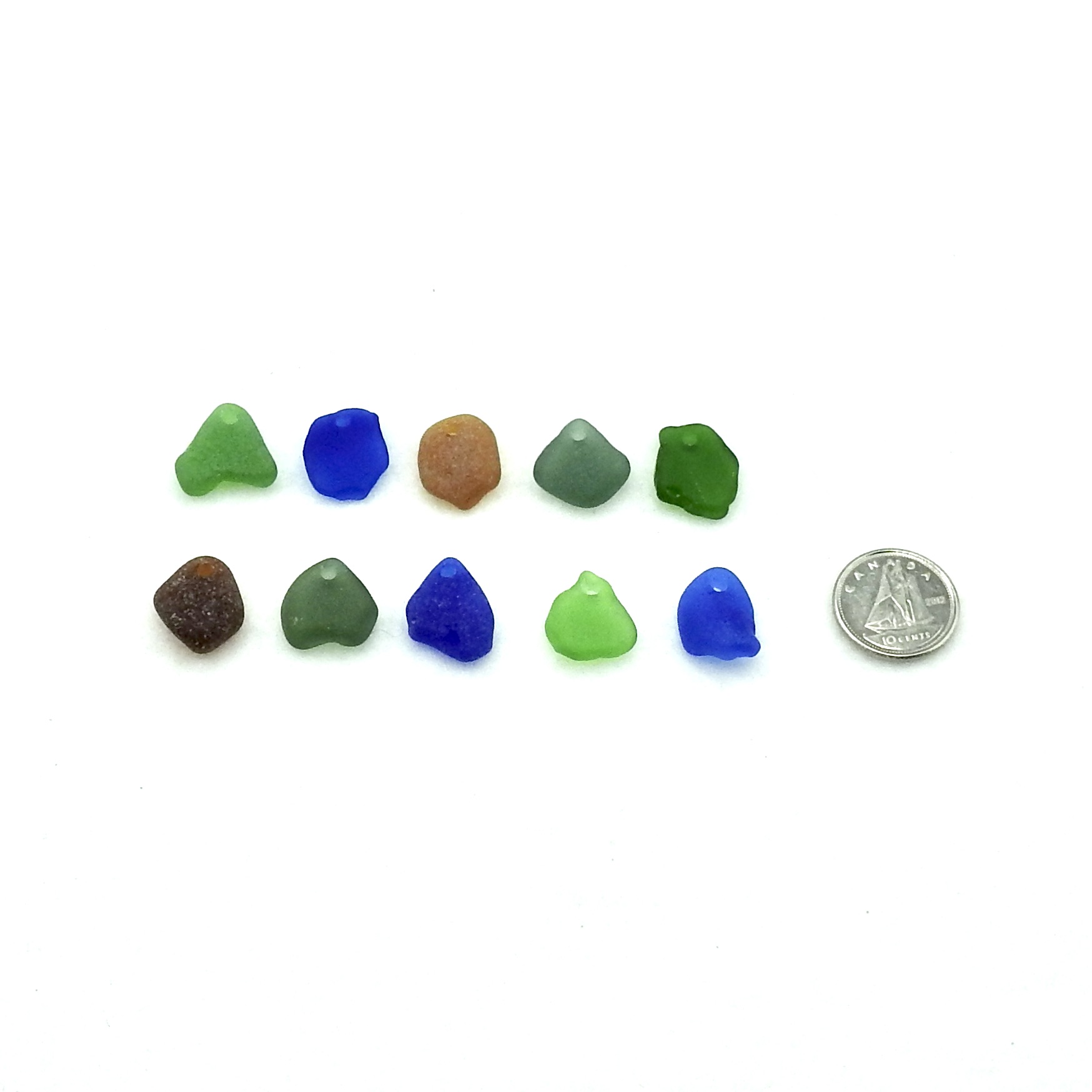 Genuine sea glass charms, set of 10, in shades of green, brown and cobalt blue with top drilled holes for jewelry making or other beach themed crafts.