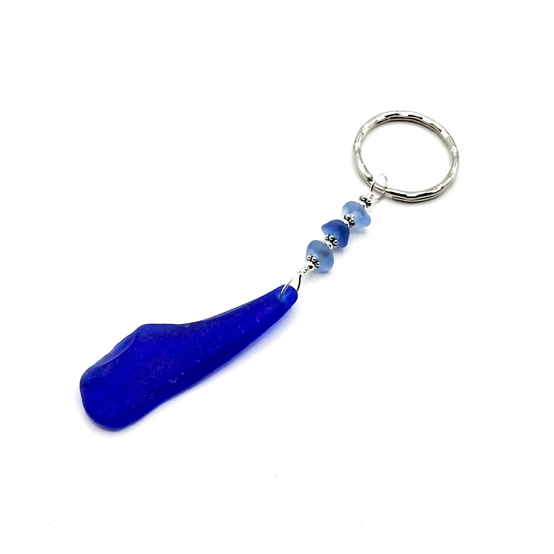 A one of a kind keychain, handmade with a dark cobalt blue genuine sea glass pendant and tiny sea glass beads in shades of blue with a hammered design keyring.