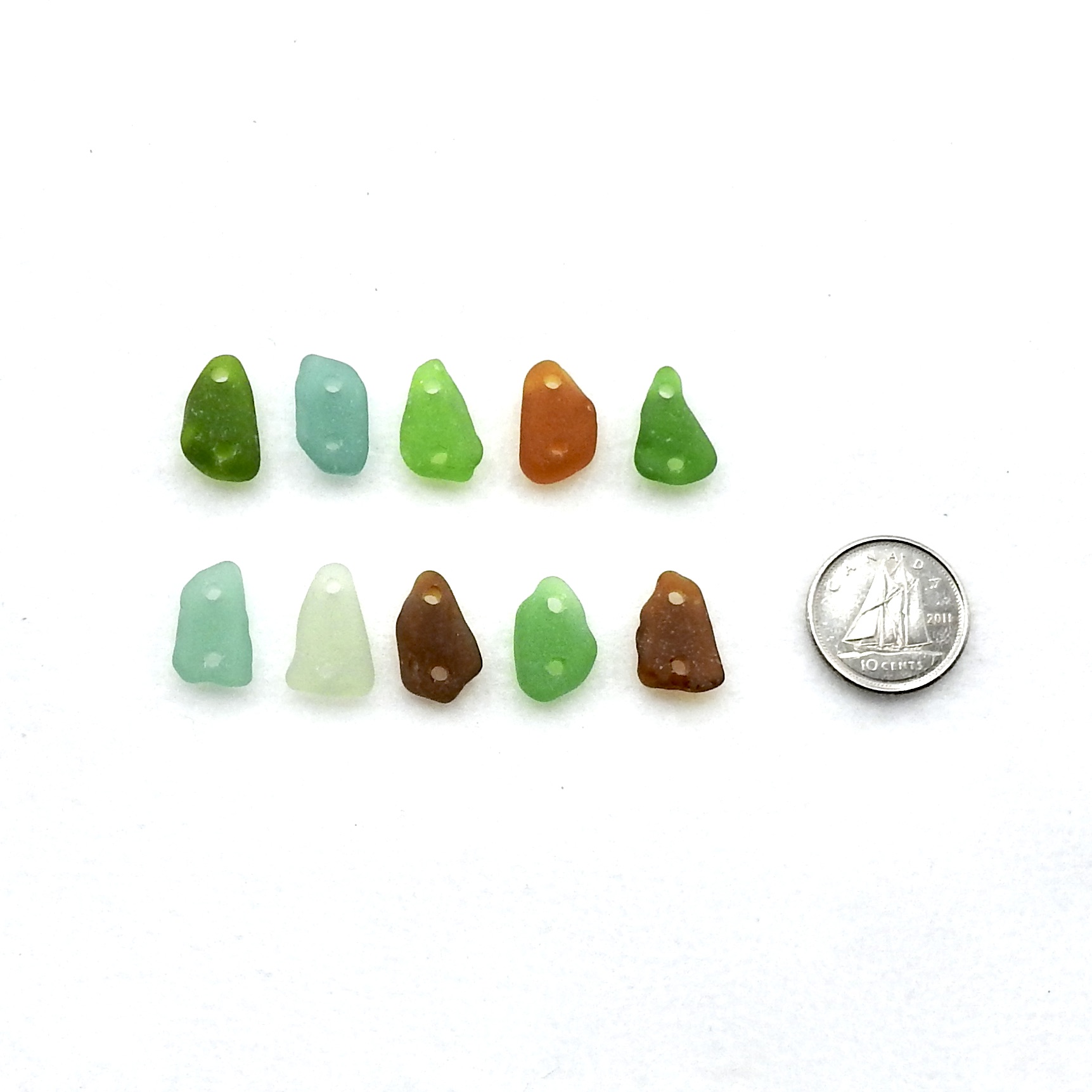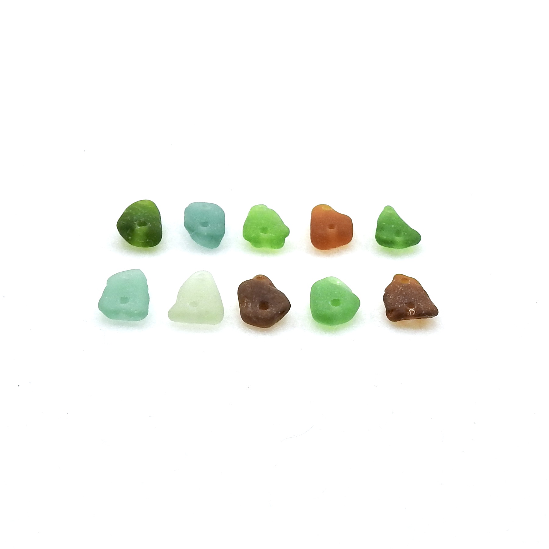 Tiny sea glass connector beads, set of 10, in mixed colors with two drilled holes for jewelry making, sun catcher accents, sew on for decoration or other beach themed crafts.