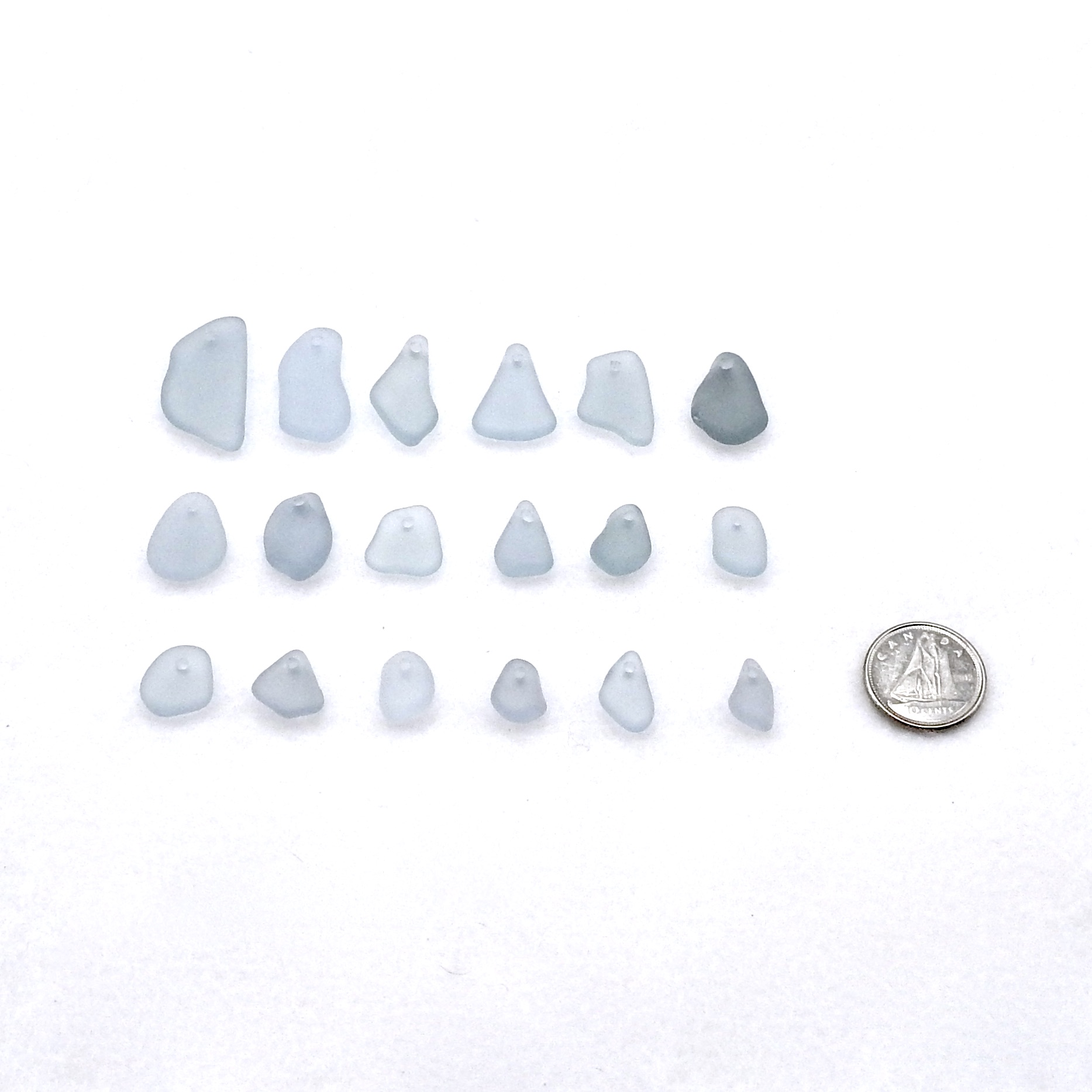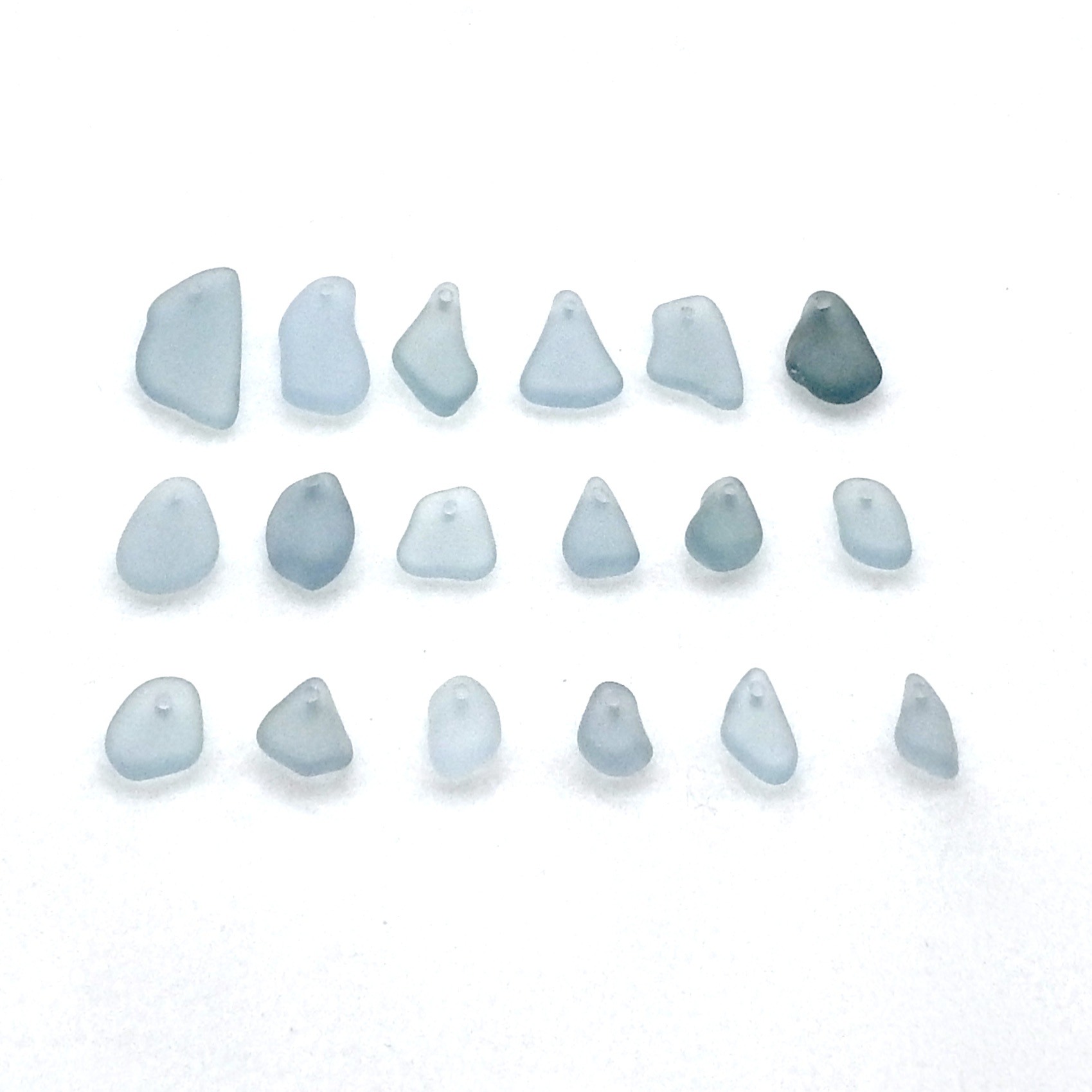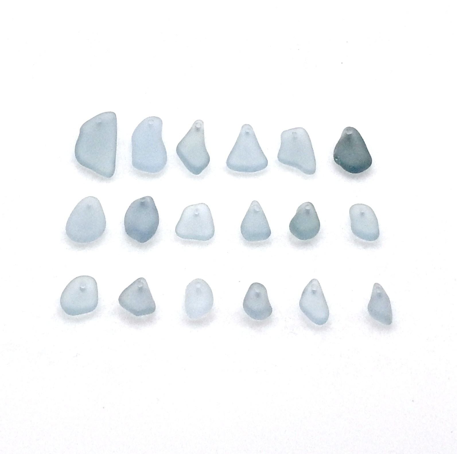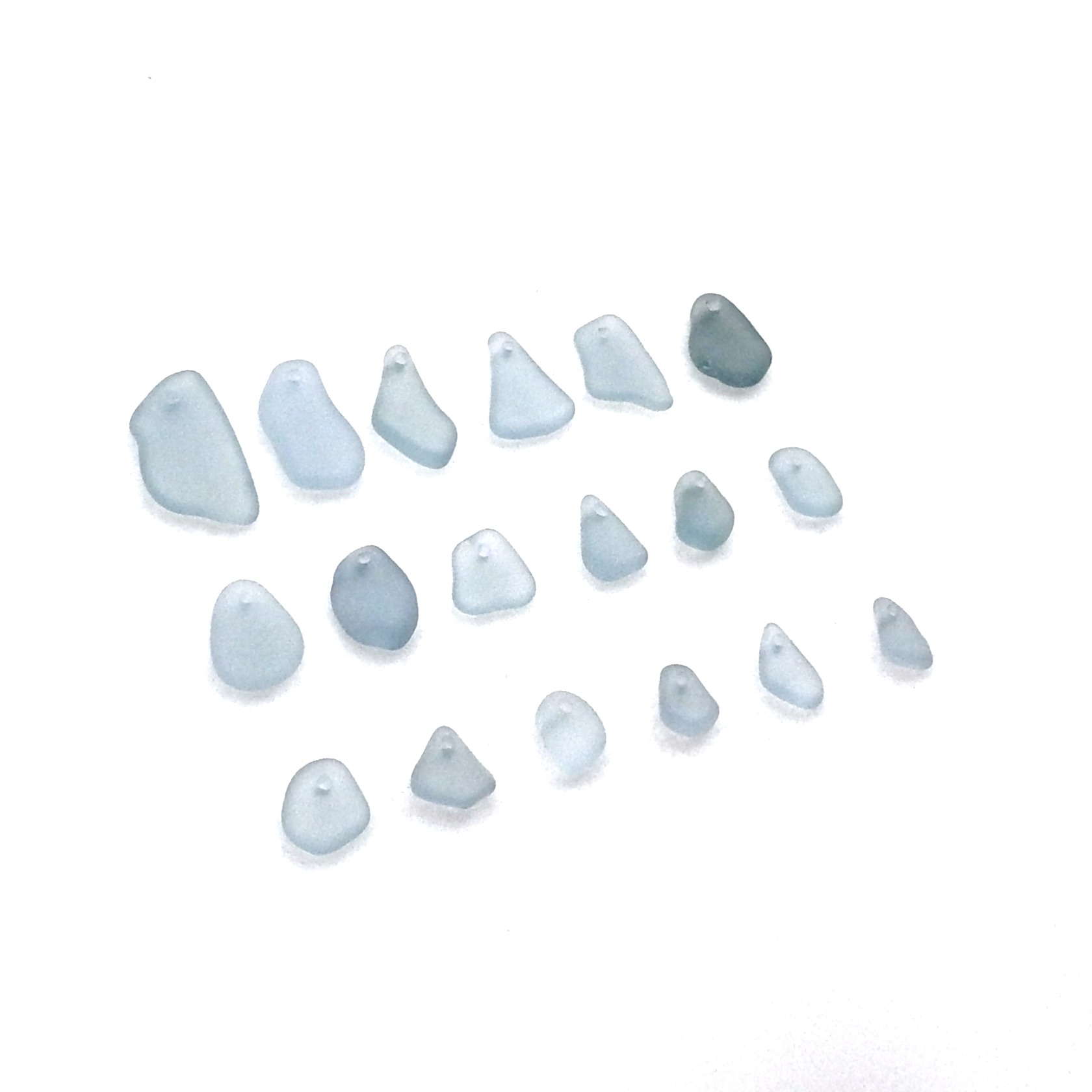 Genuine sea glass pieces, set of 18, with top drilled holes for jewelry making or other beach themed crafts.
