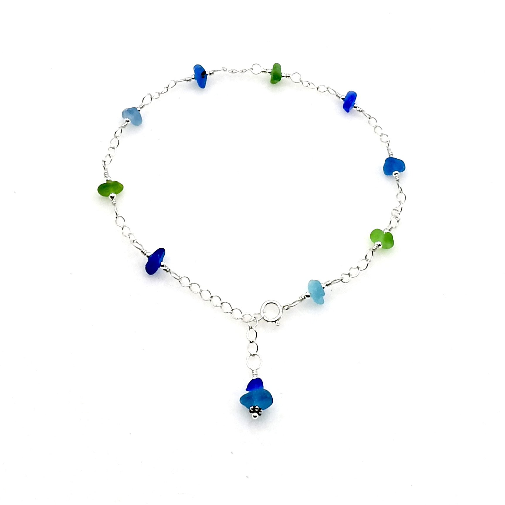 An adjustable anklet, handmade with tiny genuine sea glass pieces in shades of green and blue.