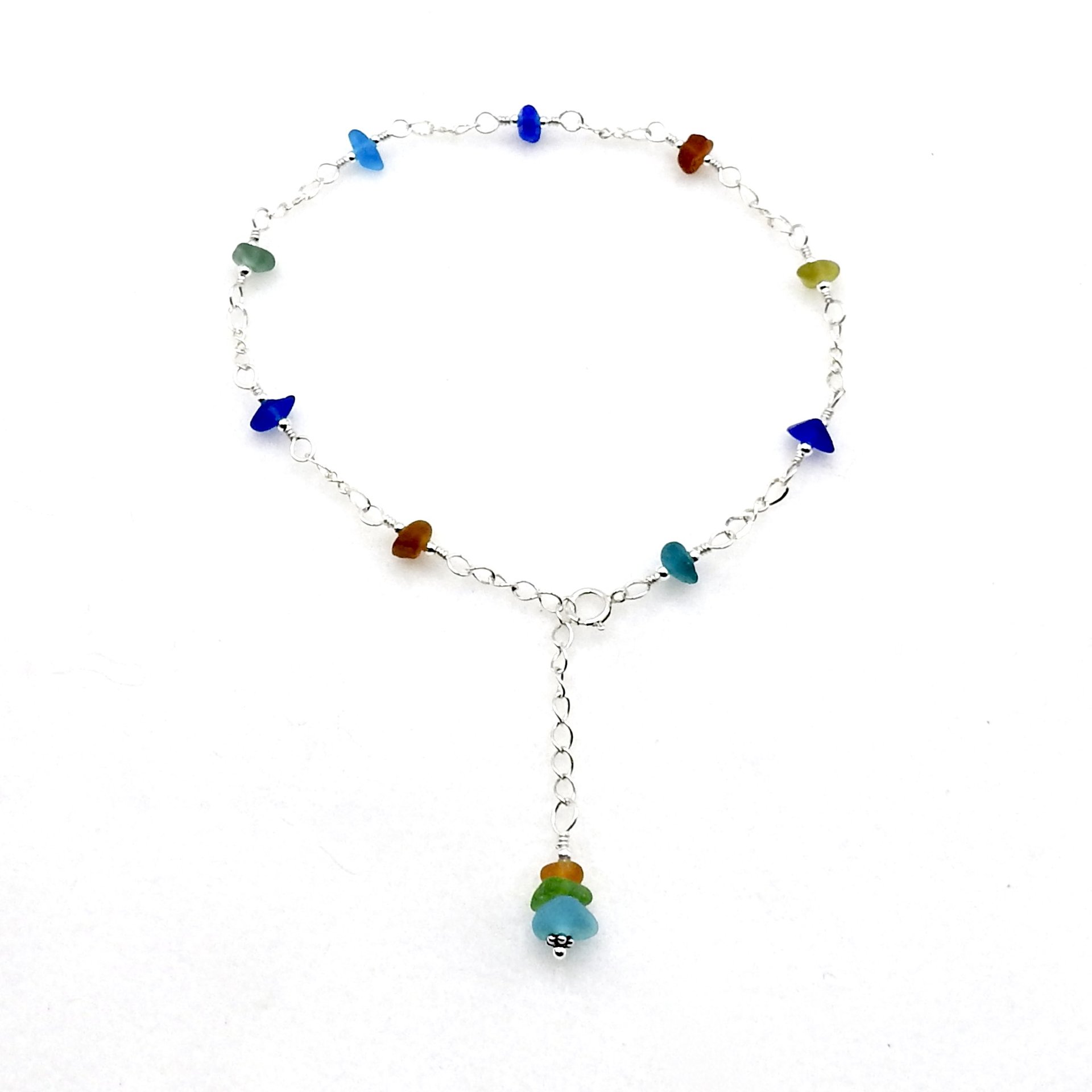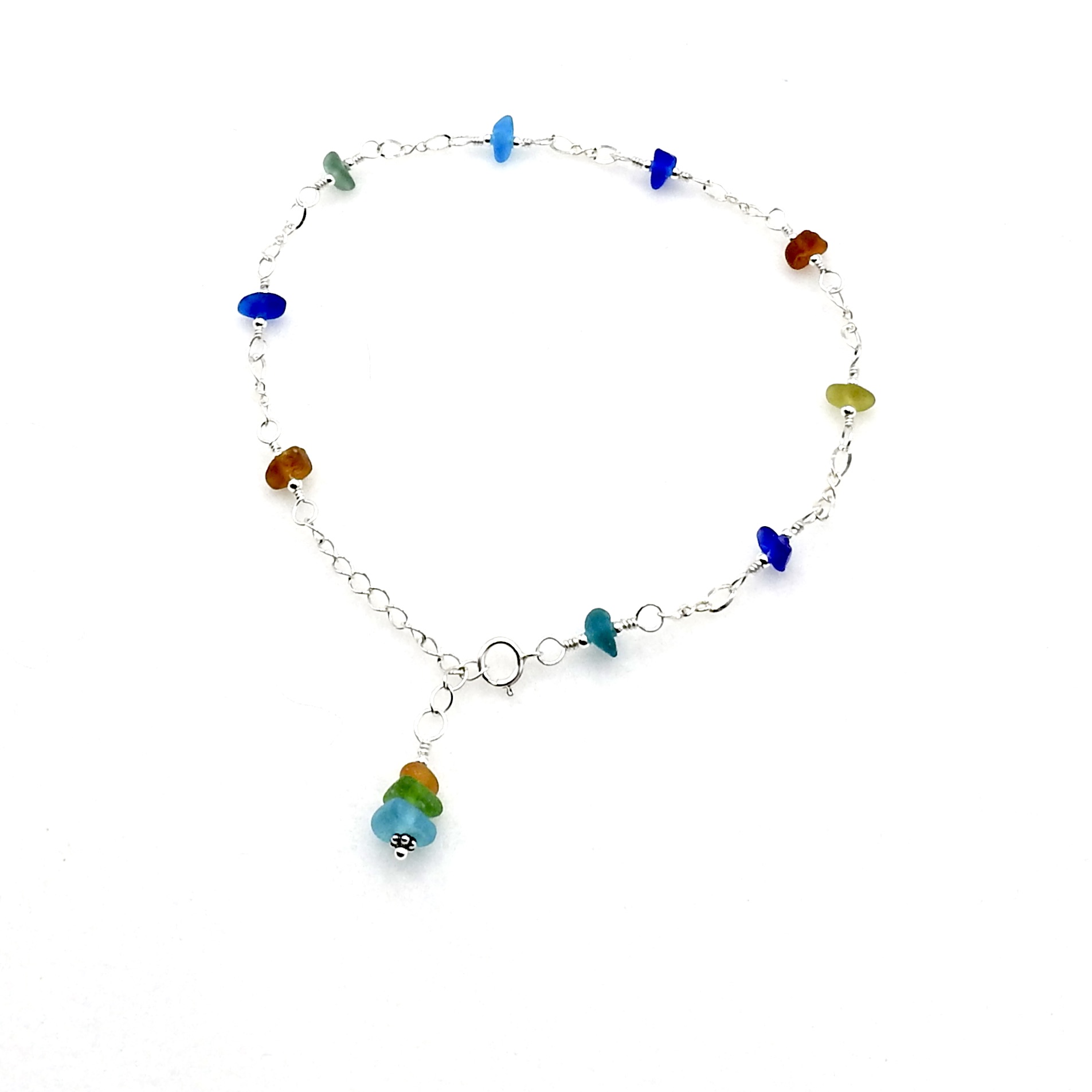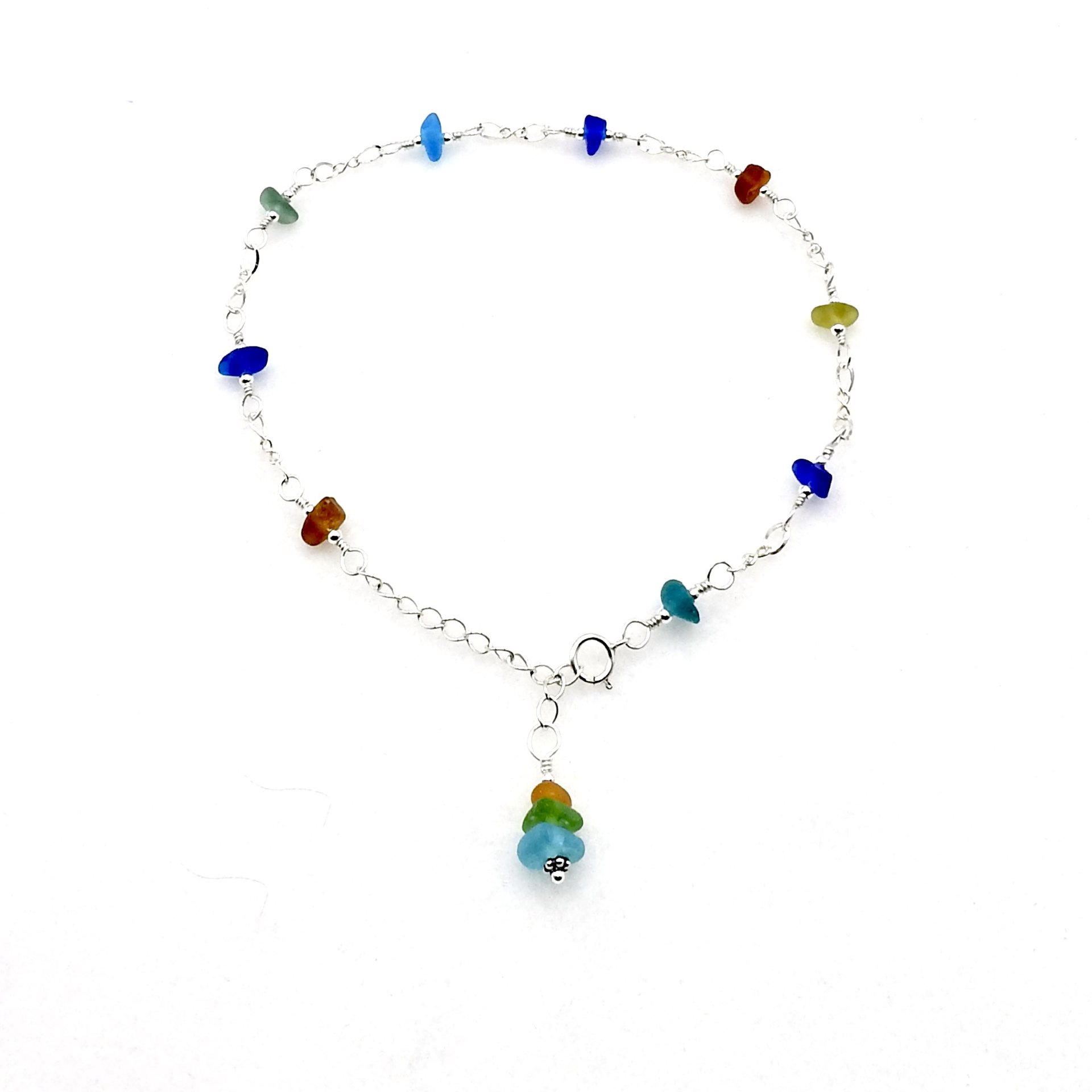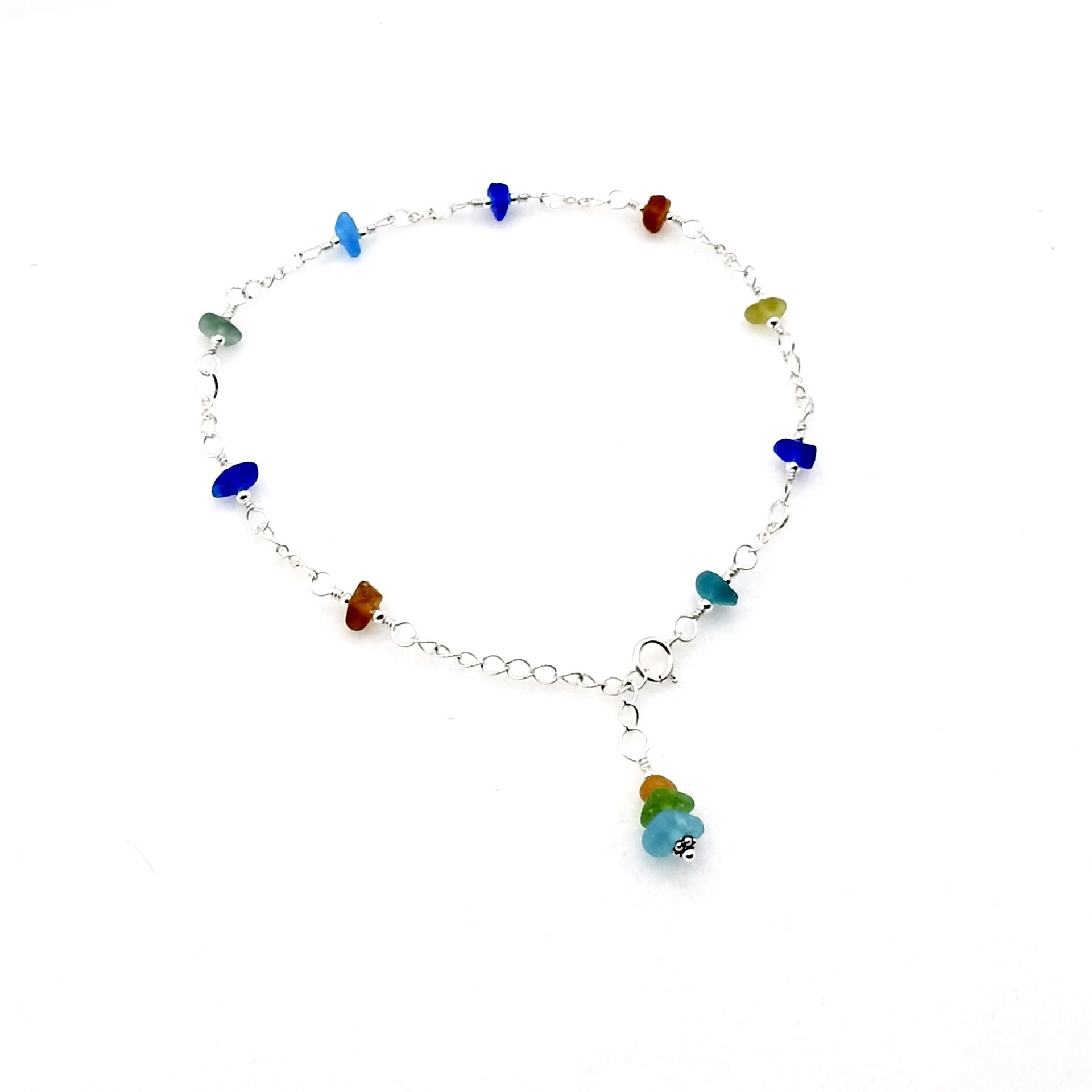 An adjustable anklet, handmade with tiny genuine sea glass pieces in an array of bright colours.