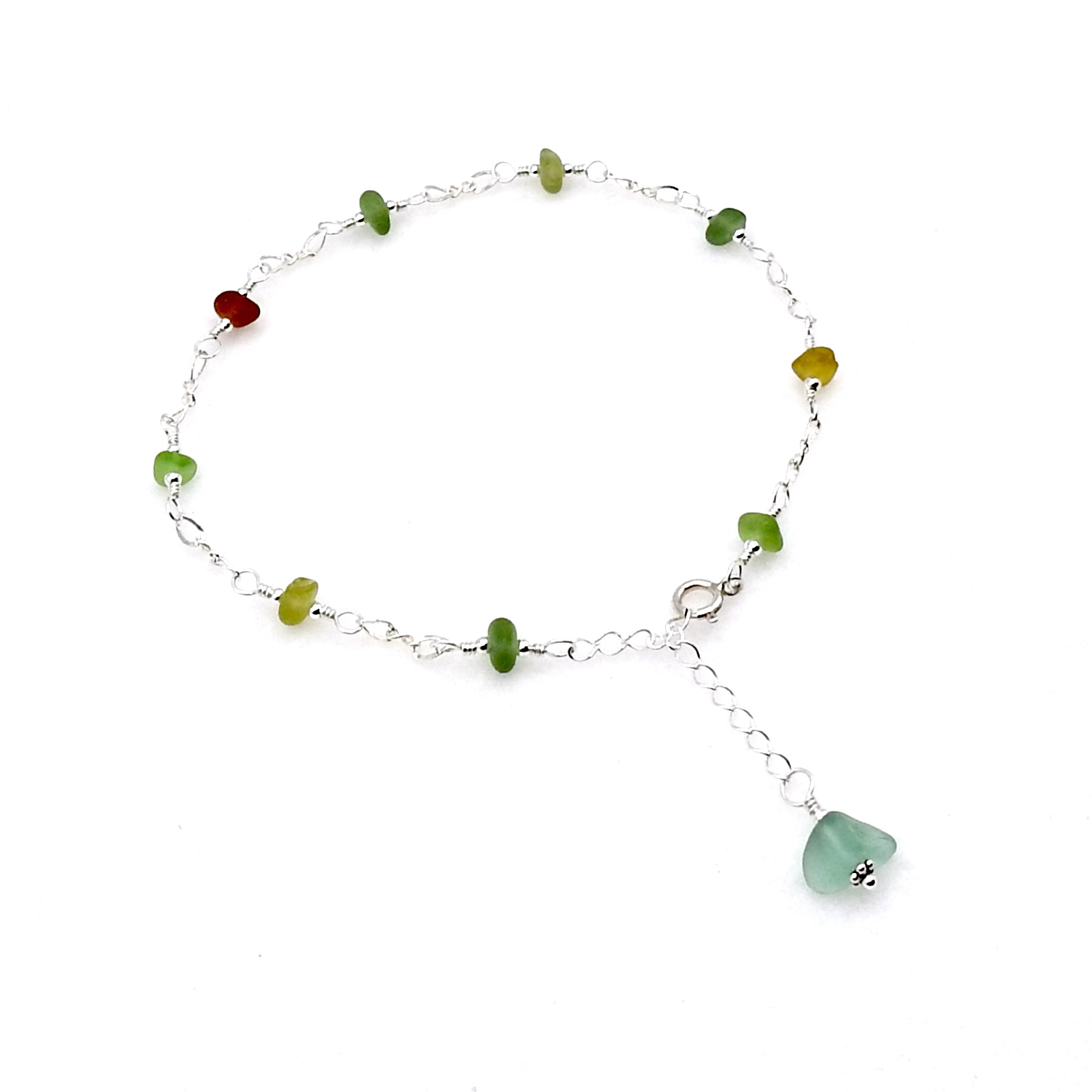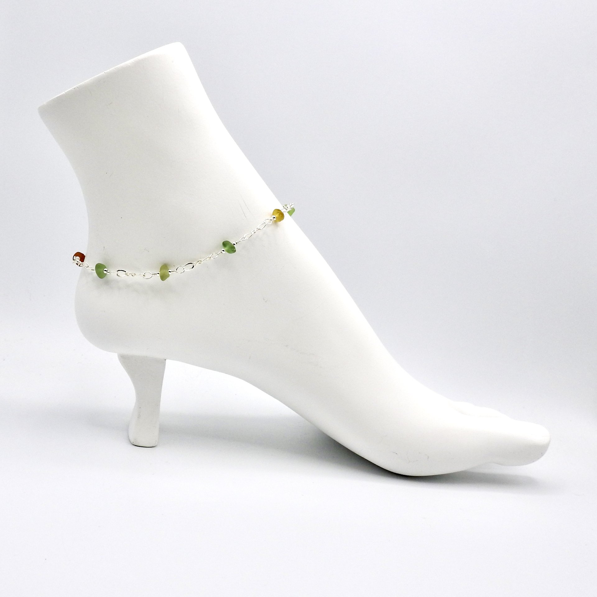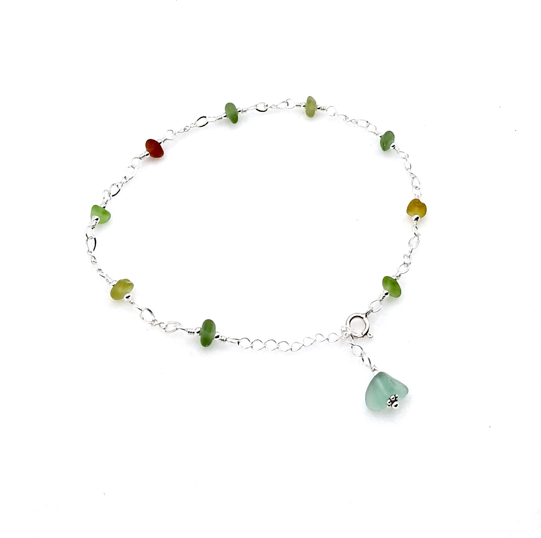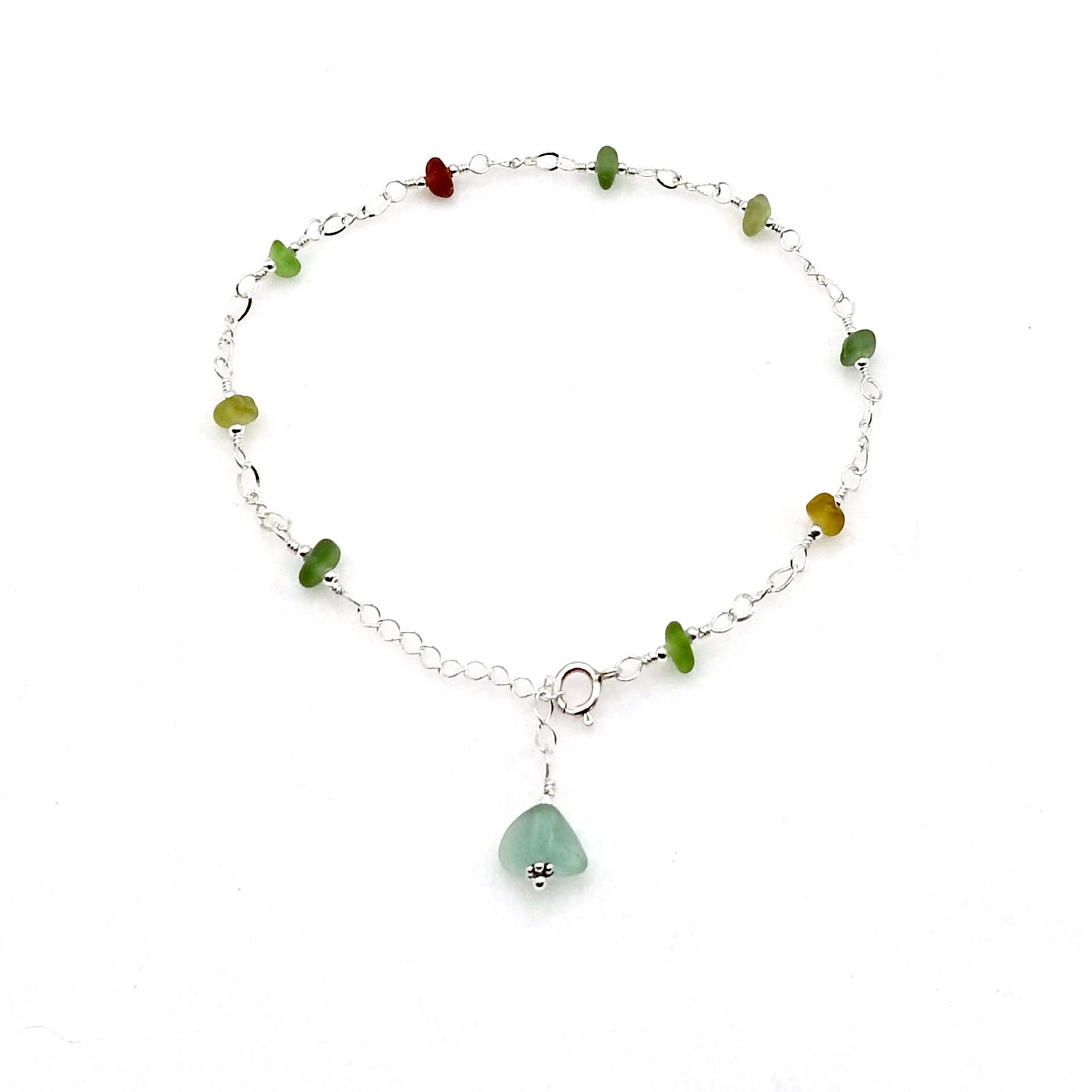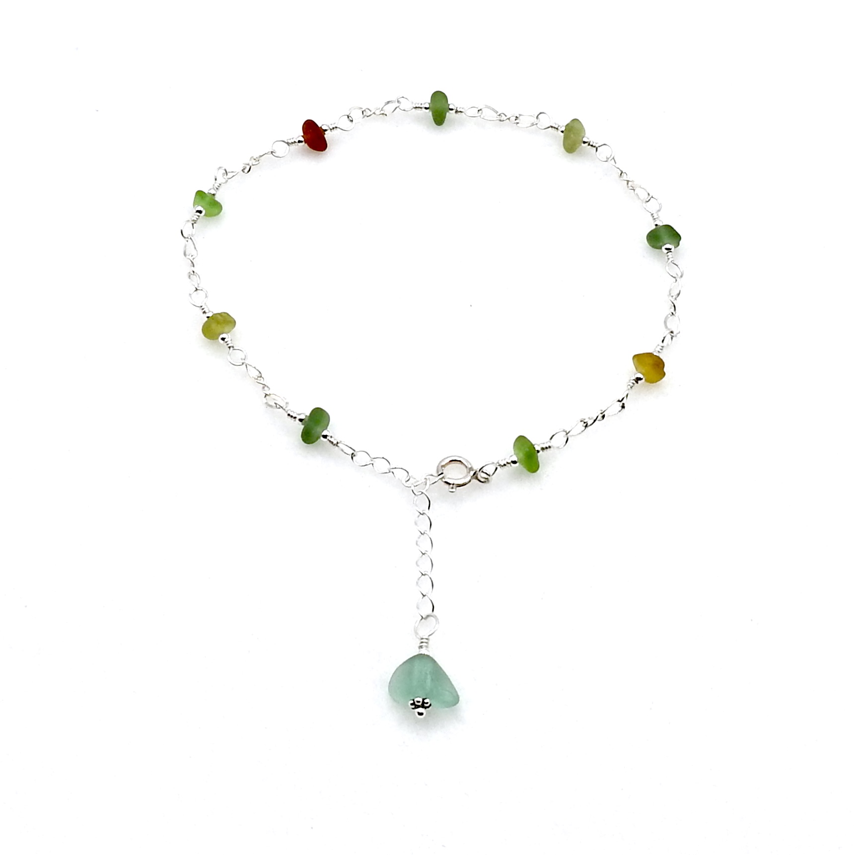 An adjustable beaded anklet for women, handmade with tiny genuine sea glass pieces in a mix of colours.