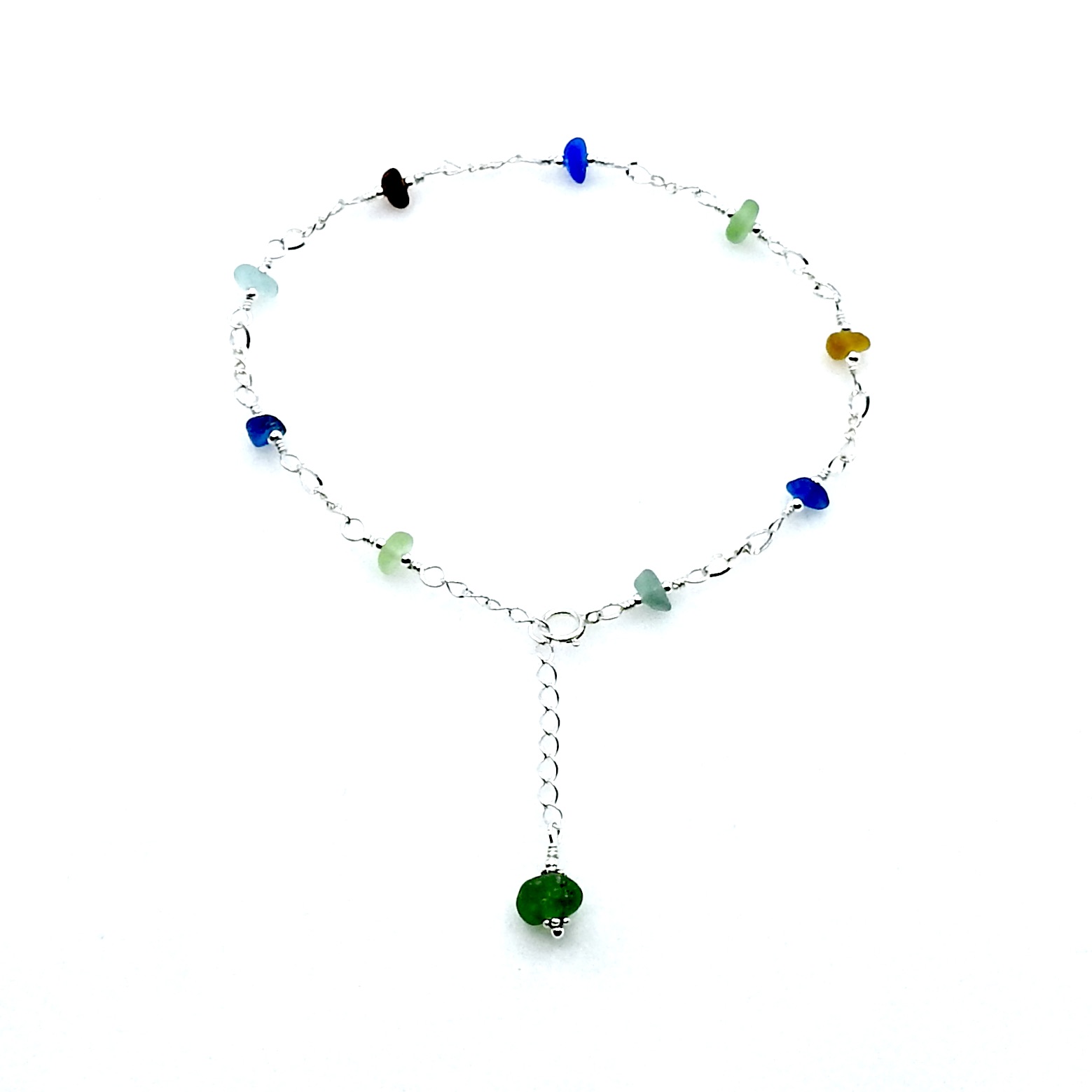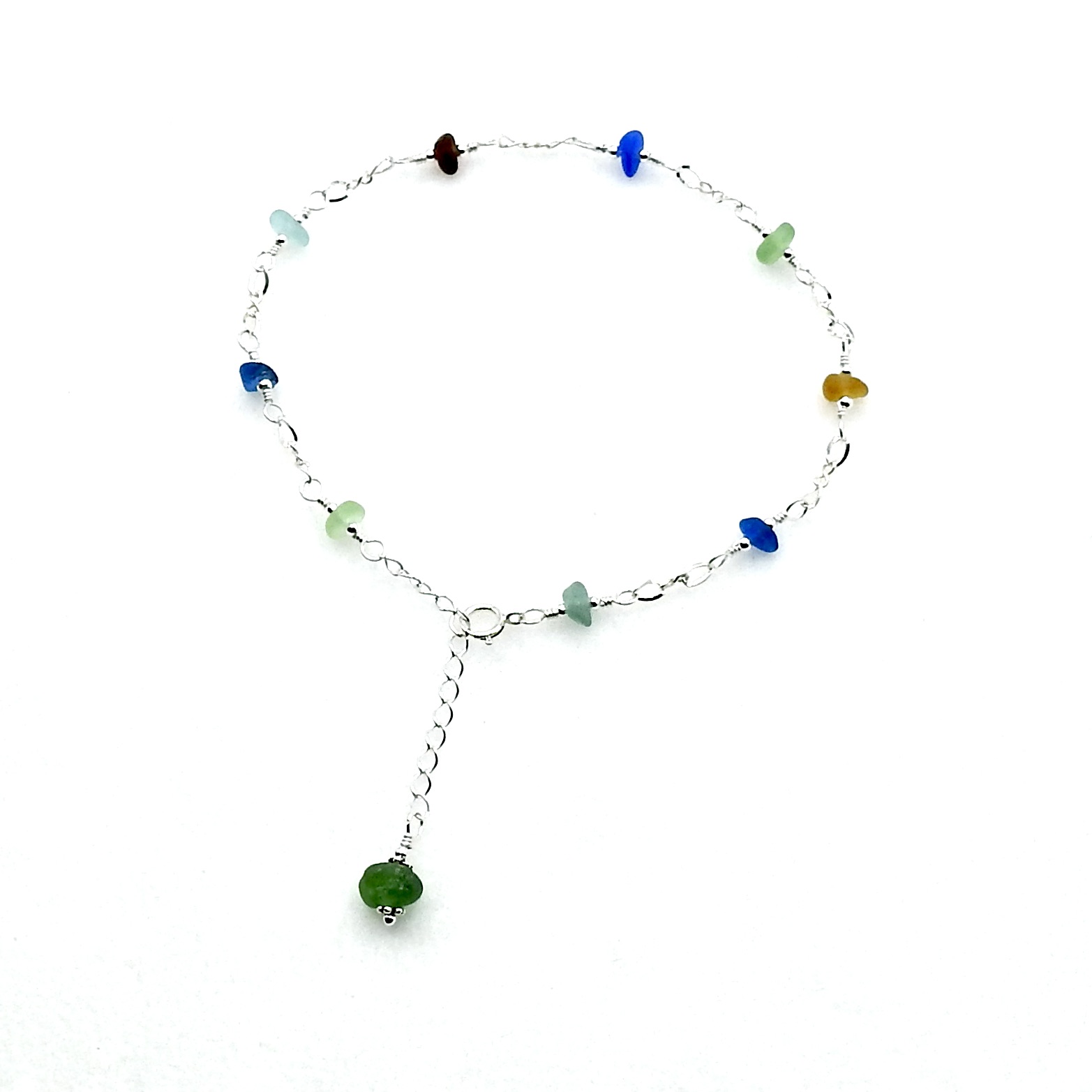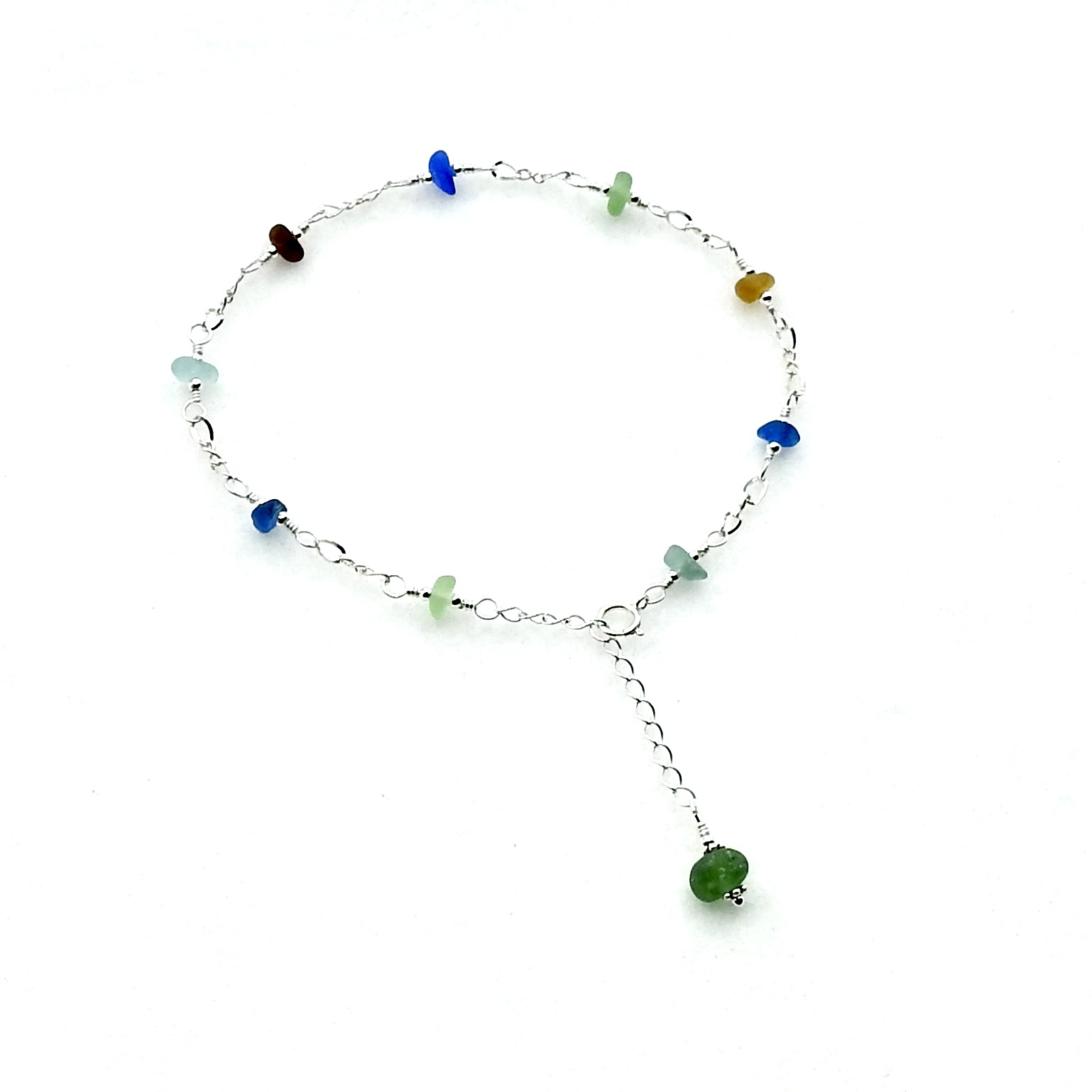 An adjustable silver chain anklet, handmade with tiny genuine sea glass pieces in multi colours.