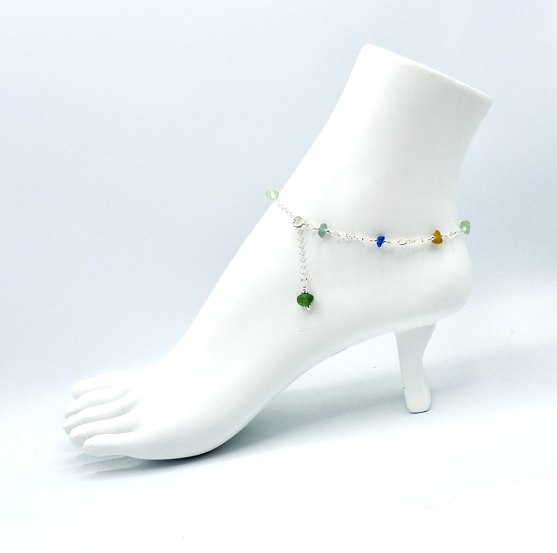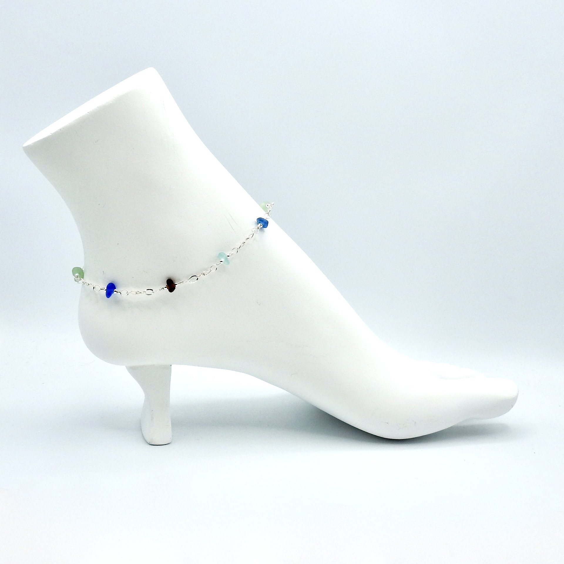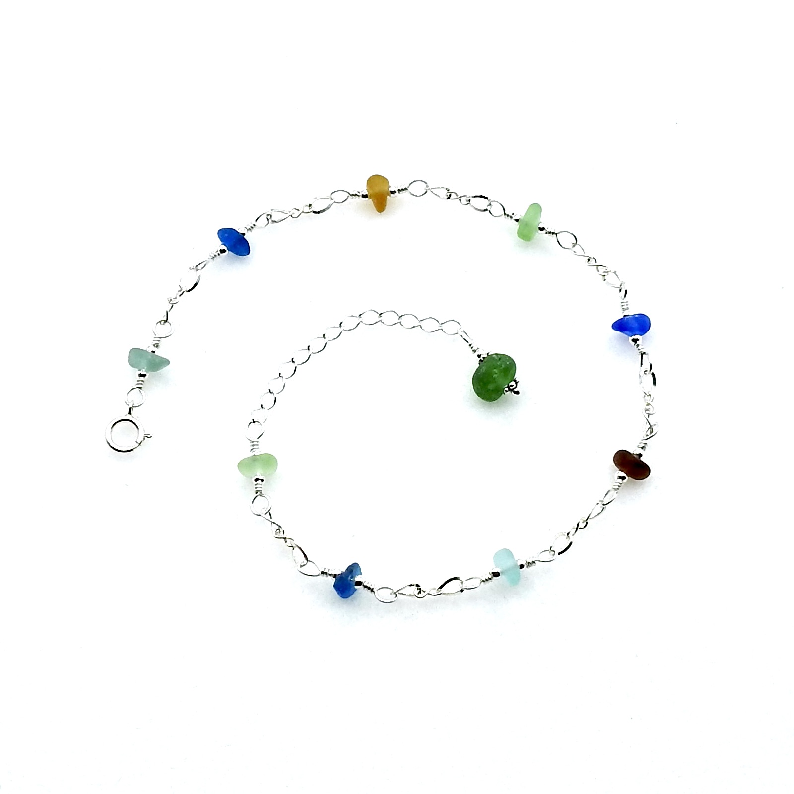 An adjustable silver chain anklet, handmade with tiny genuine sea glass pieces in multi colours.