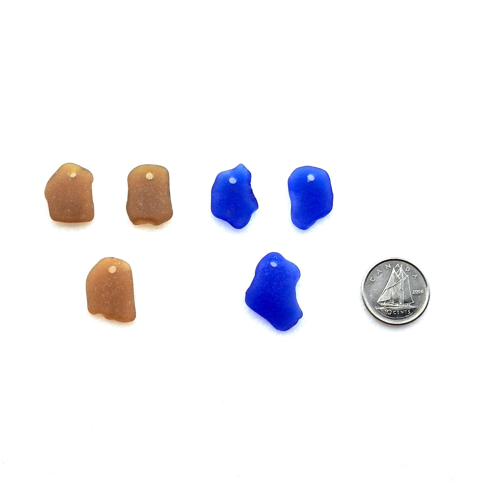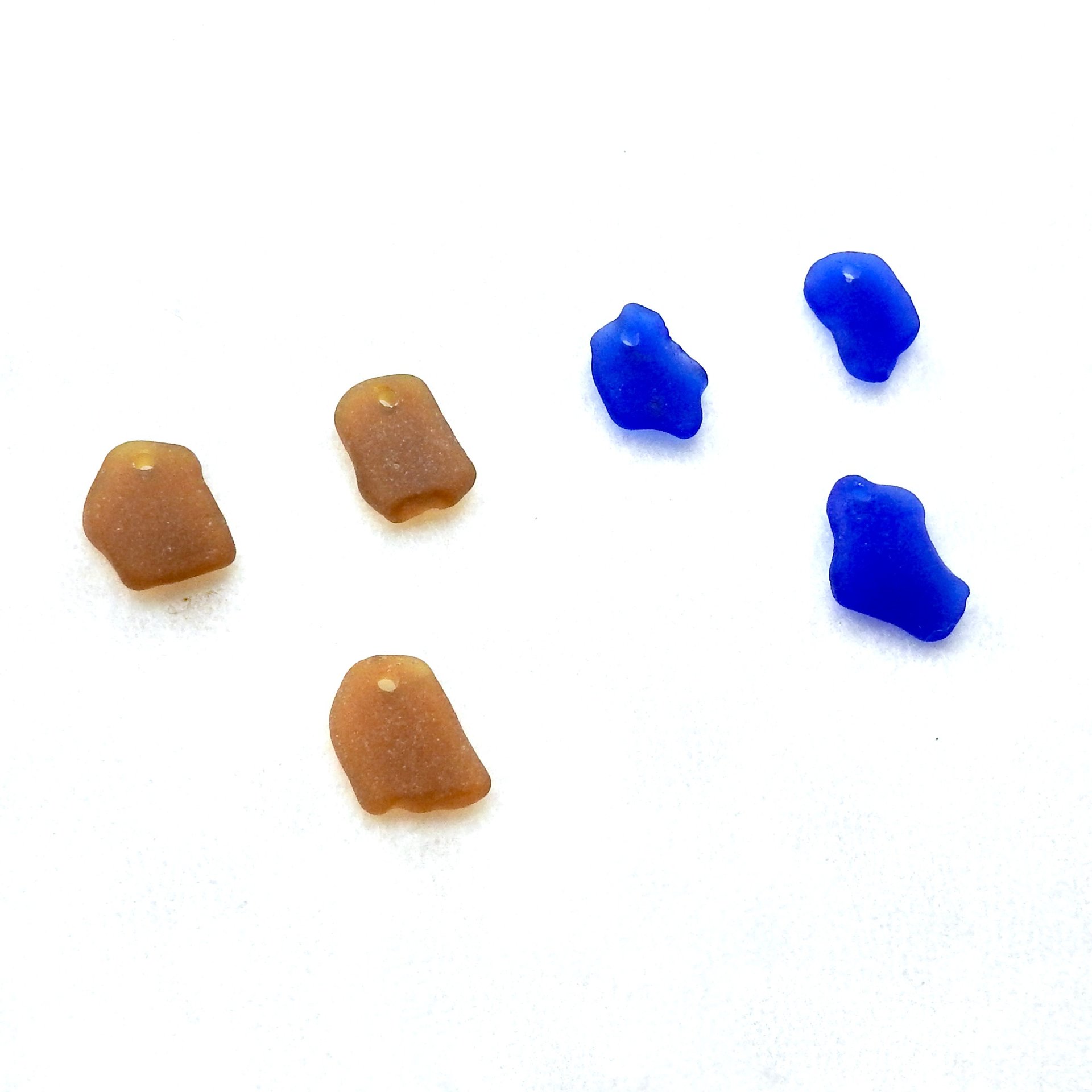 Two sets of drilled sea glass charms for necklace and earring making (6 pieces) in cobalt blue and light brown with top drilled holes.