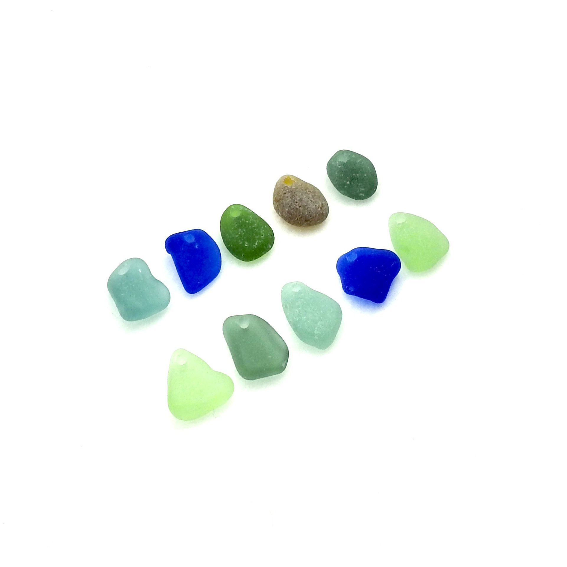 Genuine sea glass charms, set of 10, in shades of blue, green, teal and brown with top drilled holes for jewelry making or other beach themed crafts.