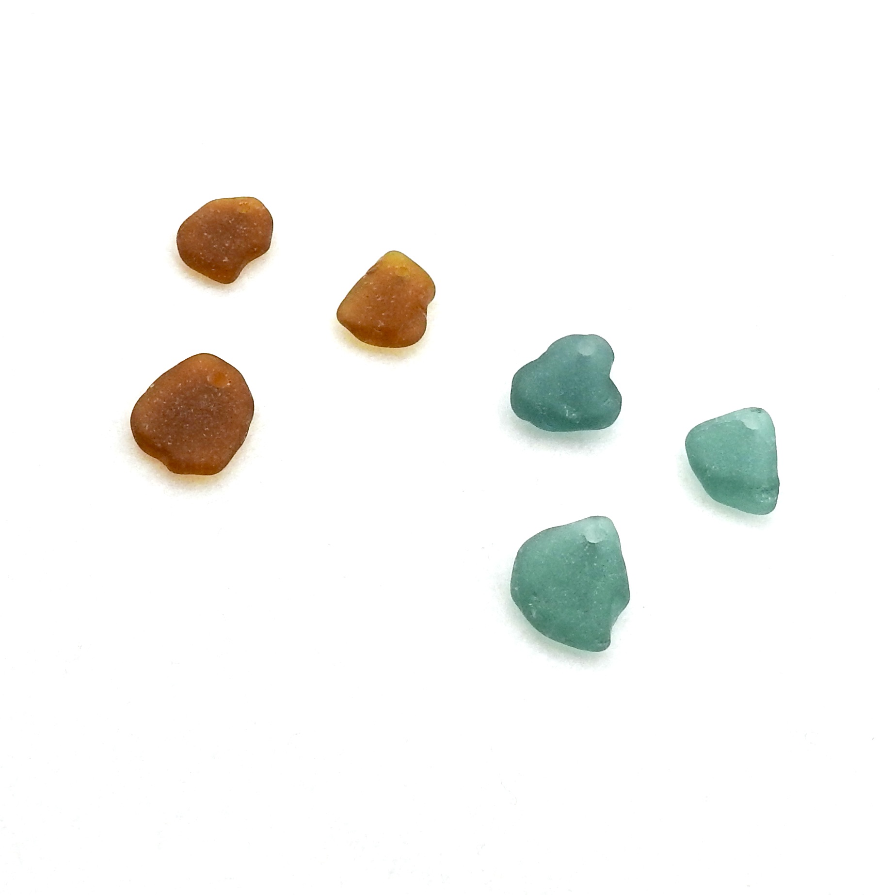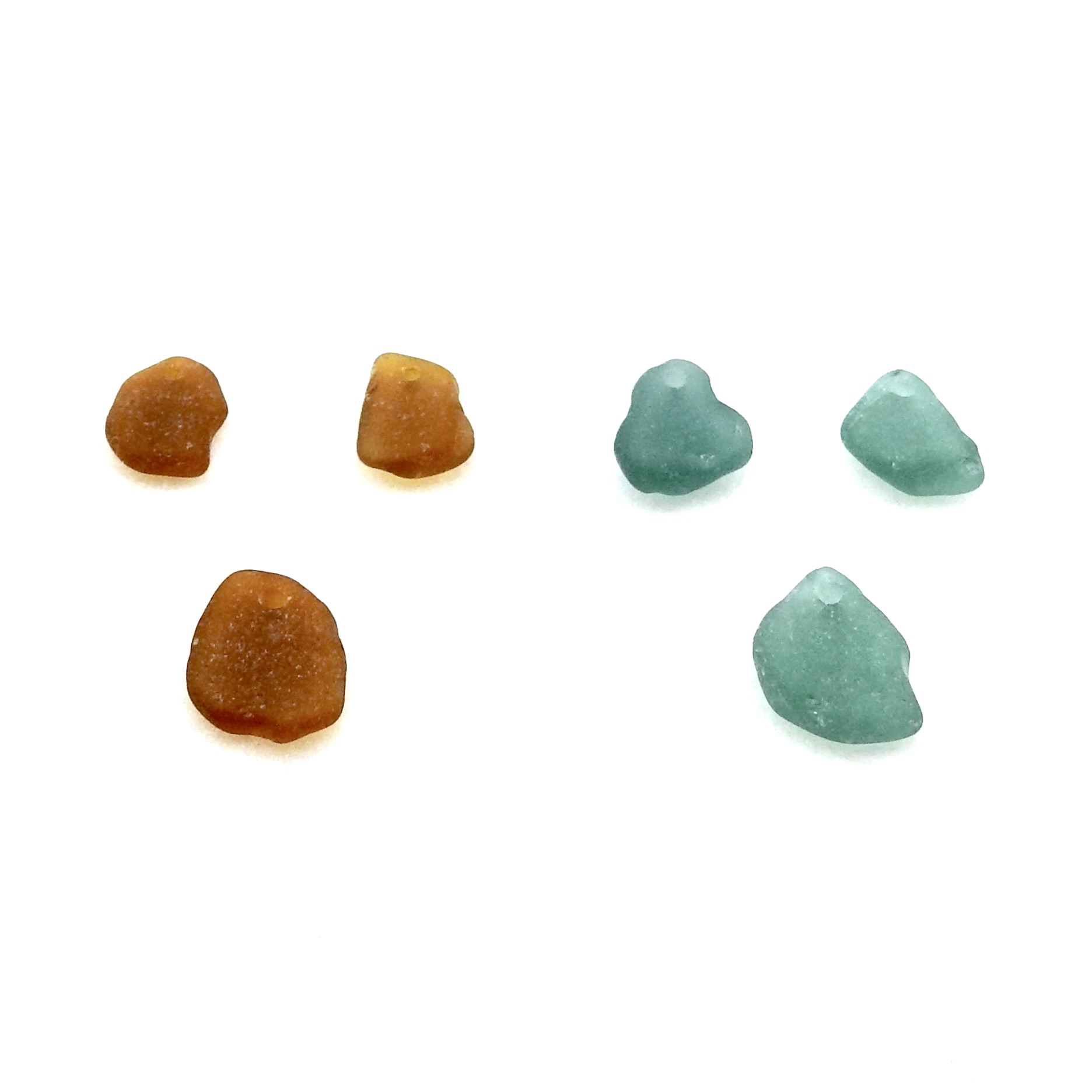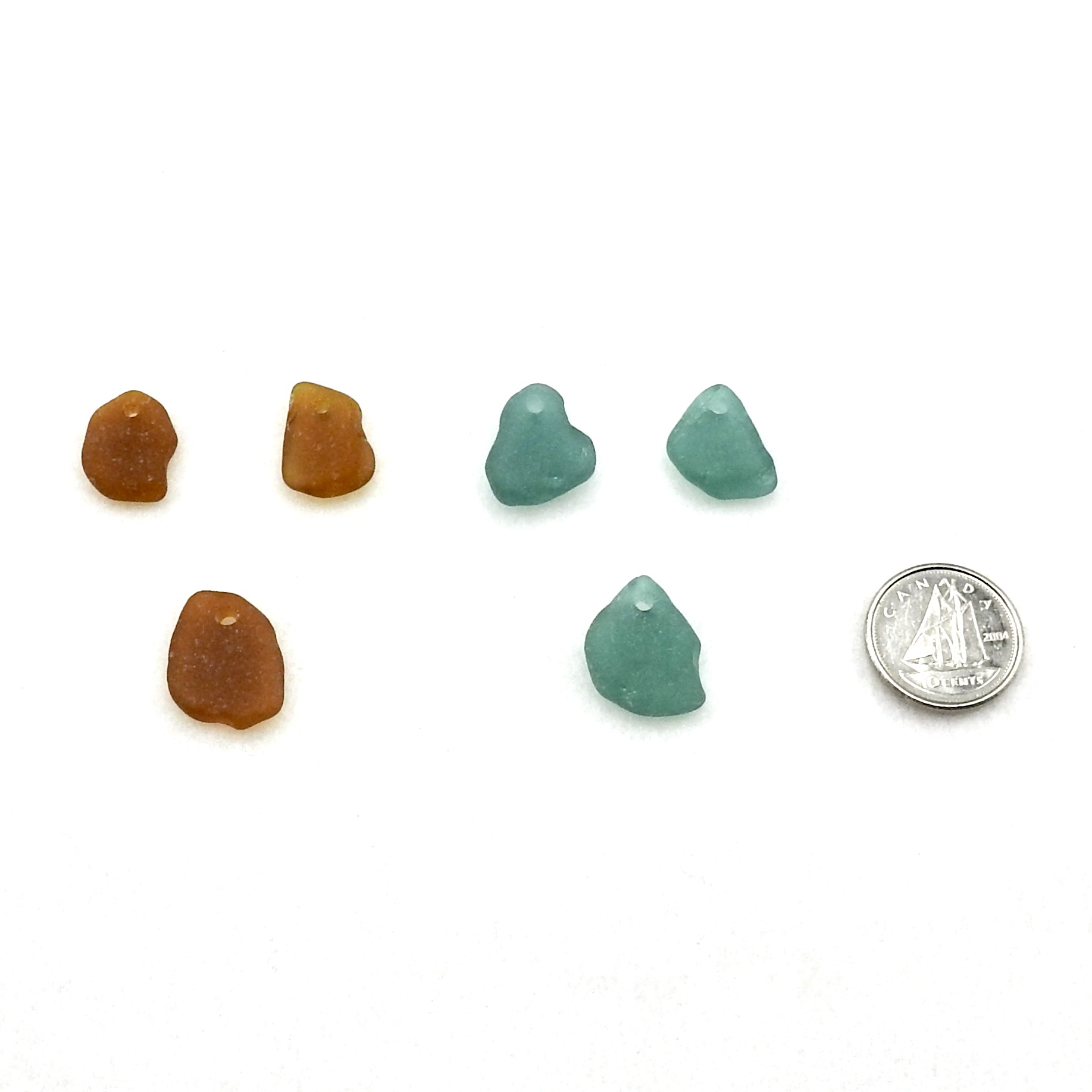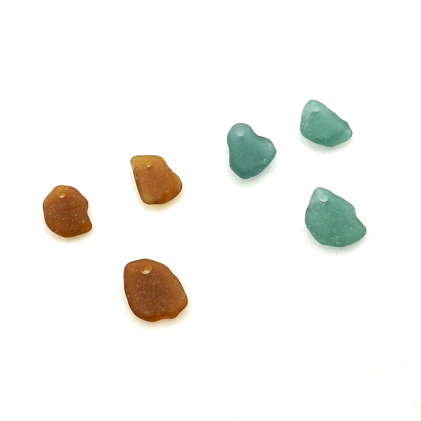 This listing includes two sets of charms and pendants for necklace and earring making (6 pieces) of genuine sea glass with top drilled holes in the colours of amber brown and teal.