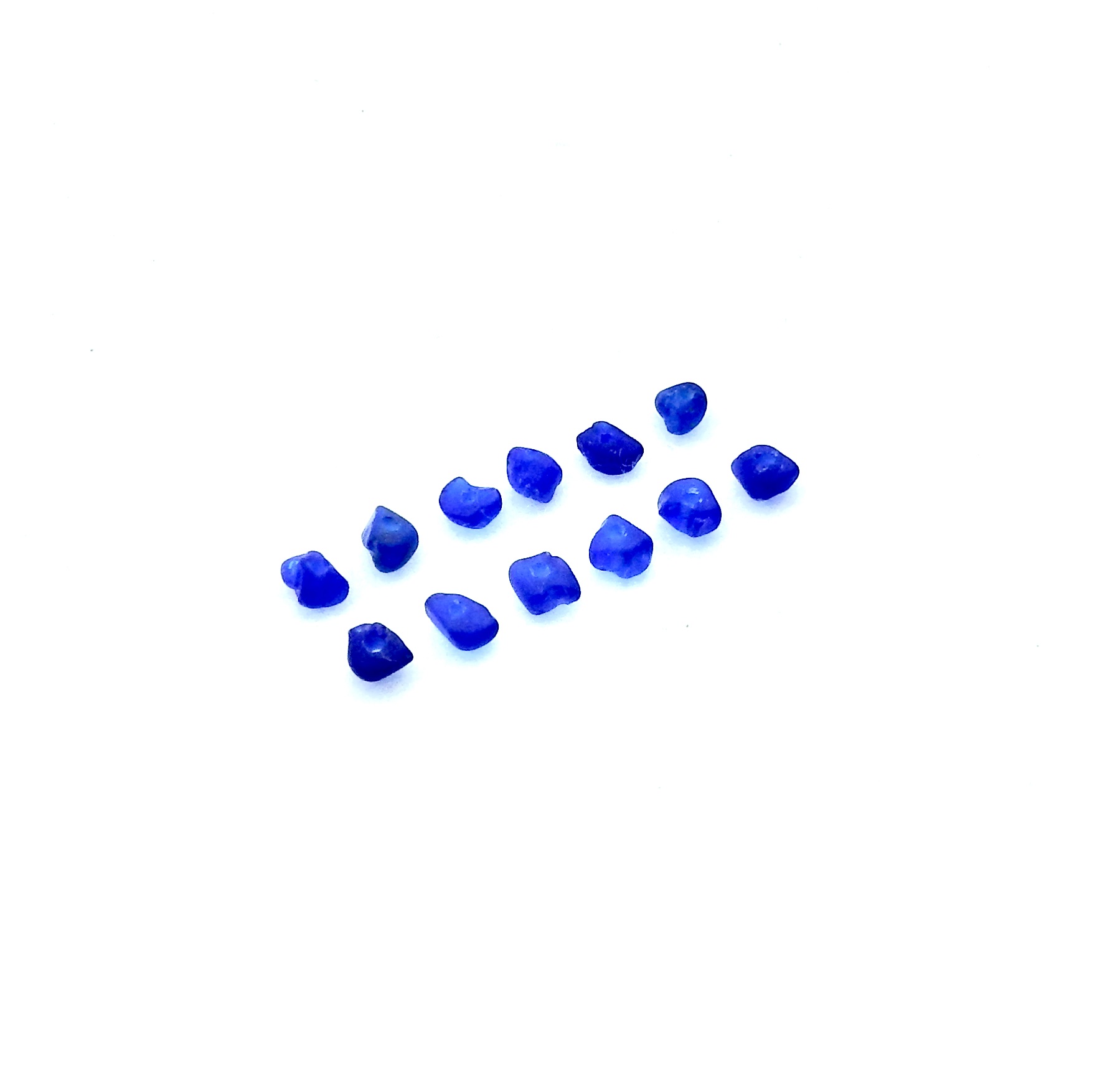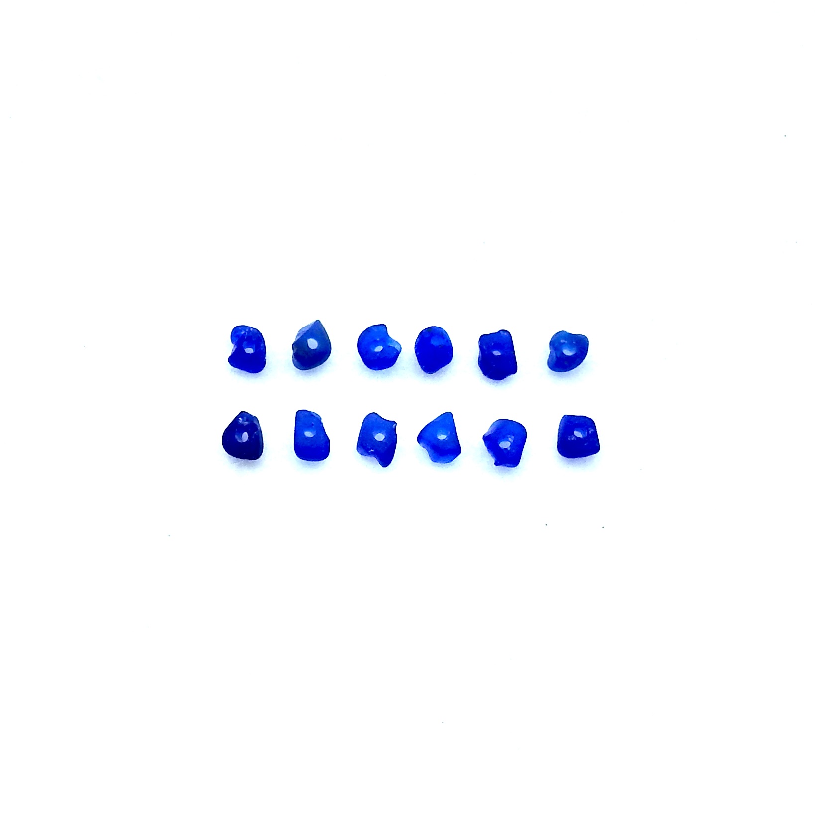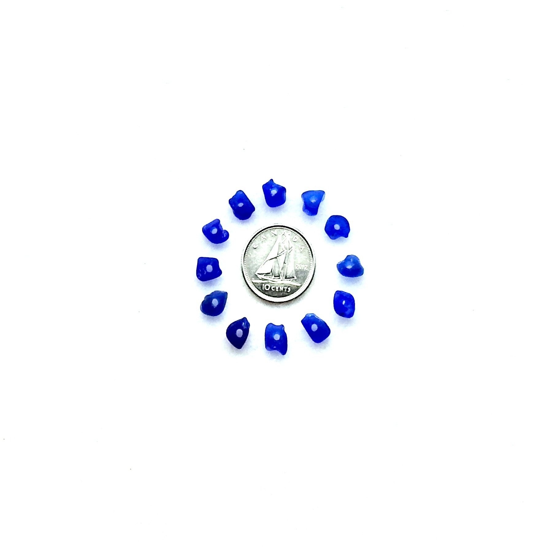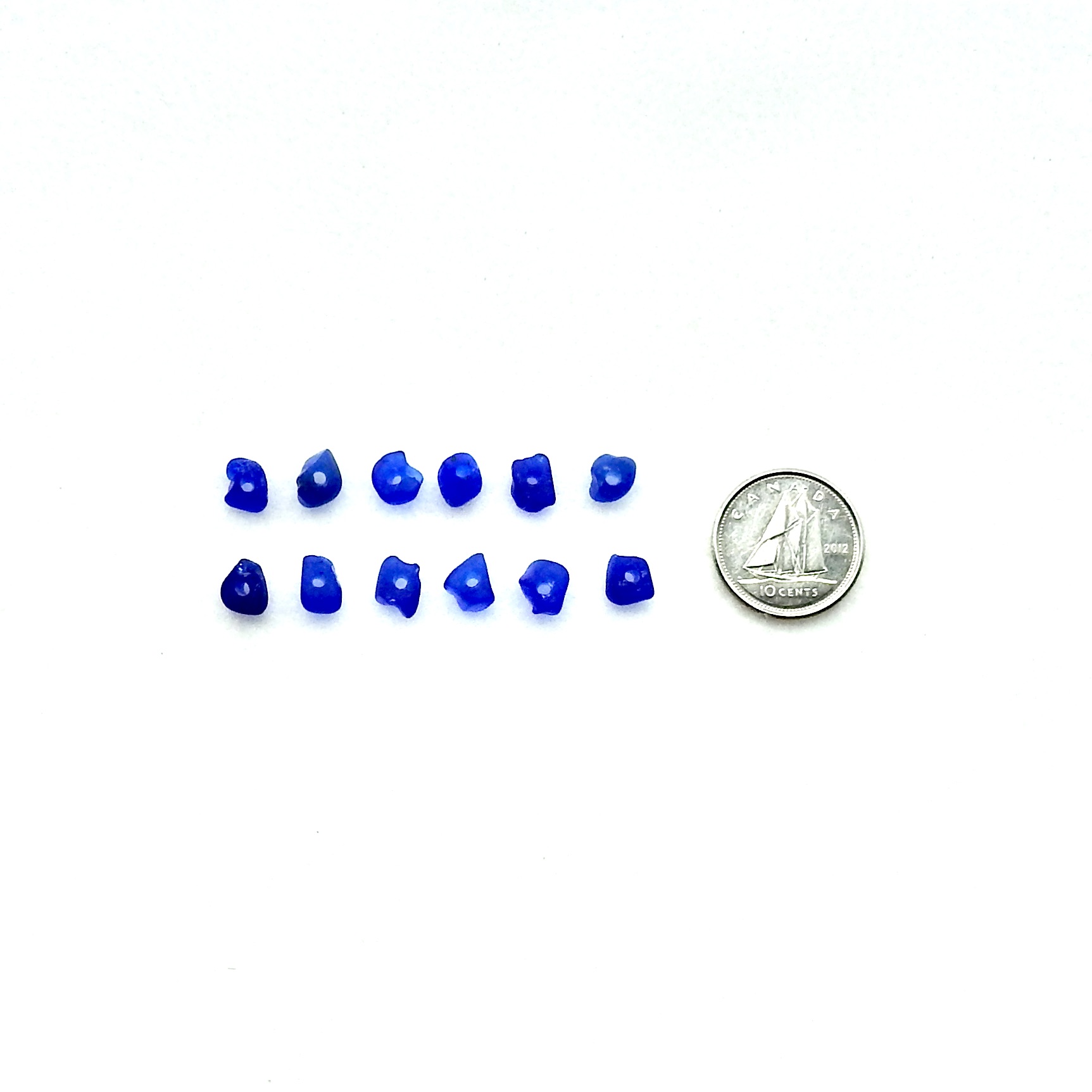 Tiny sea glass beads, set of 12, in shades of cobalt blue with center drilled holes for jewelry making or other beach themed crafts.