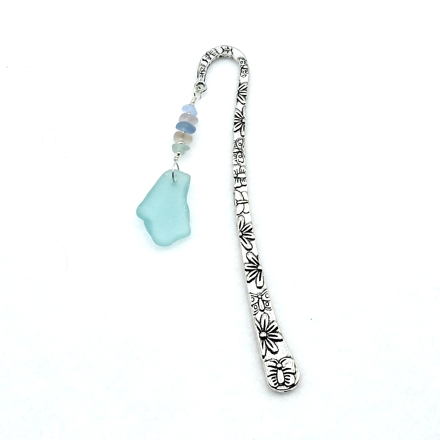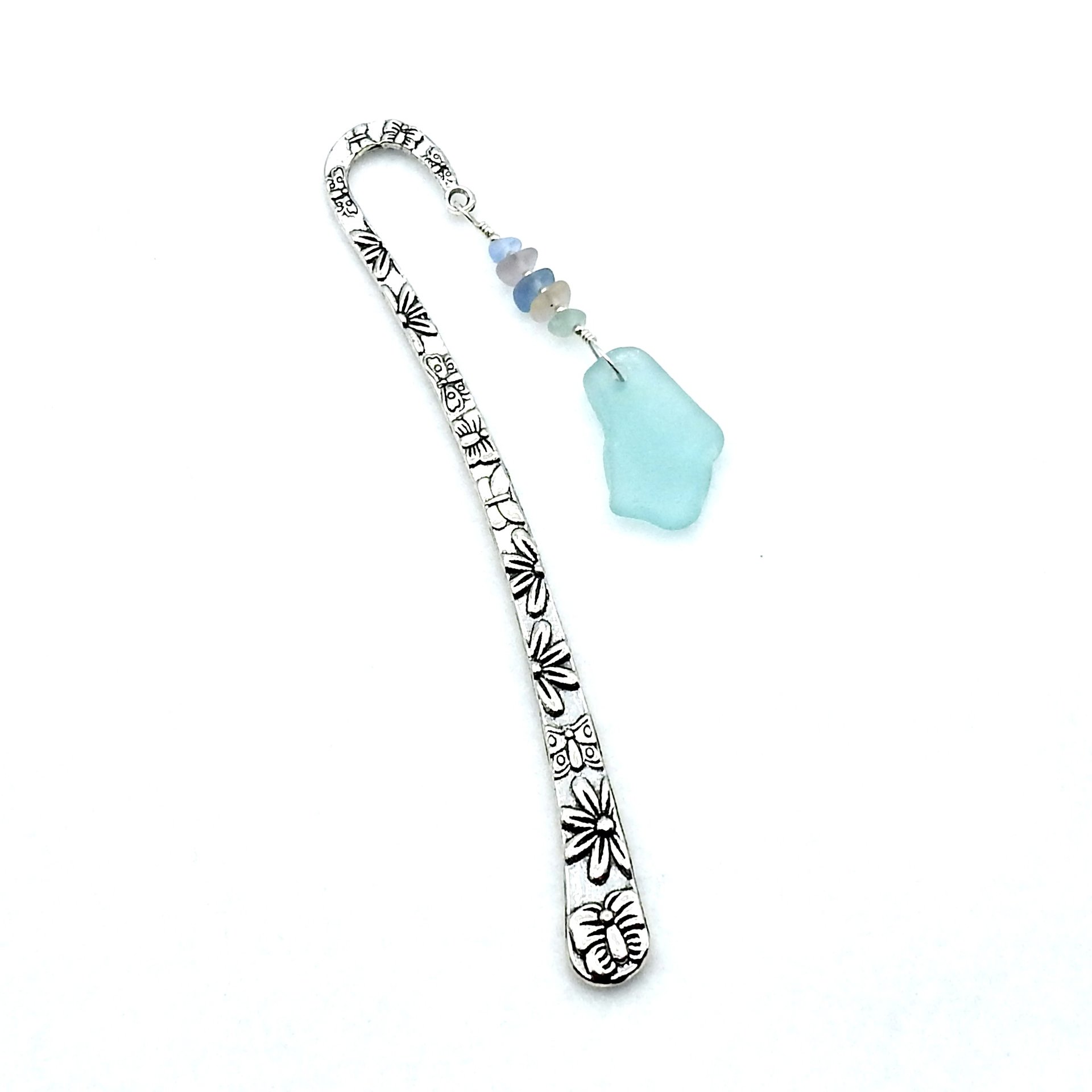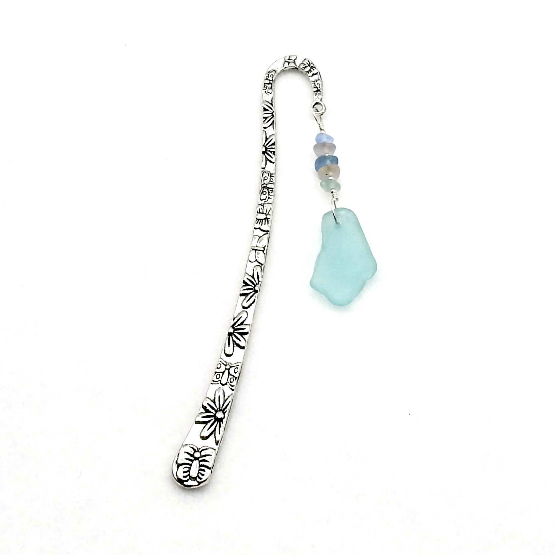 A silver metal hook bookmark with butterflies and flowers, handmade with genuine sea glass pieces in soft pastel colours with a light aqua blue pendant.