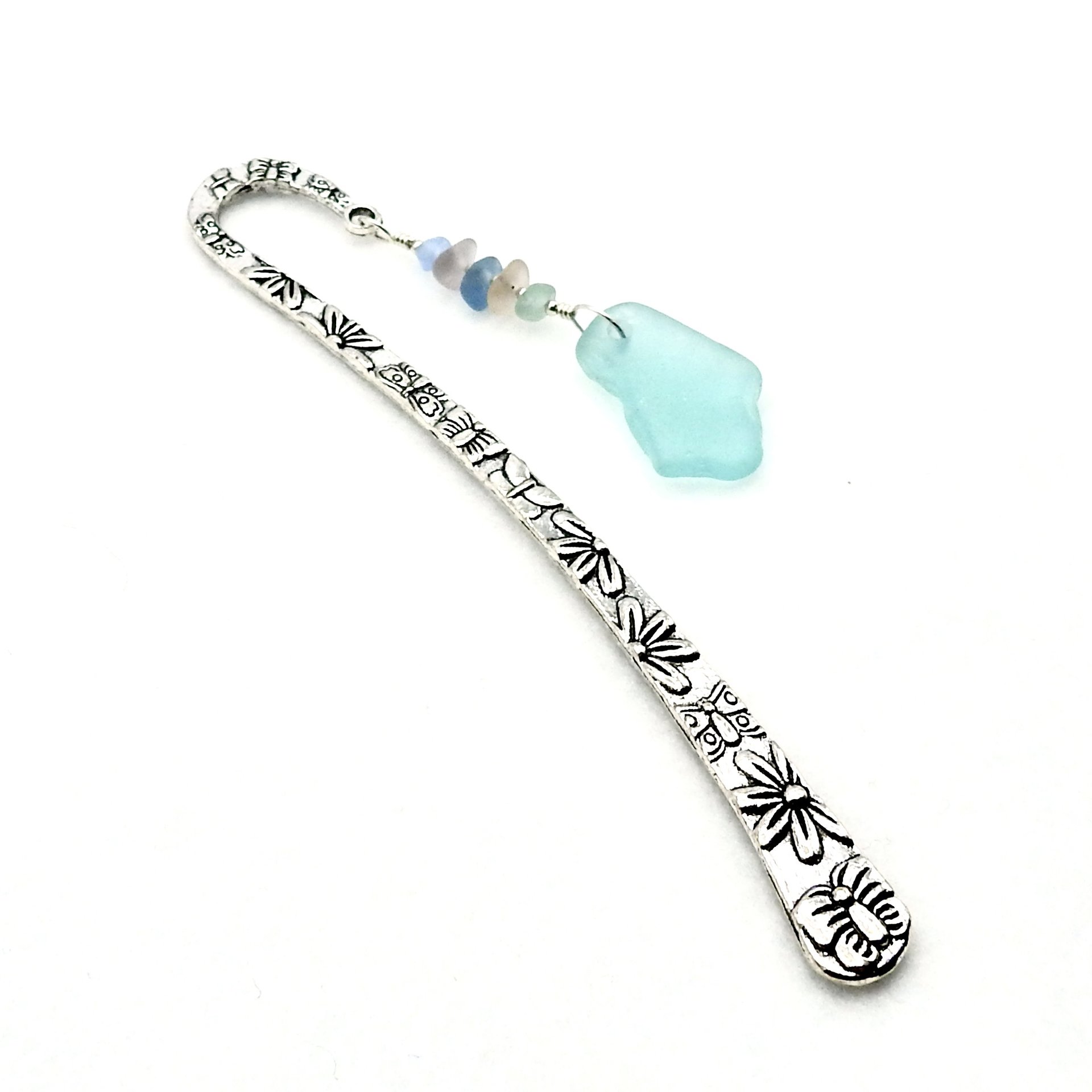 - materials - genuine sea glass, sterling silver wire and round beads, silver plated metal bookmark